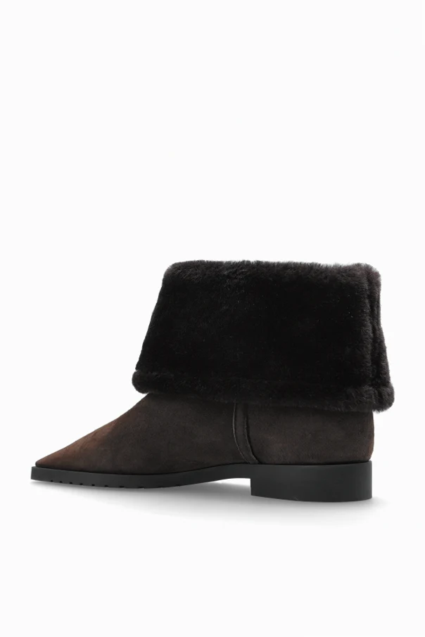 Discover refined sophistication with these brown suede ankle boots by TOTEME. Expertly crafted from sumptuous lambskin suede, each pair exudes a dignified, matte elegance highlighted by the natural richness of its texture. The upper rises above the ankle and is adorned with a wide, luxuriously soft fur trim that gently folds outward, lending a unique, indulgent accent.