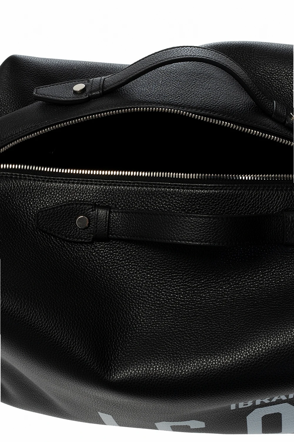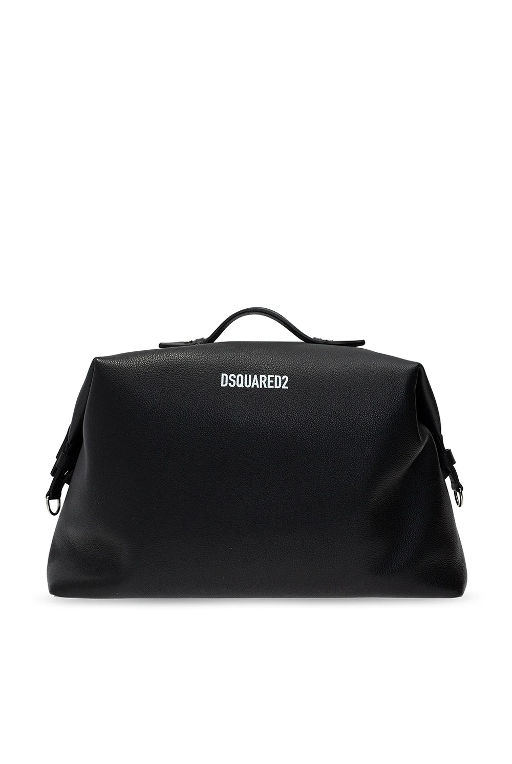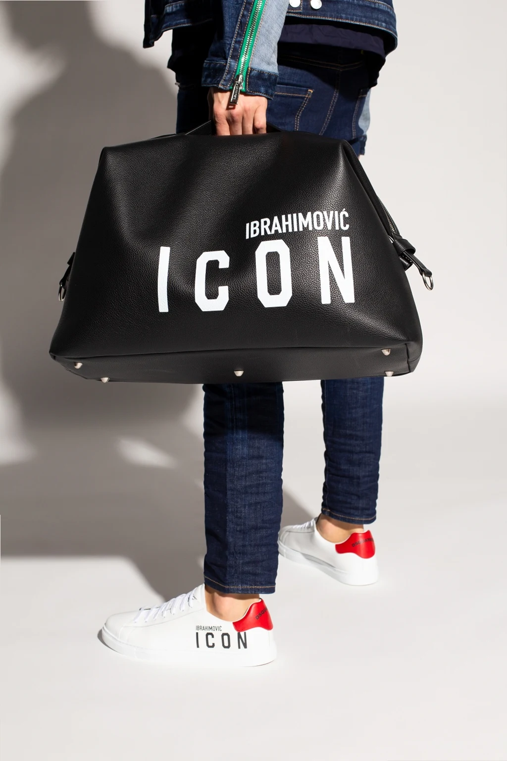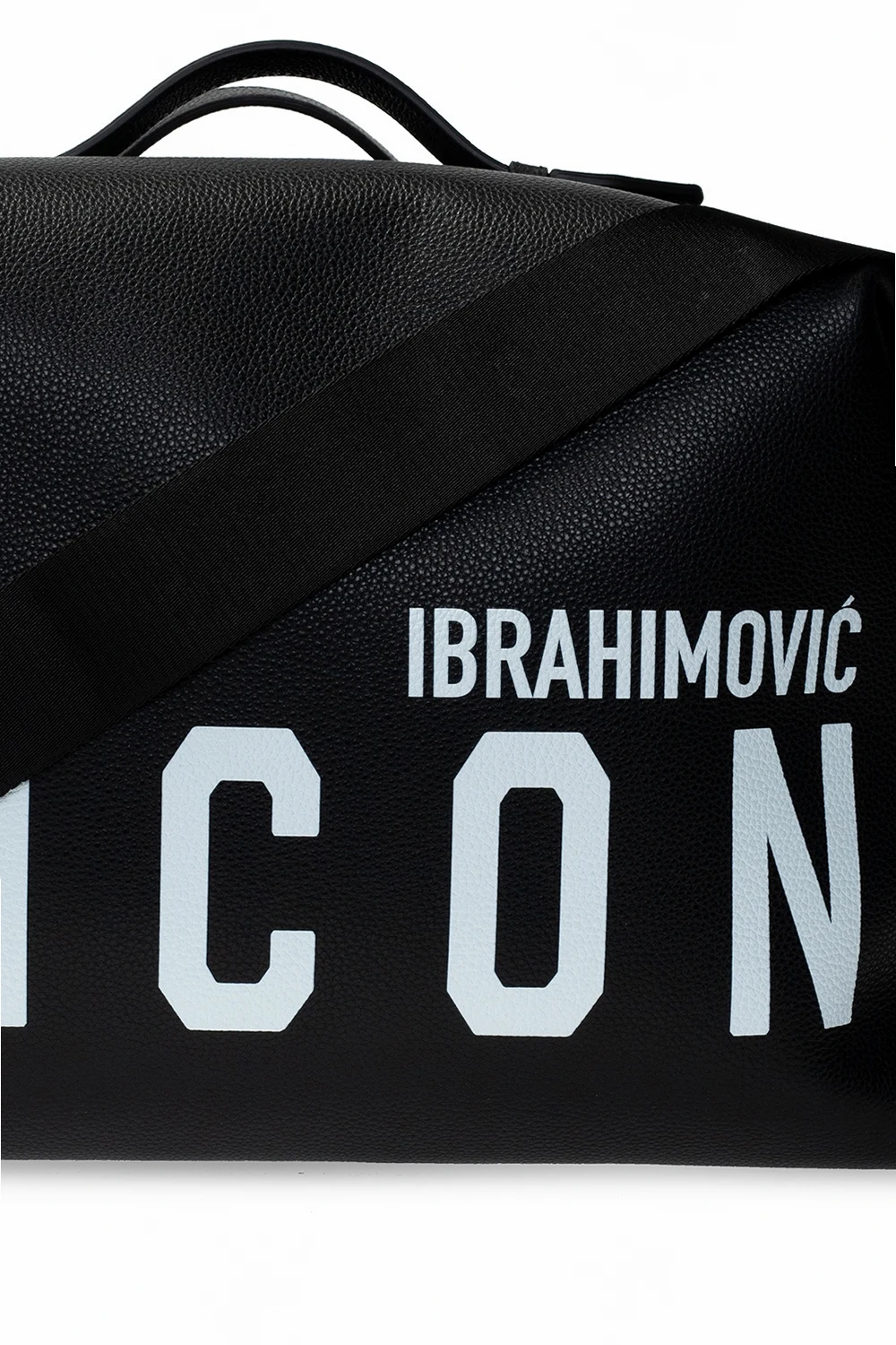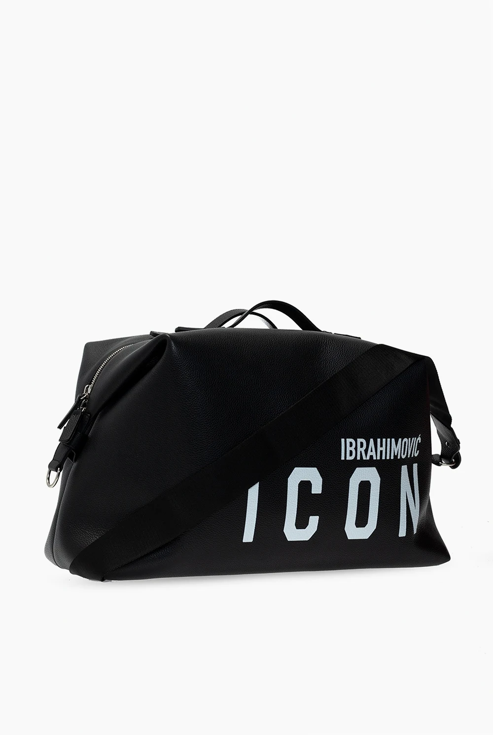 Black duffel bag from Dsquared2, the ‘ICON lbrahimović X Dsquared2’ collection. Printed with the brand's logo in white, this leather-crafted design secures with a two-way zip and features two half-round handles, a detachable and adjustable shoulder strap, silver-tone metal hardware and one internal compartment with two slip pockets. The capsule collection was created in collaboration with the Swedish football player Zlatan Ibrahimović.