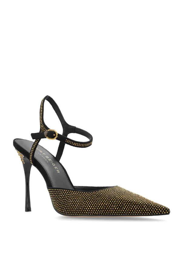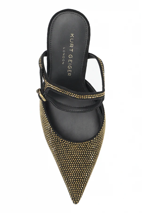 Step into refined sophistication with the Mayfair high-heeled shoes by Kurt Geiger . These stunning stilettos captivate instantly with a dramatically elongated, pointed toe that amplifies elegance and visually lengthens the foot. The sleek black upper—crafted from exquisite suede-like or textured textile—is adorned throughout with glimmering gold crystals, reflecting light for a striking and luxurious effect.