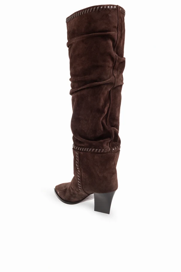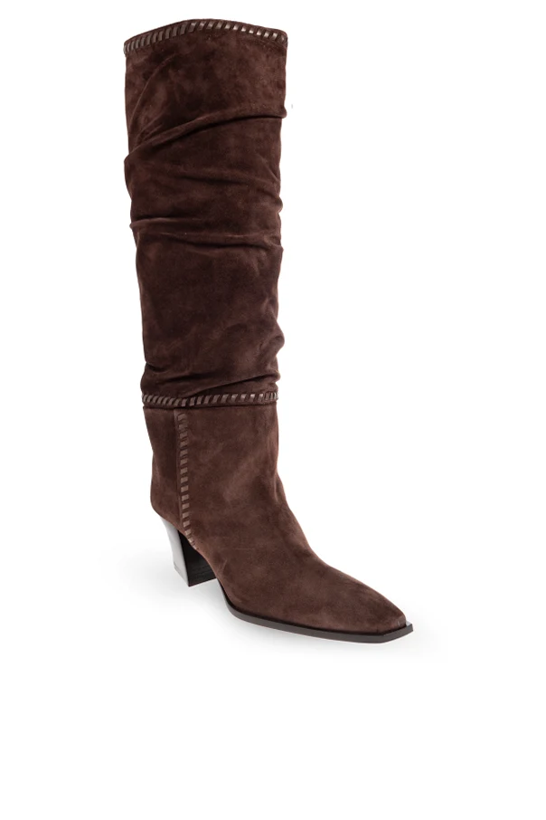 Indulge in the epitome of sophistication with the Jimmy Choo “Harst Stitch” knee-high boots in a sumptuous, deep brown hue. Crafted from the finest suede, these boots are exquisitely soft to the touch, lending a luxurious and timeless presence to any ensemble. The distinctive, gently ruched shaft creates a relaxed yet refined silhouette, complemented by a sharply pointed toe and a bold, geometric block heel for a statement of confident modernity.