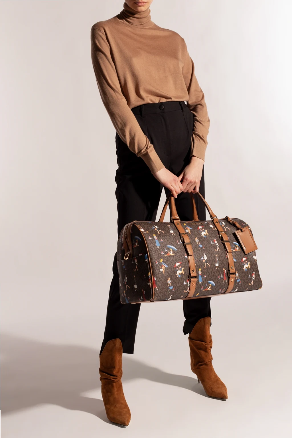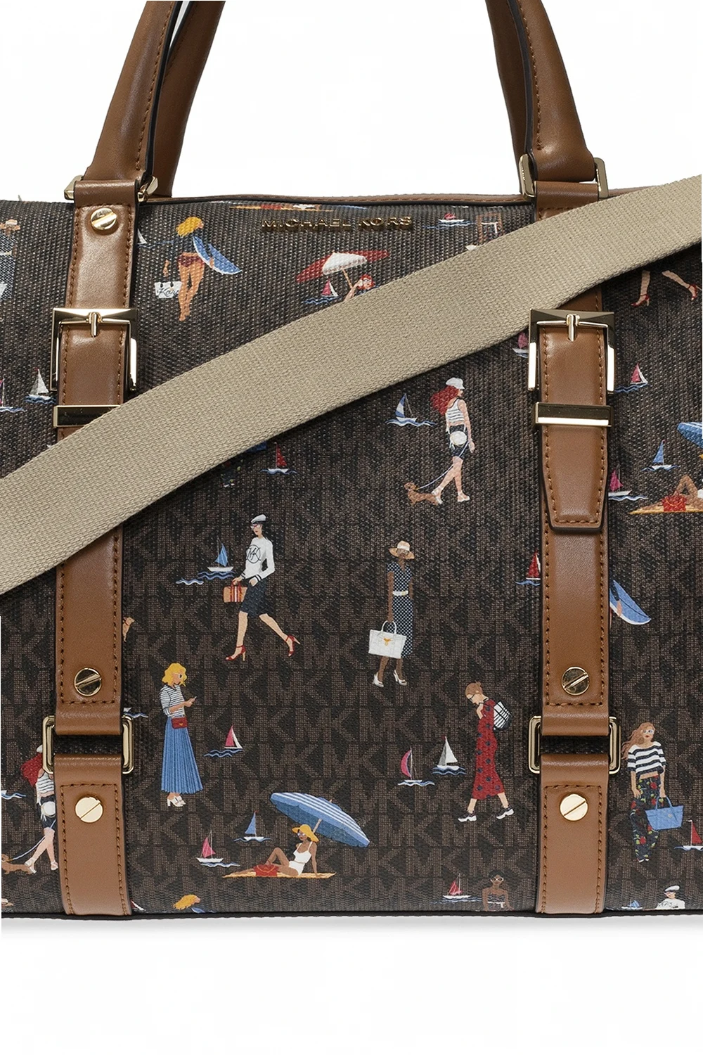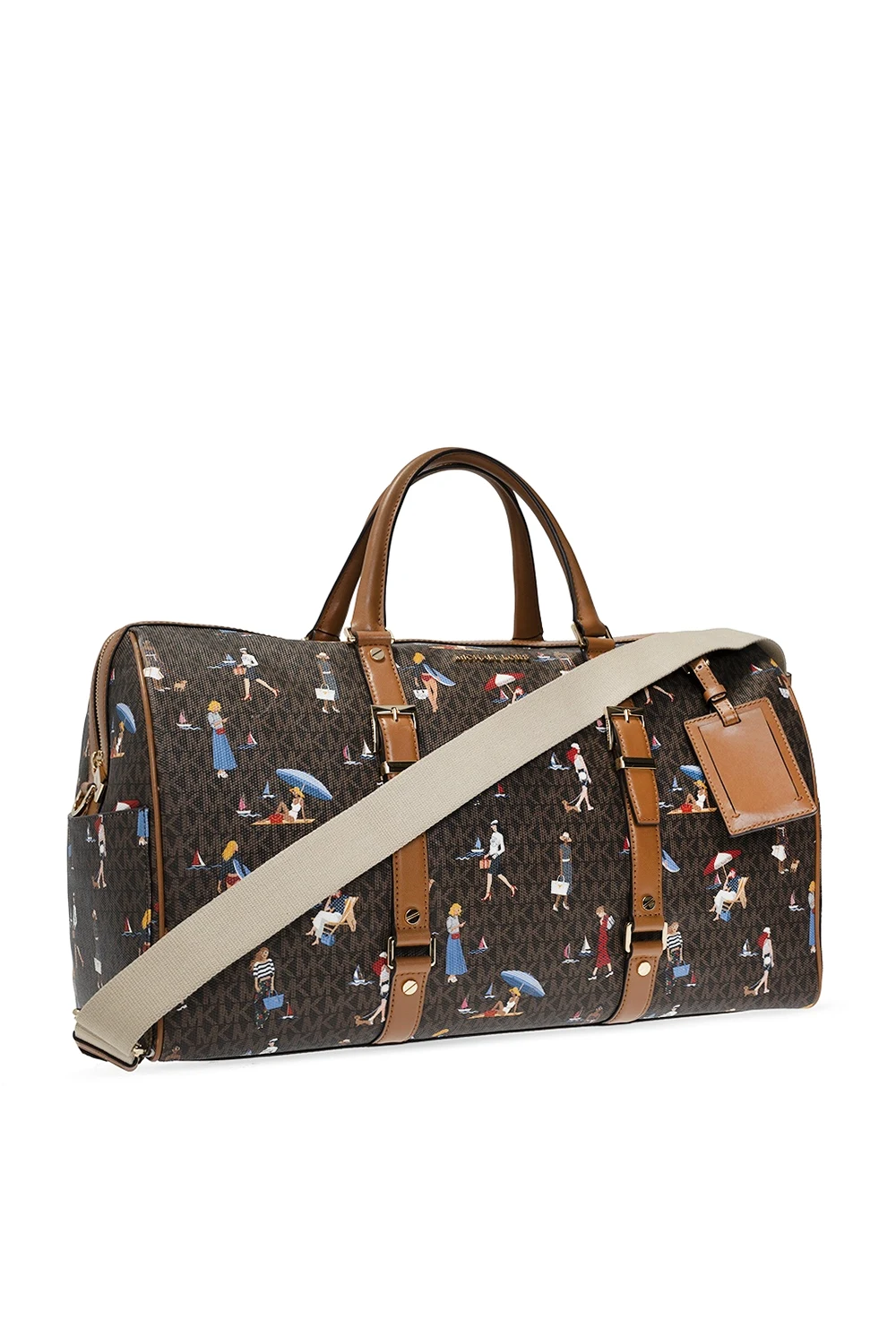 Brown weekender bag from Michael Michael Kors. Crafted from leather with leather trims, this design fastens via a two-way zip and features a colourful graphic print, a metal logo plaque, a pocket with magnetic closure on the back, snap-fastened pockets on the sides, two half-round handles, gold-tone metal hardware and one internal compartment with one zipped pocket and numerous slip pockets.