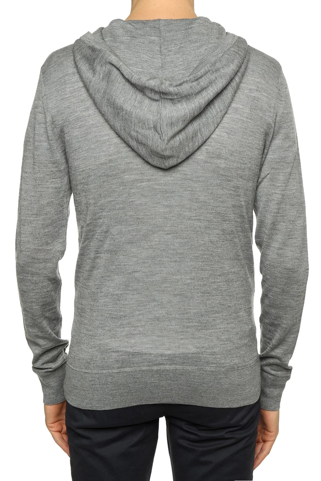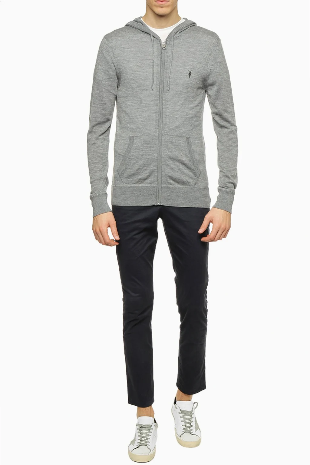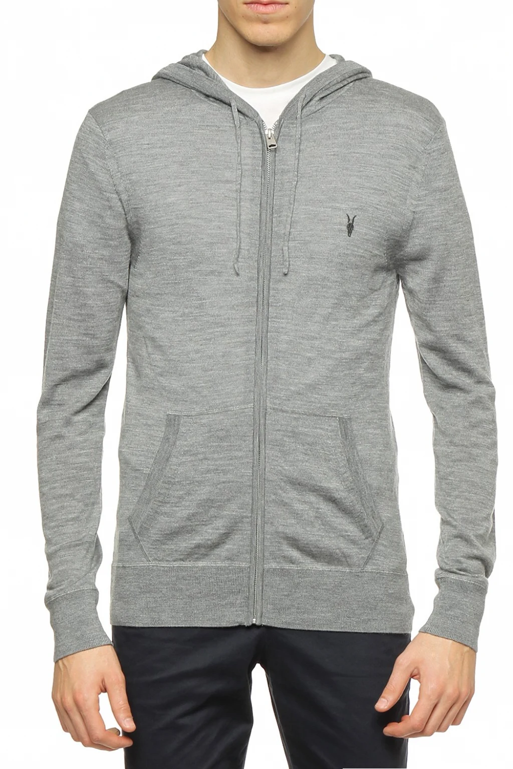 Grey 'Mode' wool sweatshirt from AllSaints. Hood with drawstrings. Zip fastening. 2 slip pockets and embroidered dark grey logo at front. Elasticated hem and cuffs.