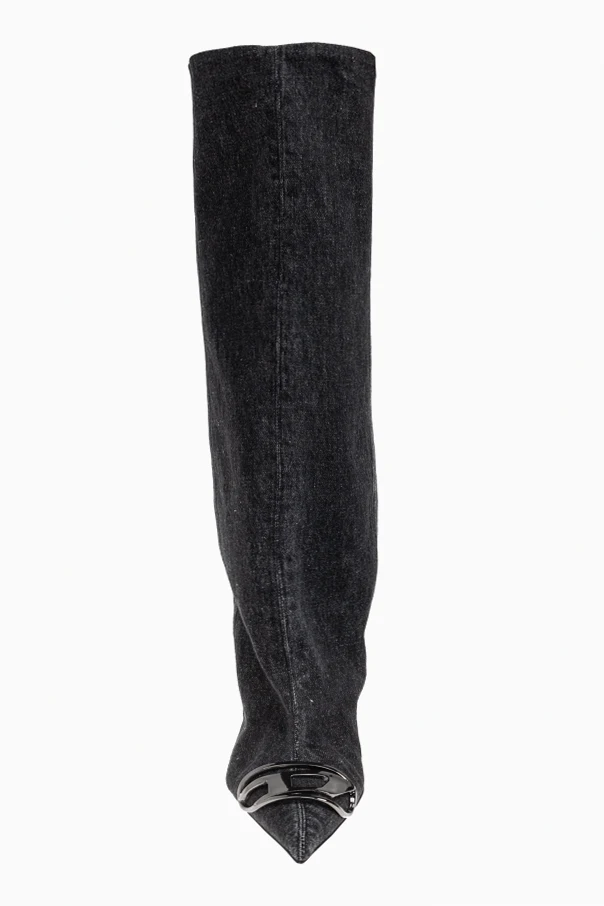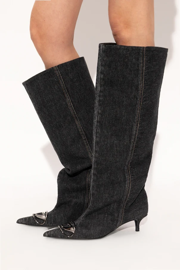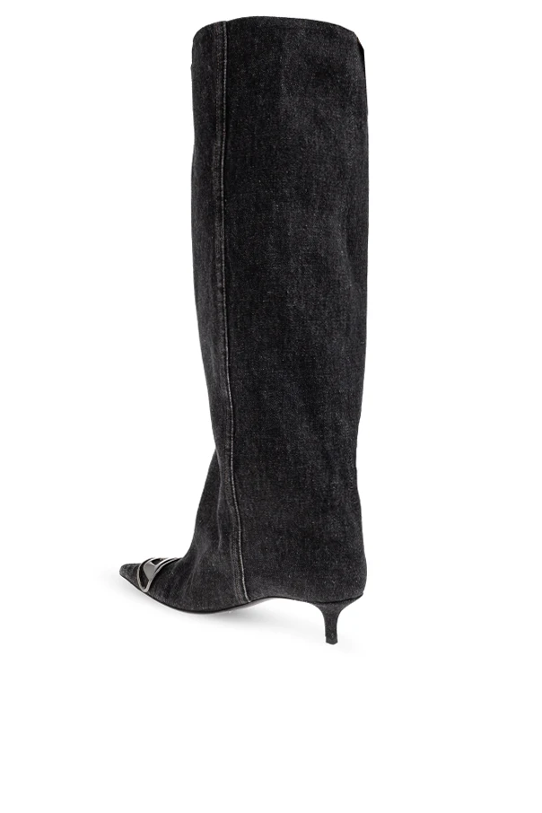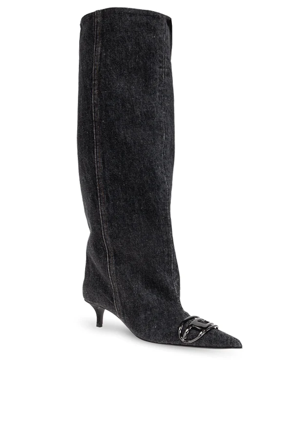Imbued with an audacious urban allure, the D-VENUS knee-high boots by Diesel embody modern sophistication. Crafted from structured black denim with subtly faded accents, these boots elegantly reinterpret the classic slouchy silhouette. The elongated, sharply pointed toe evokes a refined sense of high fashion, while the mid-heel, delicately rounded, gracefully lifts the figure for both comfort and poise.