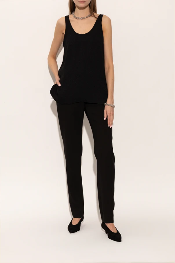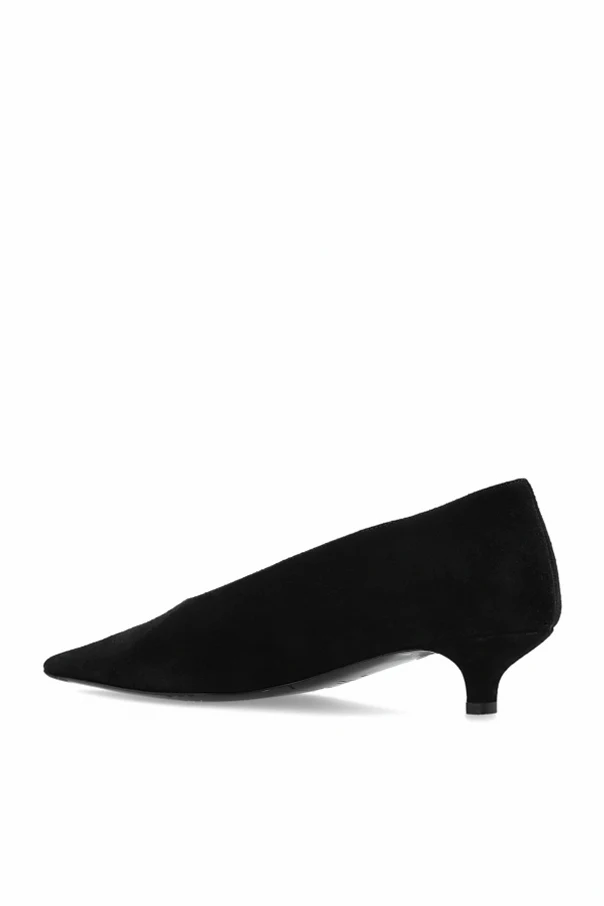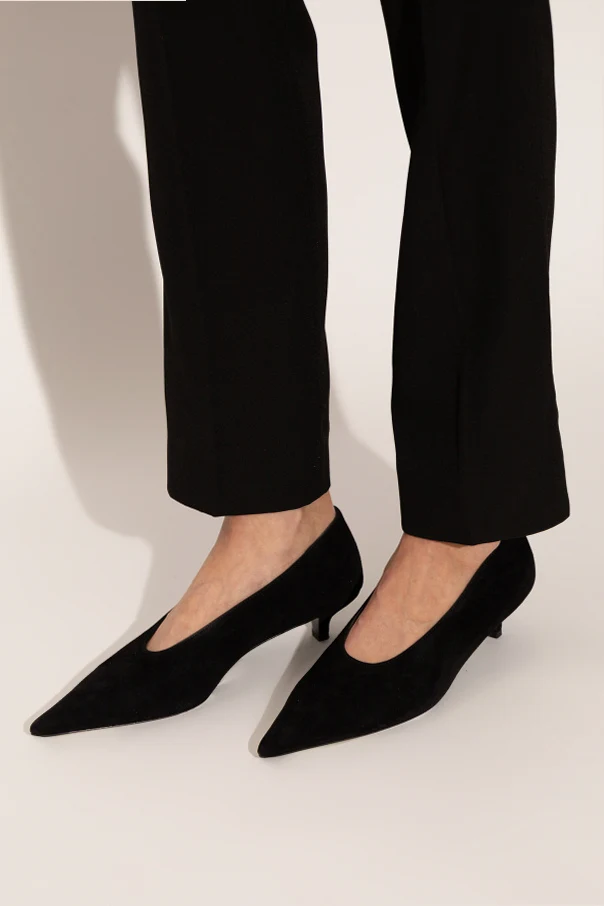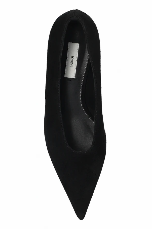 Discover the allure of timeless sophistication with these black suede pumps by TOTEME. Impeccably crafted from supple leather, their refined matte suede surface exudes understated luxury, while the pointed toe silhouette elongates the leg for a graceful finish. The sleek, uninterrupted neckline highlights the pump’s minimalist aesthetic, free from extraneous details or embellishments.