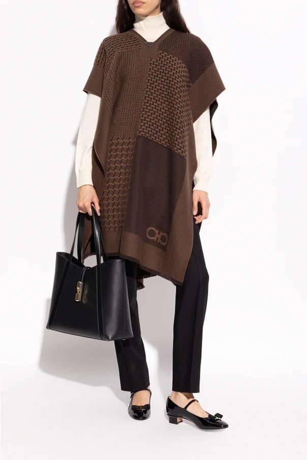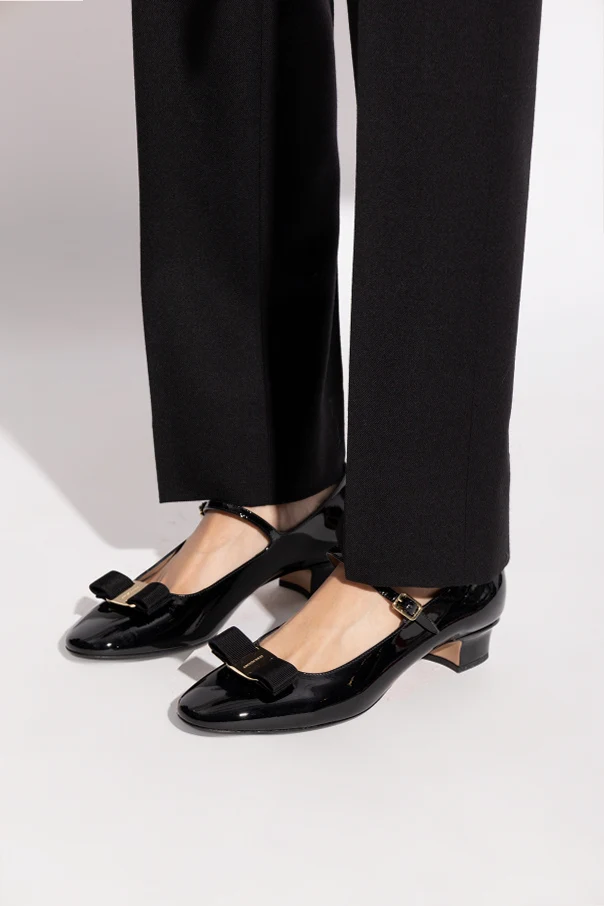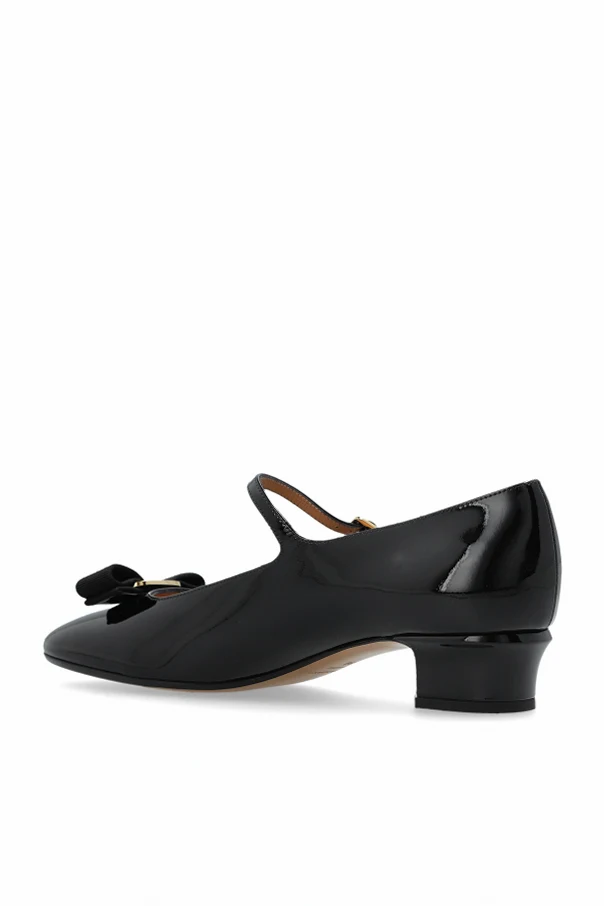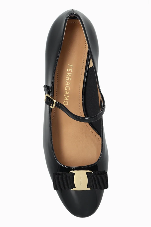 A signature Mary Jane-inspired strap, adorned with a distinguished buckle across the instep, is elevated by a delicate, textured grosgrain bow accented by a striking metallic centerpiece—subtly etched with the designer’s iconic emblem. The interior boasts the prominent “FERRAGAMO” inscription, a subtle touch of exclusivity.