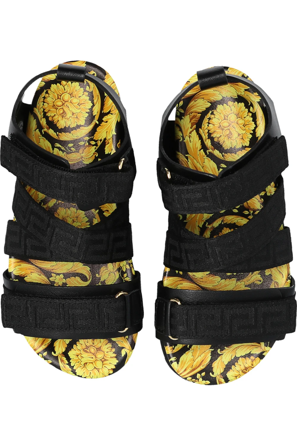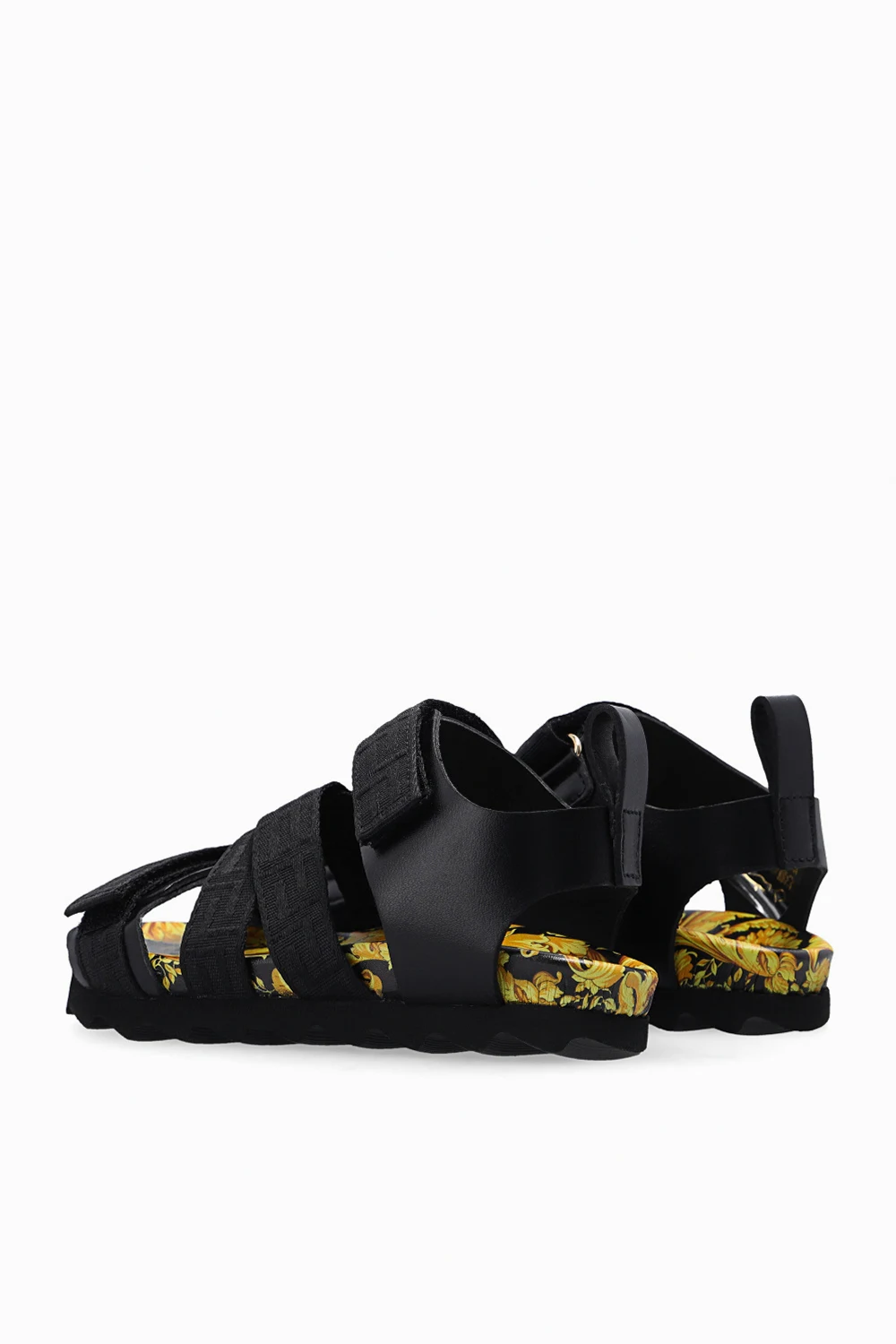 Black sandals from Versace Kid. Made of leather, this model sits on a black rubber sole and showcases velcro closures with the brands ‘Greca’ motif detailing and a yellow and brown ‘Barocco’ lining.