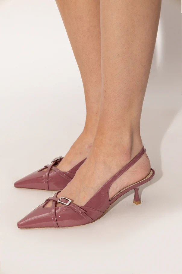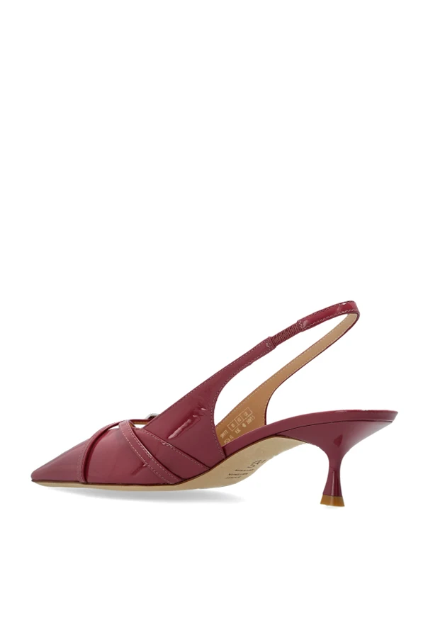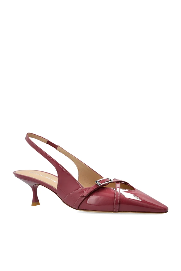 The Georgie Heels by Stuart Weitzman embody sophisticated artistry and timeless allure. Meticulously crafted from lustrous patent leather, their luxuriously glossy finish highlights a classic slingback silhouette with an exquisitely pointed toe. The understated elegance is enhanced by a refined cross-strap adorned with a sleek rectangular metallic buckle, offering an exclusive accent without overt branding.