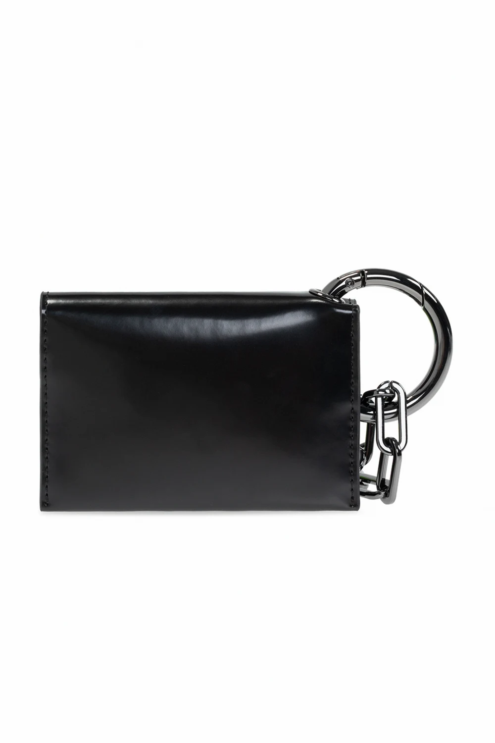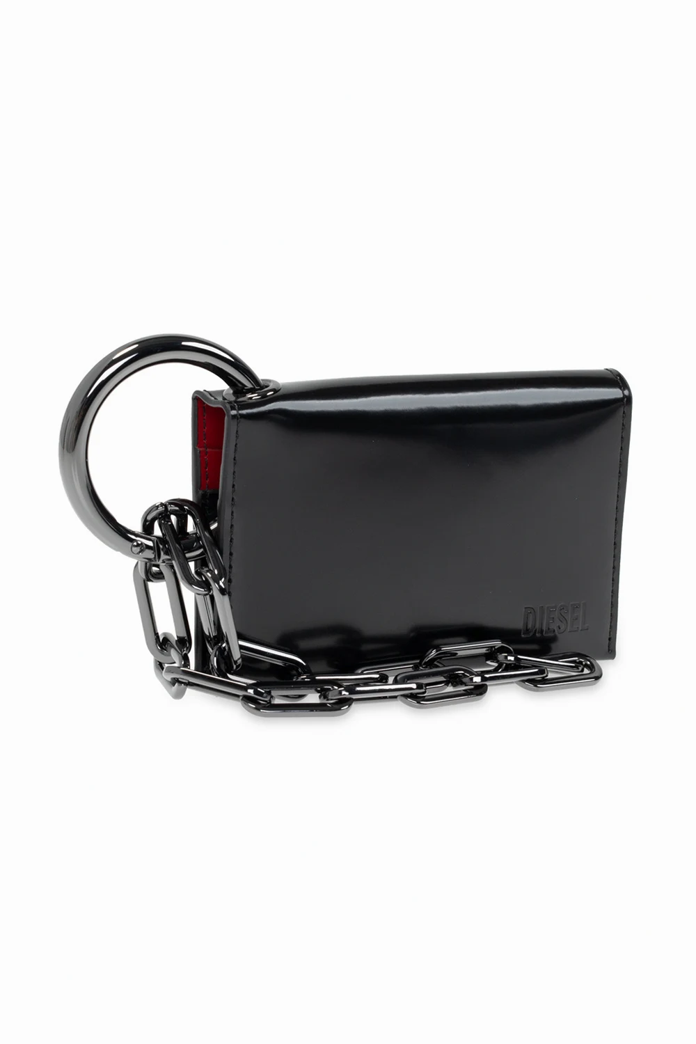 Black bifold card holder from Diesel. Made of leather, this design features an embossed logo, keyring with a chain, red and black lining and six internal card slots.