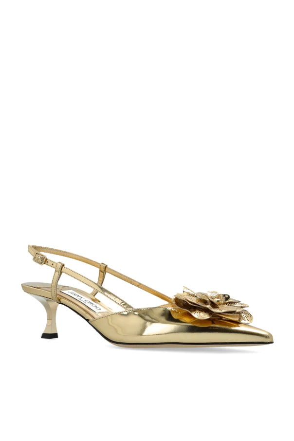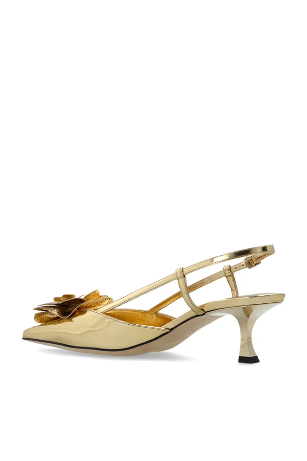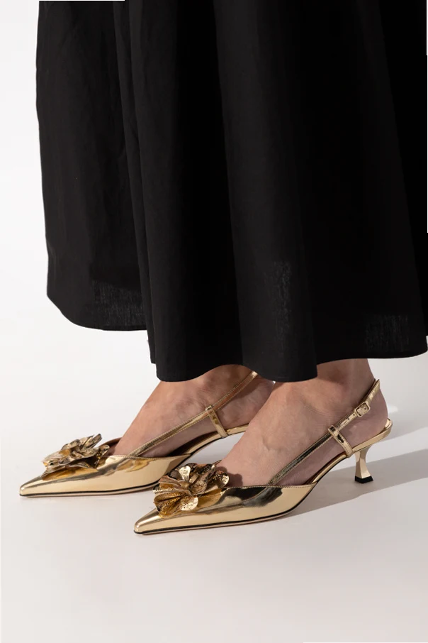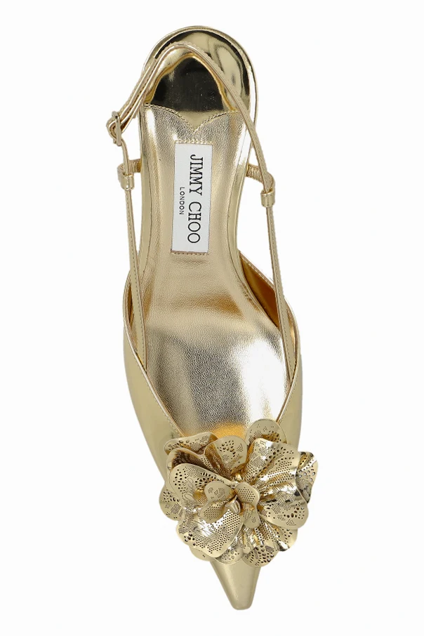 The Mimmi Heels by Jimmy Choo exude understated sophistication, meticulously crafted in radiant gold. These slingback shoes elegantly elongate the silhouette with a pointed toe and a refined kitten heel—imparting effortless grace with every step. Shimmering in highly polished, mirror-finish leather, their minimalist design is accented by a sculptural three-dimensional flower at the front, achieving an exquisite harmony between modern artistry and timeless allure.
