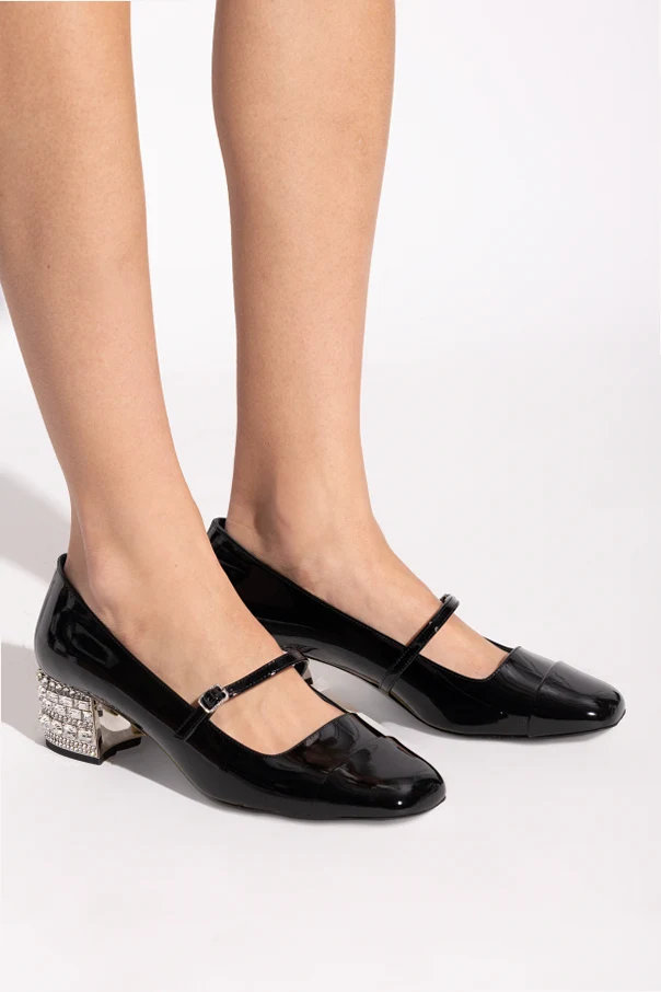 The Elisa Mid-Heel Pumps by Jimmy Choo exude refined sophistication, artfully merging timeless elegance with a captivating contemporary allure. Crafted from high-gloss black patent leather , these pumps present a classic Mary Jane silhouette with a sleek strap and delicate metallic buckle elegantly embracing the instep. The immaculate, smooth finish is punctuated by a subtle seam at the toecap, highlighting their understated luxury.