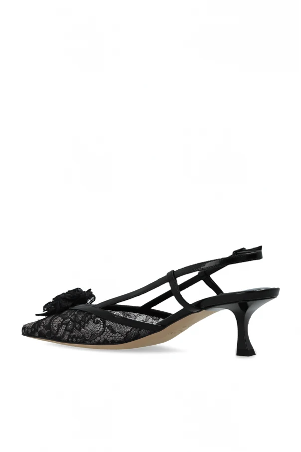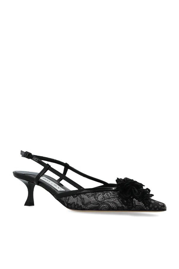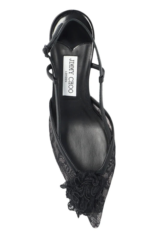 The Mimmi Heeled Shoes by Jimmy Choo epitomize refined luxury, seamlessly blending classic sophistication with modern femininity. These elegant slingback heels captivate with their pointed toe silhouette, delicately adorned in exquisite floral-patterned lace. The refined mid-heel ensures graceful poise and enduring comfort, while the adjustable back strap offers a tailored fit for every occasion.