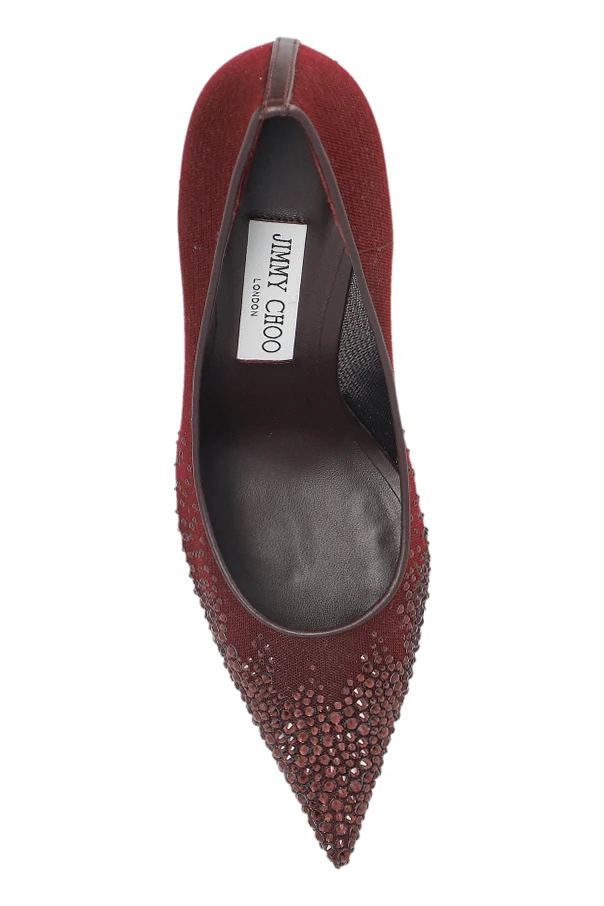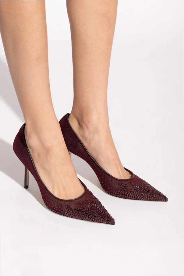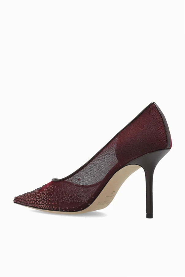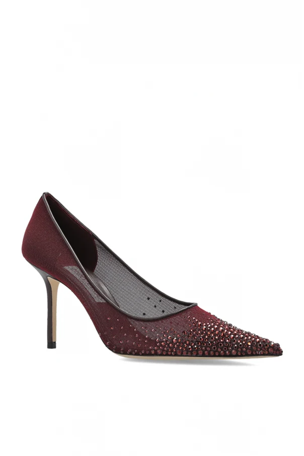 Indulge in the exquisite sophistication of the ‘Love’ high-heel pumps by Jimmy Choo , designed in a sumptuous burgundy hue. These heels captivate with their timeless pointed toe and graceful stiletto, artfully elongating the silhouette. The front and sides are crafted from delicate, transparent mesh, lavishly accented with hand-applied crystals in burgundy and red gradients—infusing each step with a dazzling luminosity. Subtle textile detailing in lustrous burgundy frames the heel and collar, elegantly revealing the foot's contour. A signature designer label graces the pristine leather interior, affirming an enduring sense of exclusivity.
