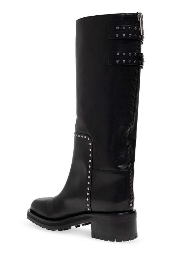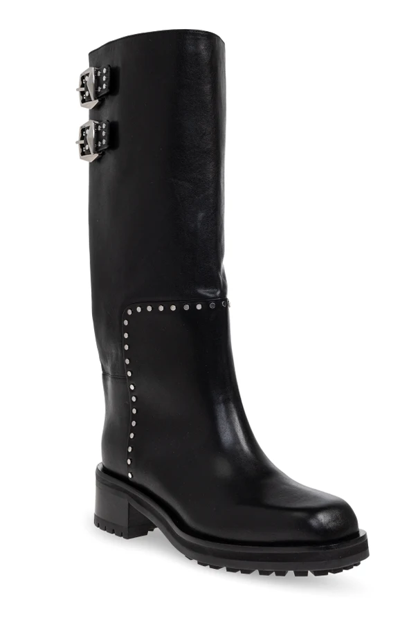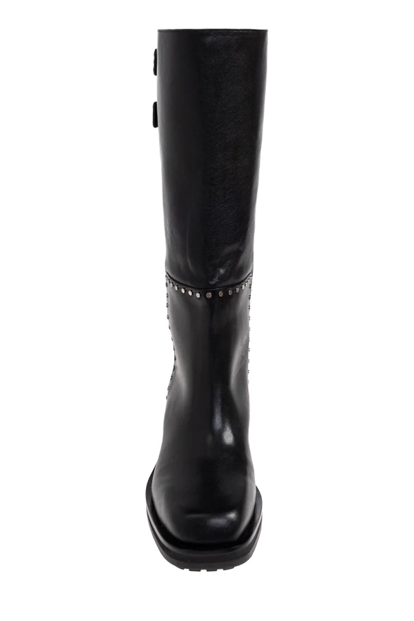 Distinctive silver studs punctuate the sleek seams, with two bold straps adorned with gleaming metallic buckles and decorative studs elegantly framing the upper. The harmonious blend of polished details and premium materials ensures these boots elevate any ensemble with a touch of urban allure.