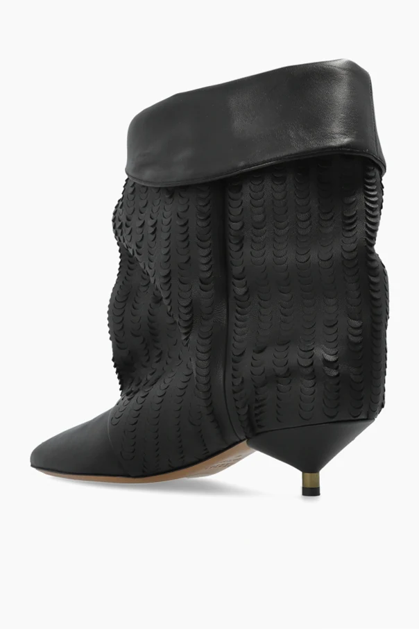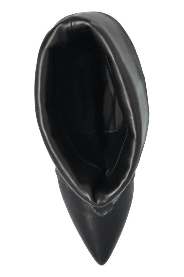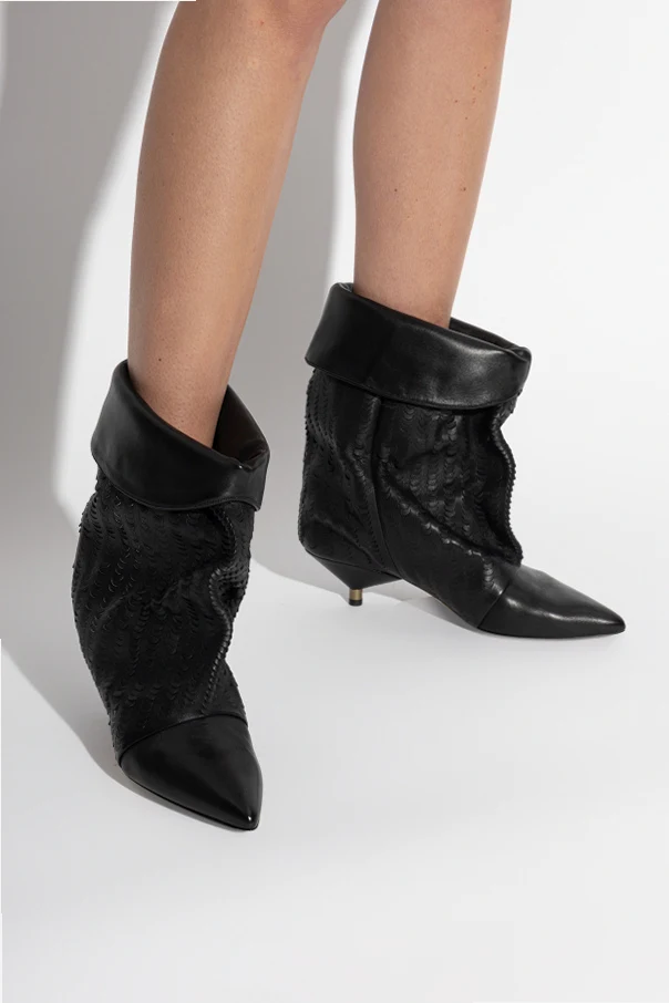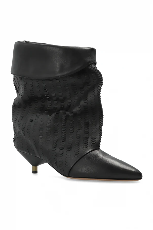 Experience refined sophistication with the Edrik heeled ankle boots by Isabel Marant . Presented in timeless black , this pair harmoniously balances modern artistry and classic elegance. The sharply pointed toe and luxuriously wide, slouchy shaft create a graceful silhouette, punctuated by a smooth, wide cuff meticulously crafted from supple premium leather.