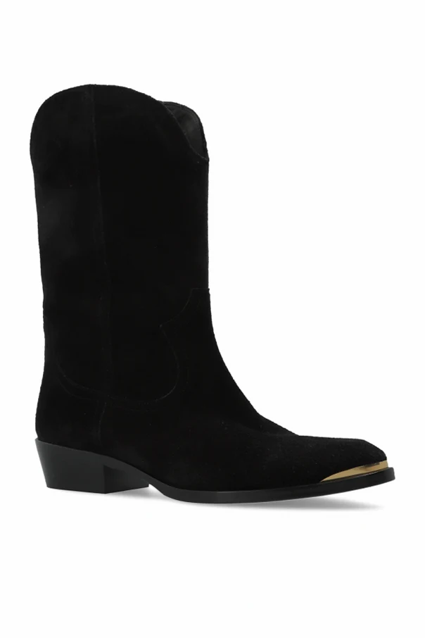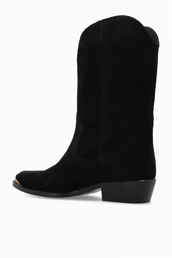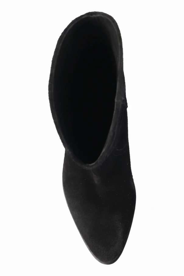 Discover the refined essence of the Elbana heeled ankle boots by Isabel Marant, meticulously crafted in luxurious black suede. Their classic, rounded western-inspired shaft gracefully compliments the subtly elongated almond toe, imparting a timeless silhouette with a contemporary edge.