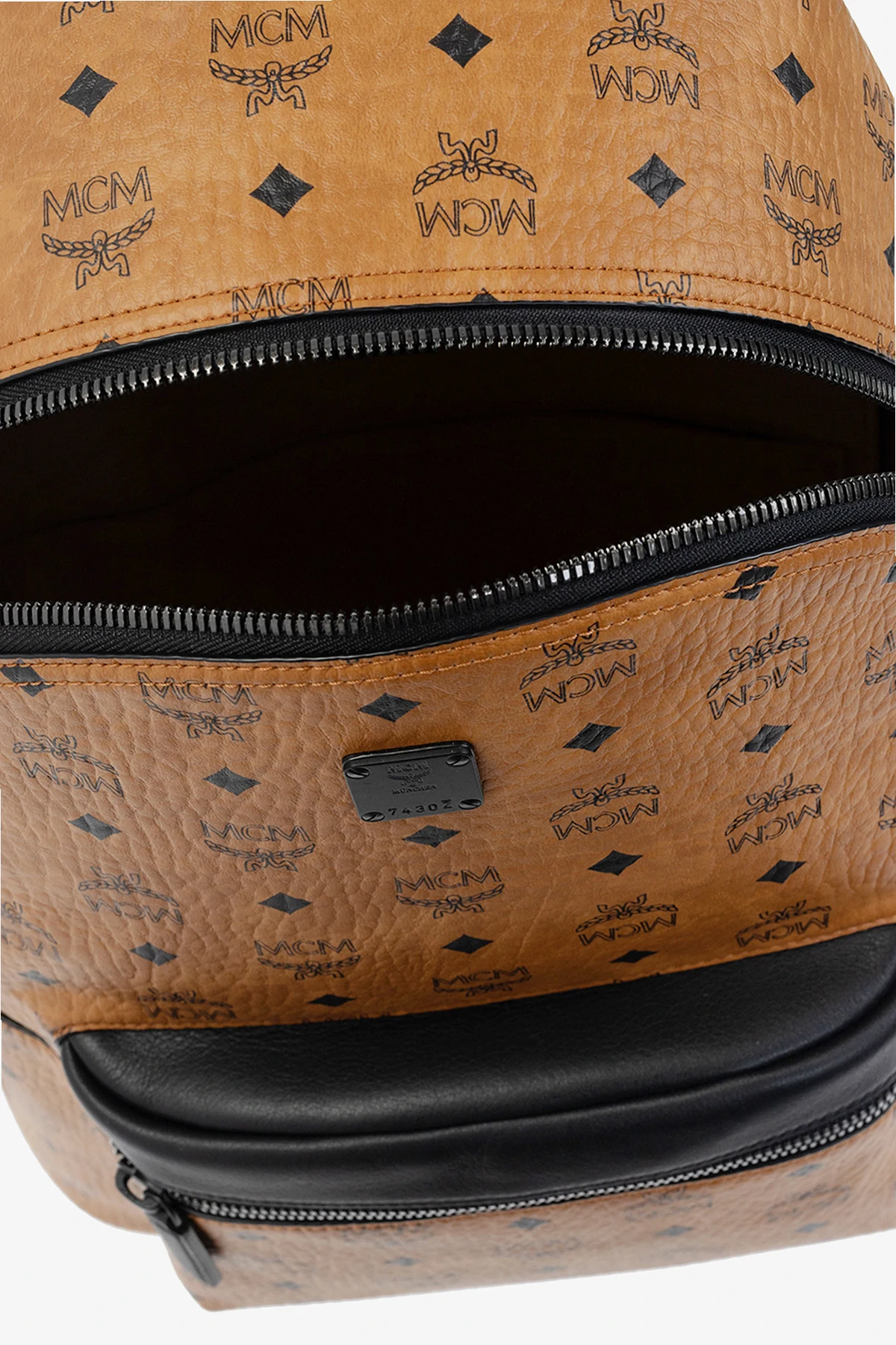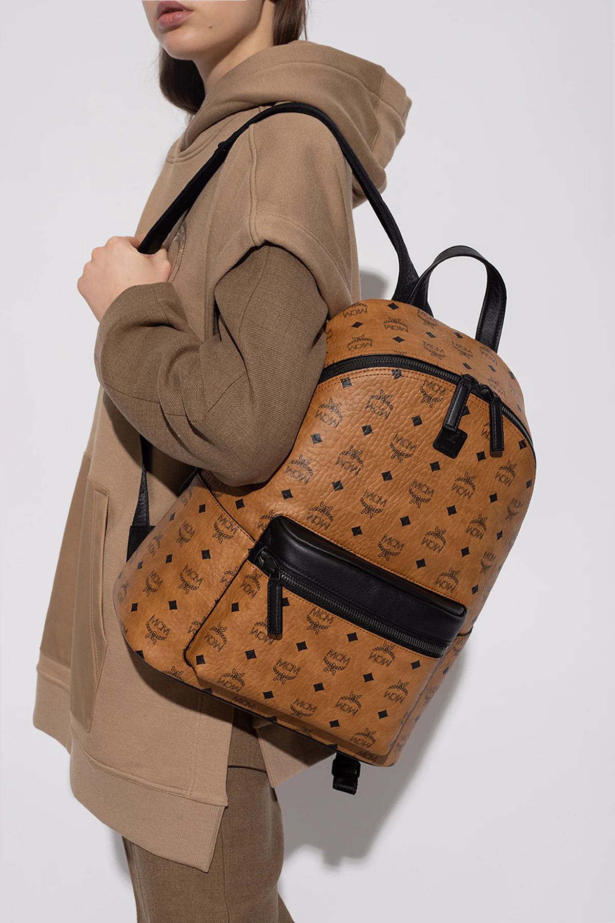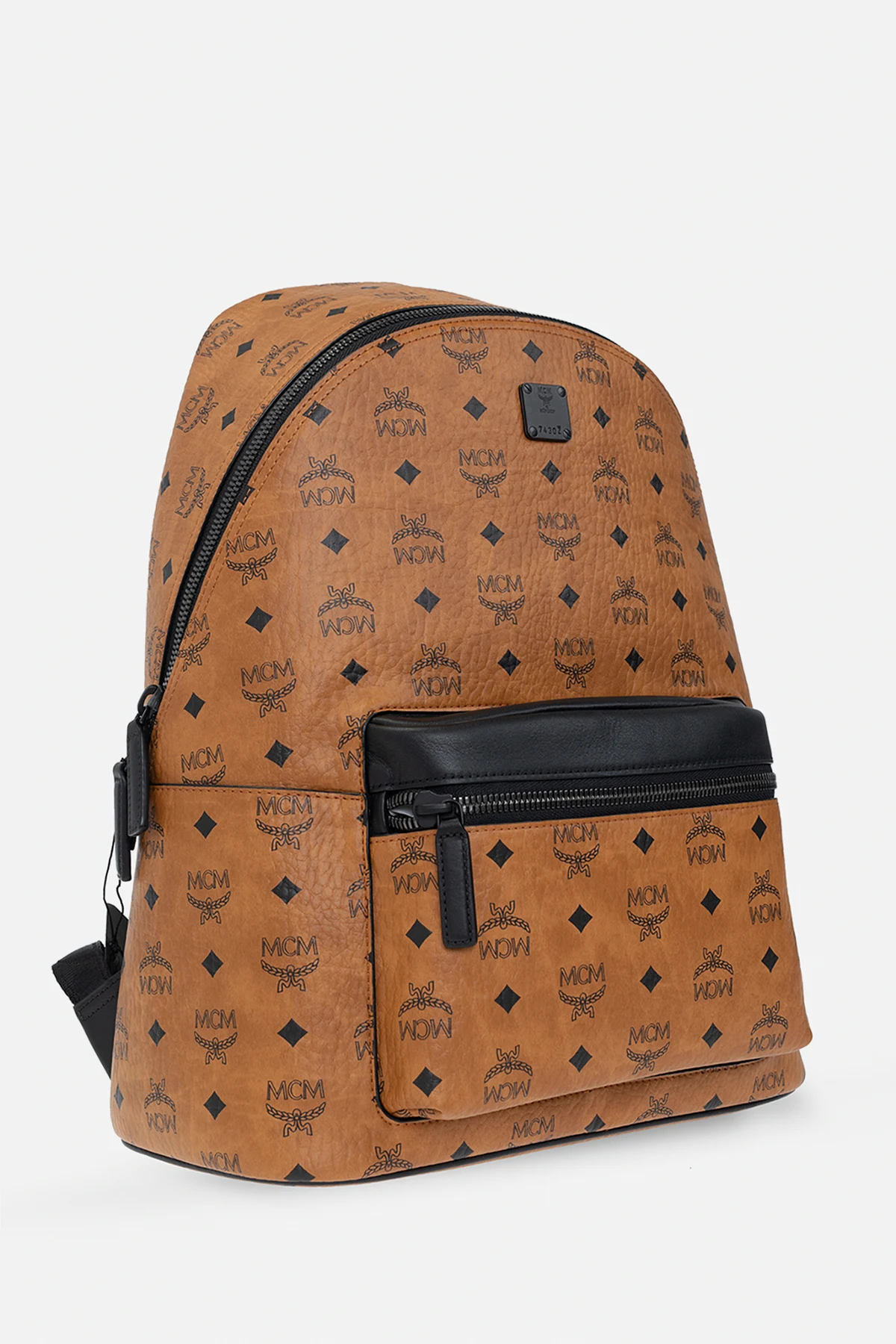 Brown and black backpack from MCM. Crafted from faux-leather decorated with the brand's signature 'Visetos' pattern, this design features a two-way zip fastening, a frontal pocket accompanied by a black logo application, a half-round handle, adjustable shoulder straps and one internal compartment with two slip pockets.