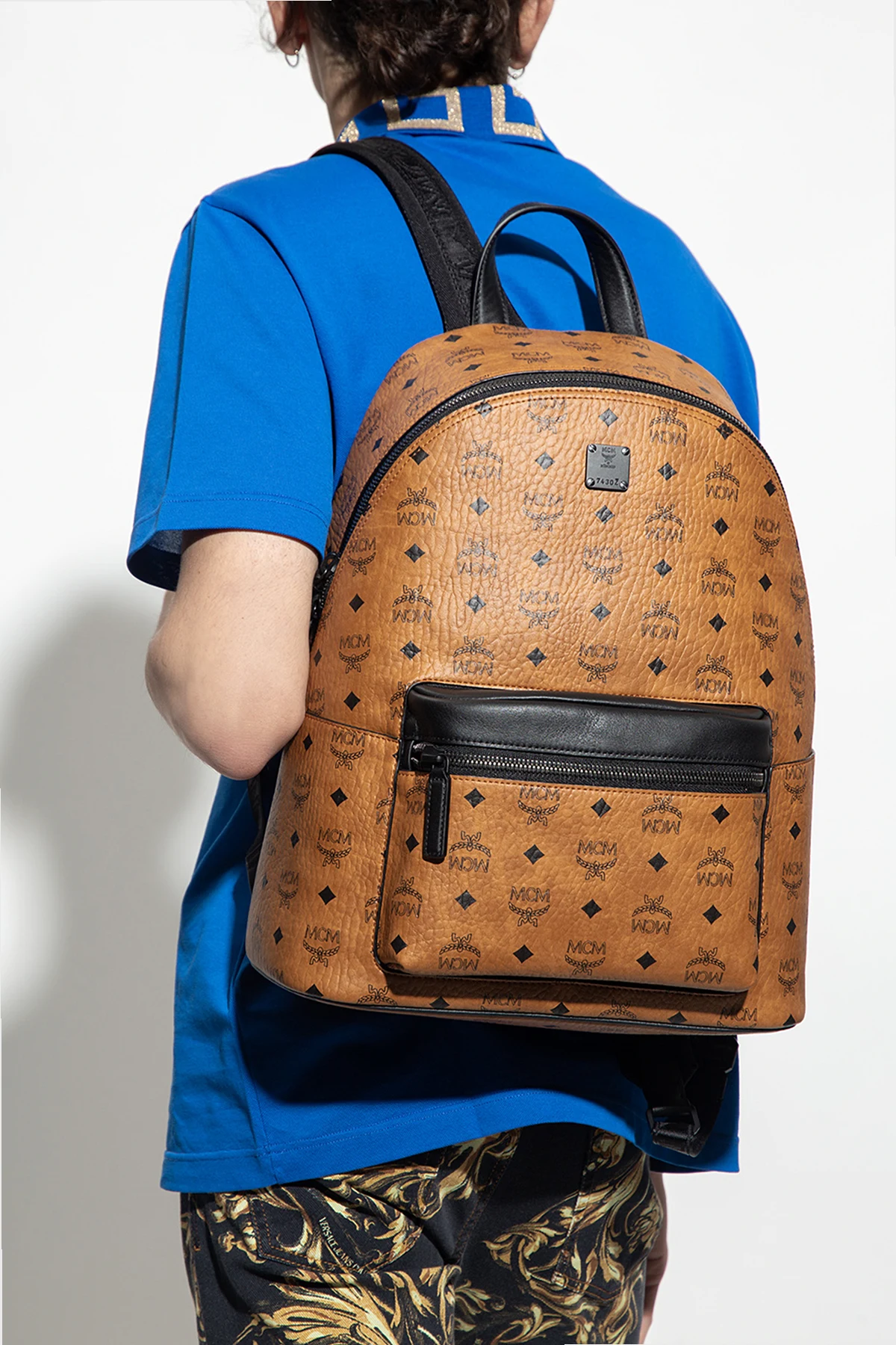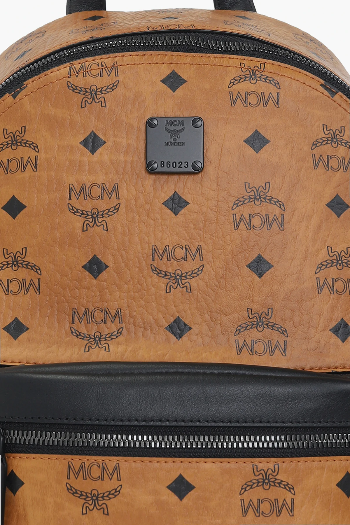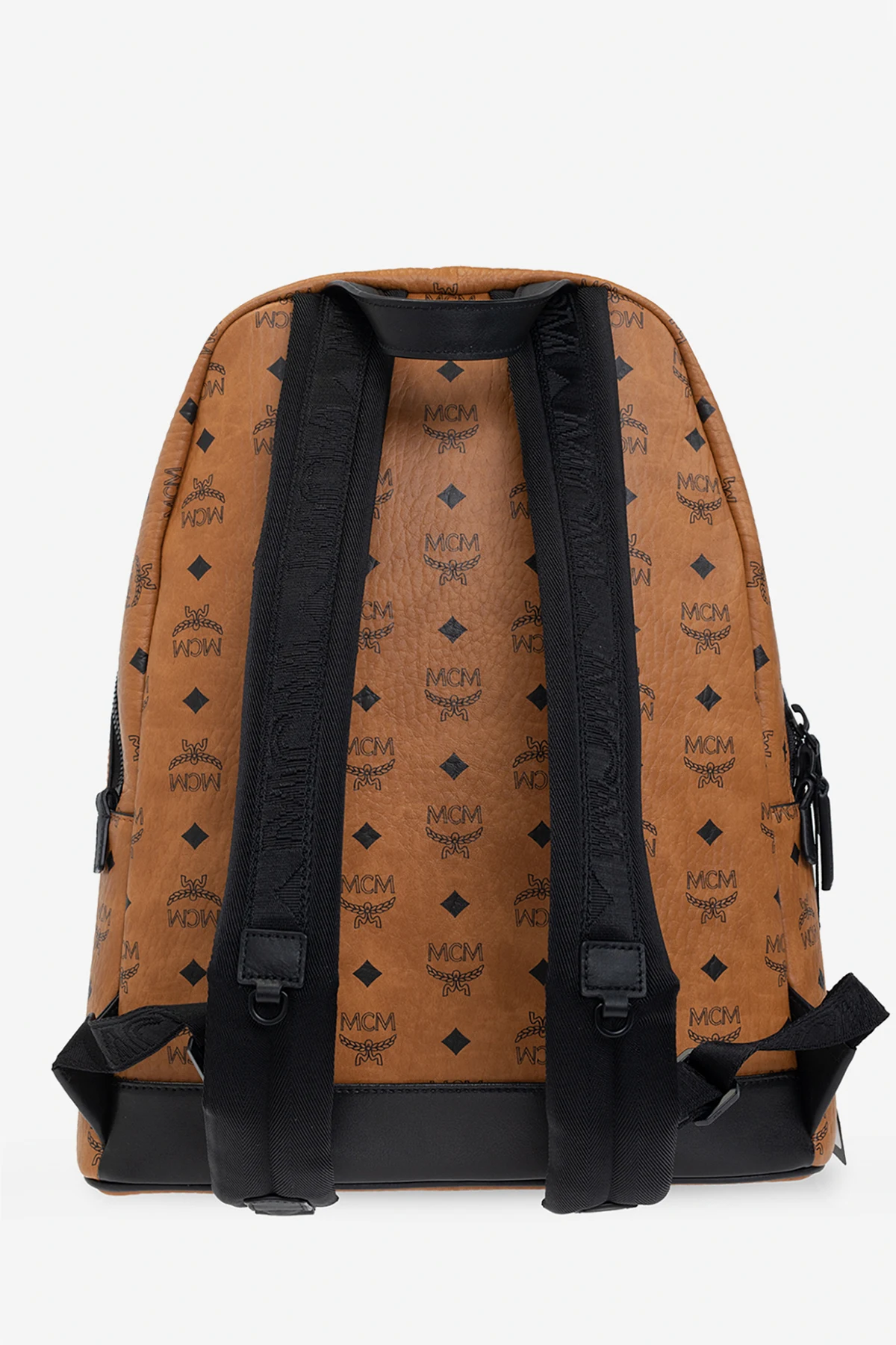 Brown and black backpack from MCM. Crafted from faux-leather decorated with the brand's signature 'Visetos' pattern, this design features a two-way zip fastening, a frontal pocket accompanied by a black logo application, a half-round handle, adjustable shoulder straps and one internal compartment with two slip pockets.