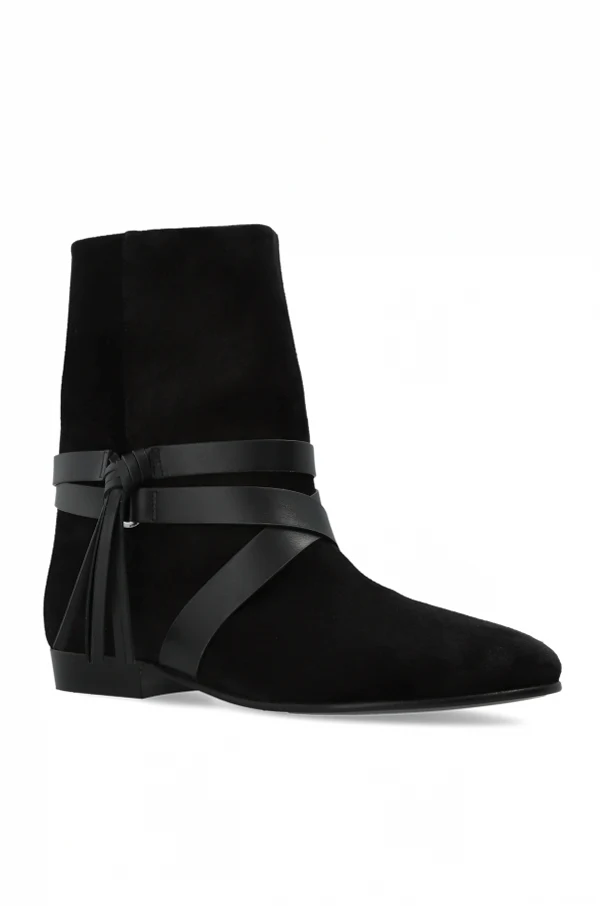 Ornate, wide leather straps envelop the boot in a sculptural crossover at the ankle, culminating in a distinctive side knot adorned with cascading leather ties—a detail that marries boldness with understated grace. The interior, lined in smooth calfskin, offers superior comfort with every step. Free from overt branding, these boots epitomize timeless luxury and versatile sophistication.