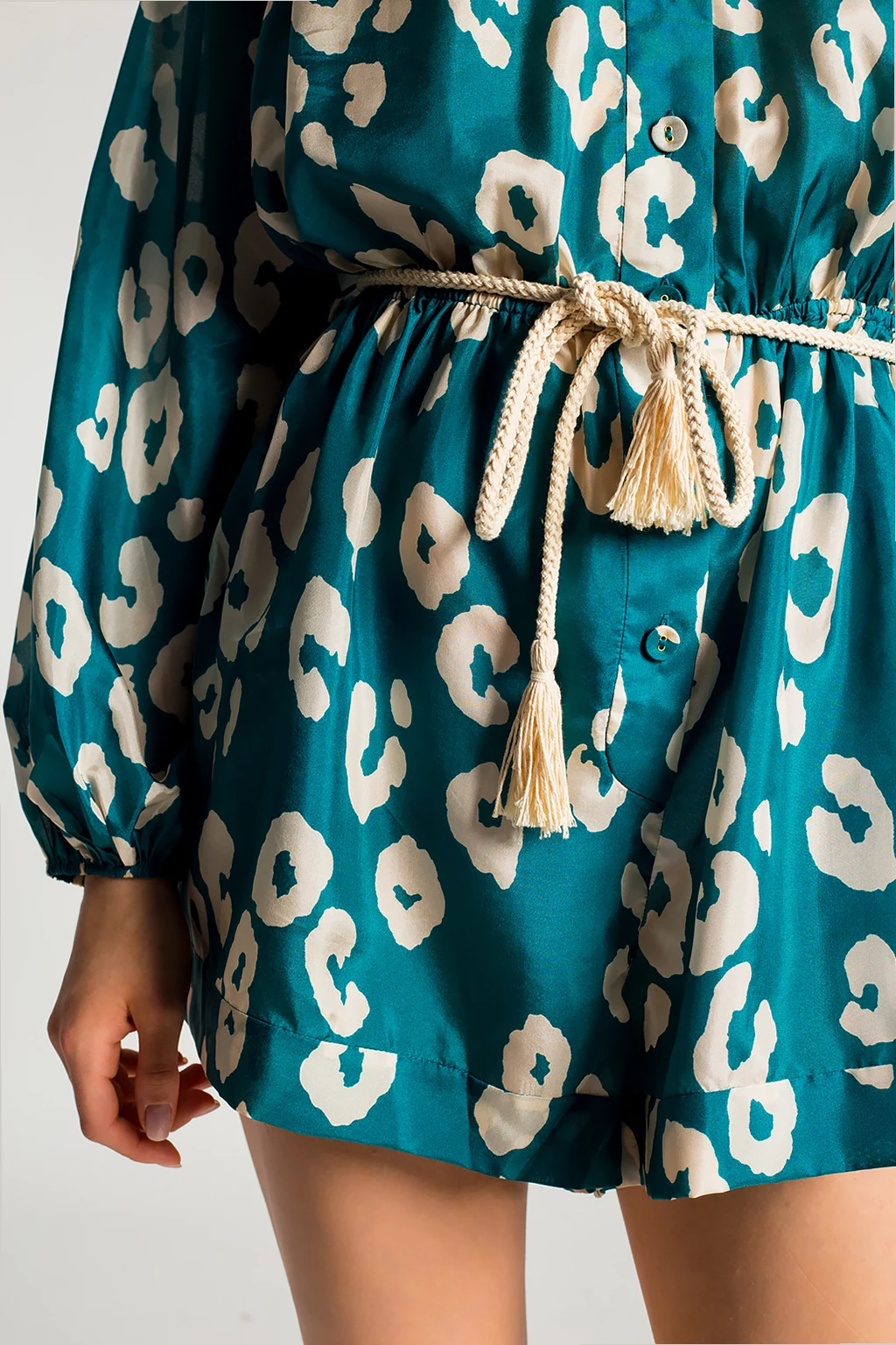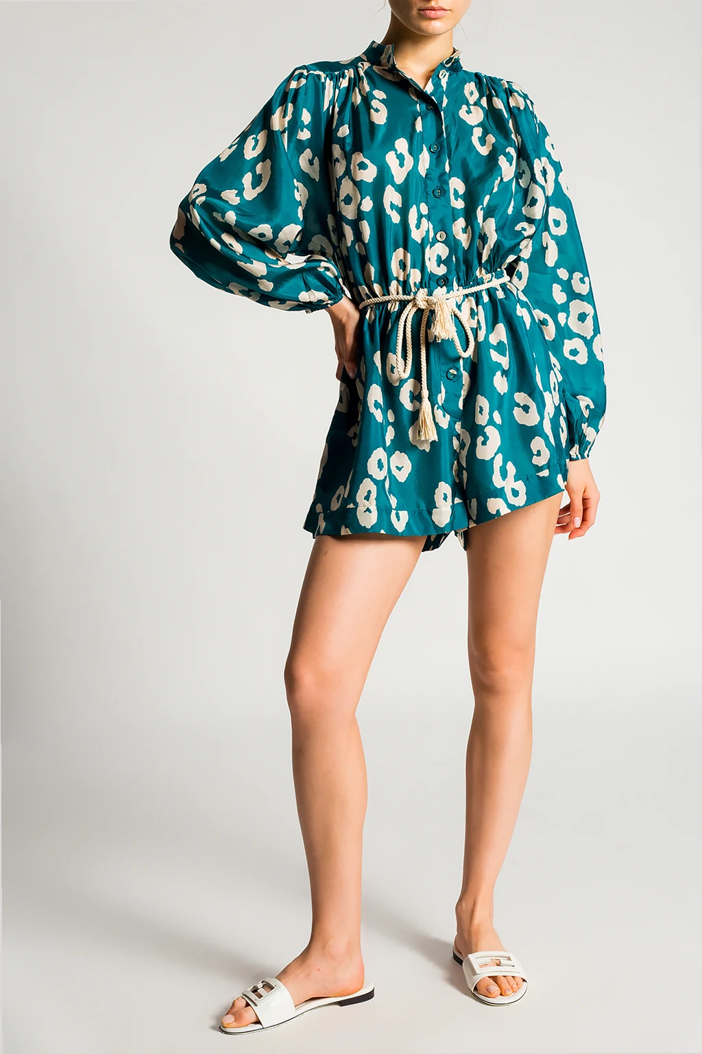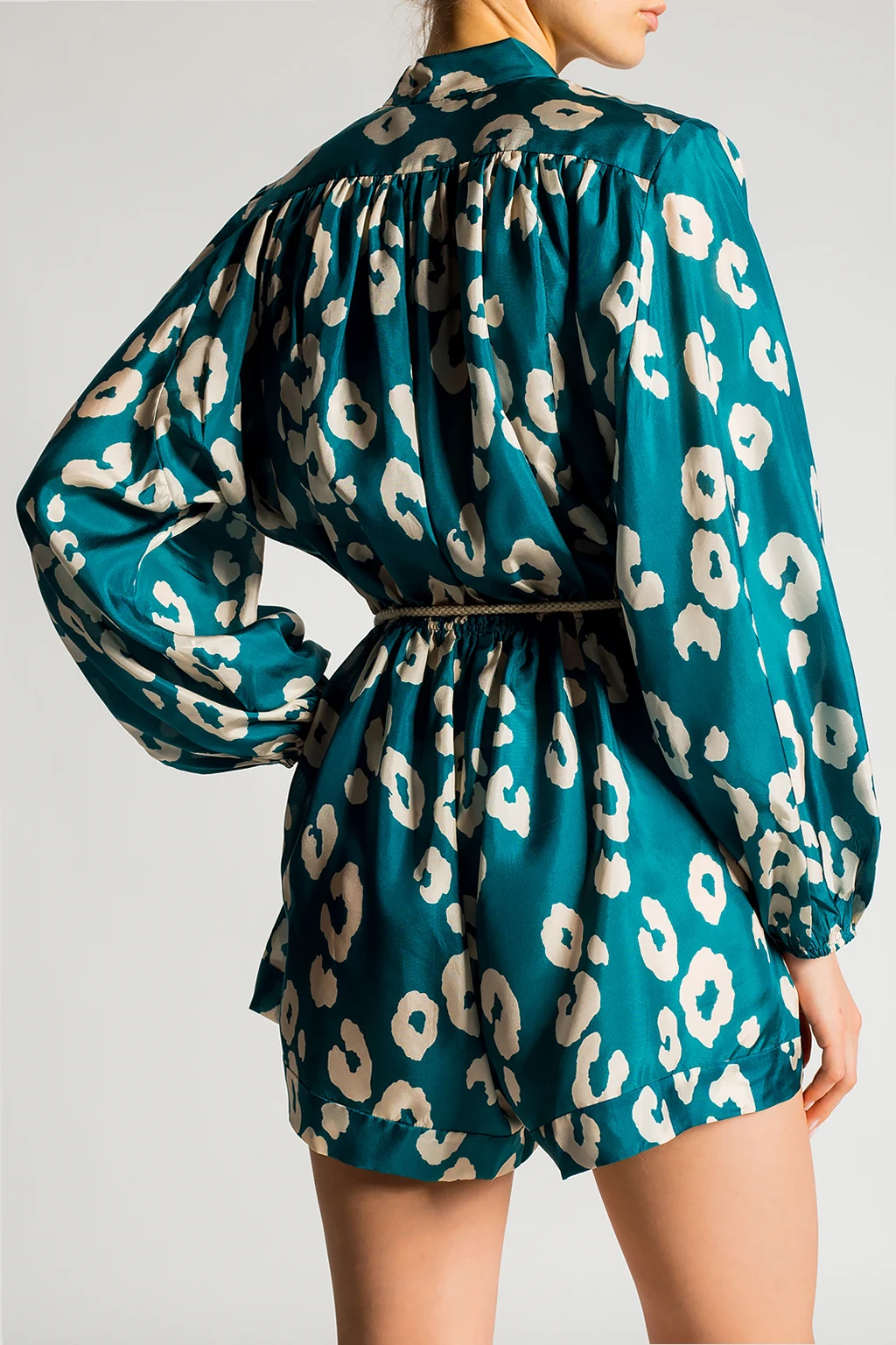 Blue and green jumpsuit from Zimmermann. Crafted from silk, this style showcases an animal pattern in grey, button fastenings and a shirred waist with a decorative tie fastening.