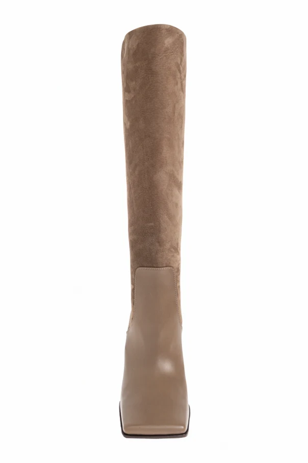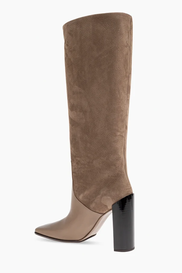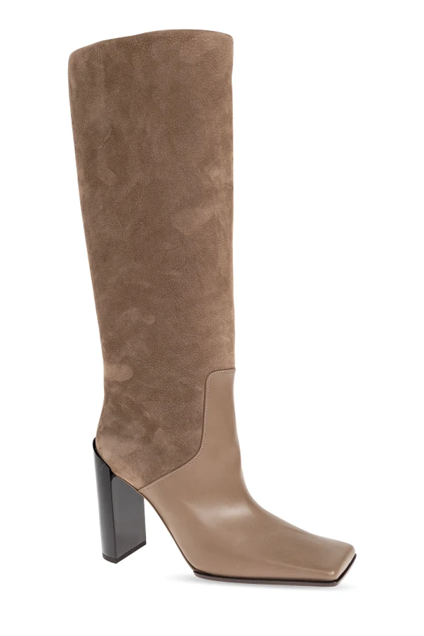 Experience the artistry of Alaïa with these exquisite high-heel knee-length boots in a luxurious Brown hue. Skillfully crafted, the upper features a sophisticated juxtaposition—supple suede gracefully envelops the shaft, while the lower is rendered in premium smooth leather, delineated by a striking, angular seam that accentuates the boot's distinctive silhouette.