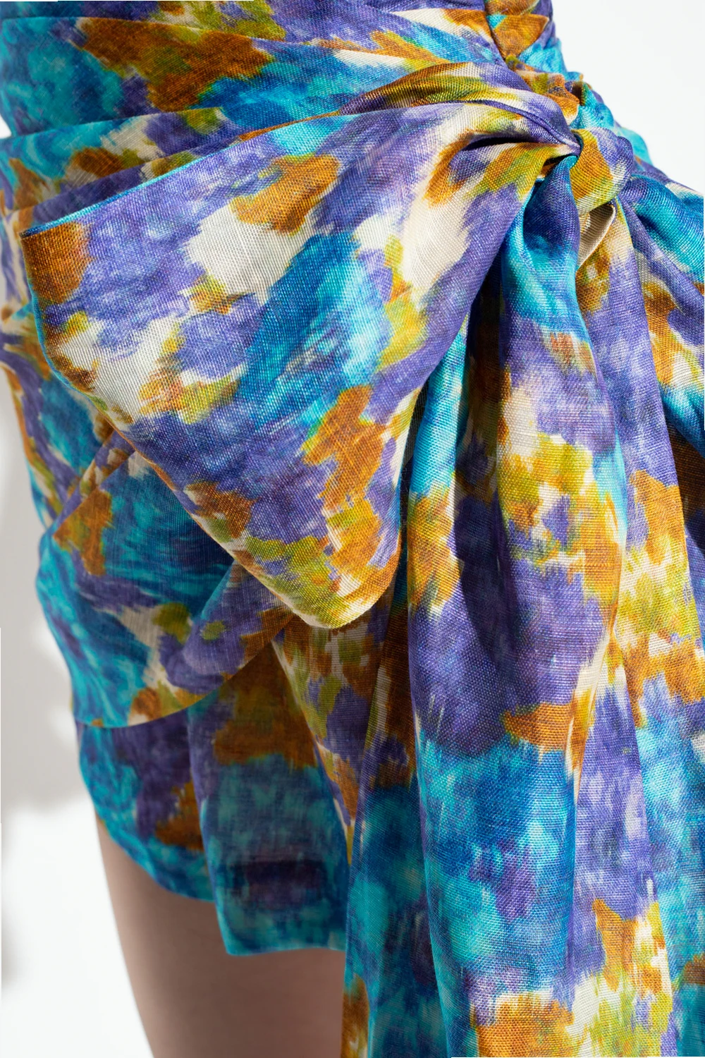 Multicoloured sleeveless jumpsuit from Zimmermann. Crafted from a linen and silk blend, this style showcases a blurred floral pattern. It is complete with a hidden side zipper with a hook & eye closure, short legs, underwires on the sides, decorative all-over gathers and a self-tie bow at hip.
