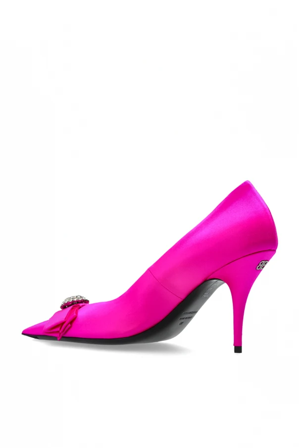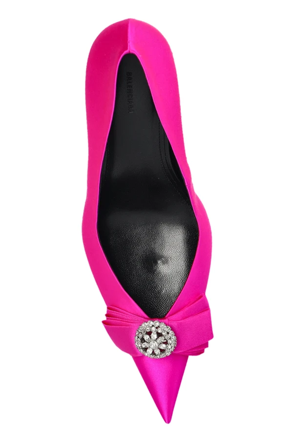 Introducing the ‘Avenue’ high-heel pumps in a resplendent green, crafted by Balenciaga for those who appreciate timeless sophistication. The silhouette boasts a sleek, pointed toe and a gracefully tapered stiletto heel, evoking an air of refined elegance. Cloaked in luminous satin, the exterior exudes a radiant sheen while the sumptuous leather inner lining and outsole ensure unparalleled comfort and durability.