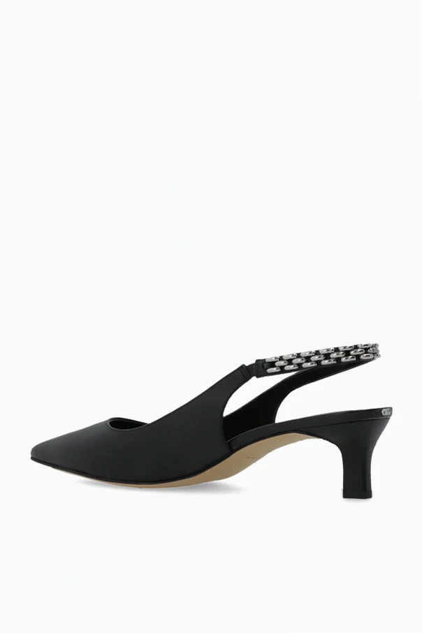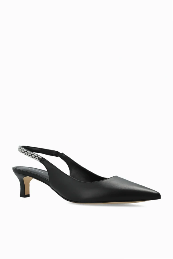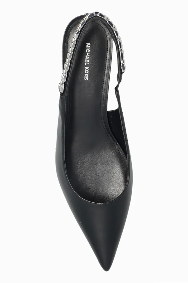 The Marcia mid-heel slingbacks by Michael Michael Kors exude an aura of refined sophistication. Crafted from sumptuously smooth black leather, their timeless silhouette is elevated by an elongated, pointed toe and a gracefully exposed heel. A slender strap adorned with a lustrous silver chain imparts a subtle yet unmistakable touch of exclusivity, setting these shoes apart from the classic court style.