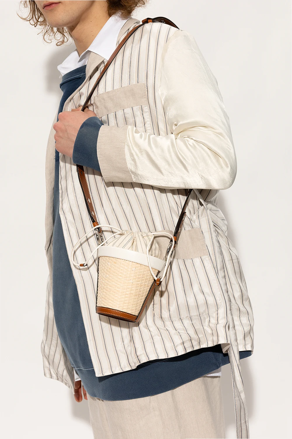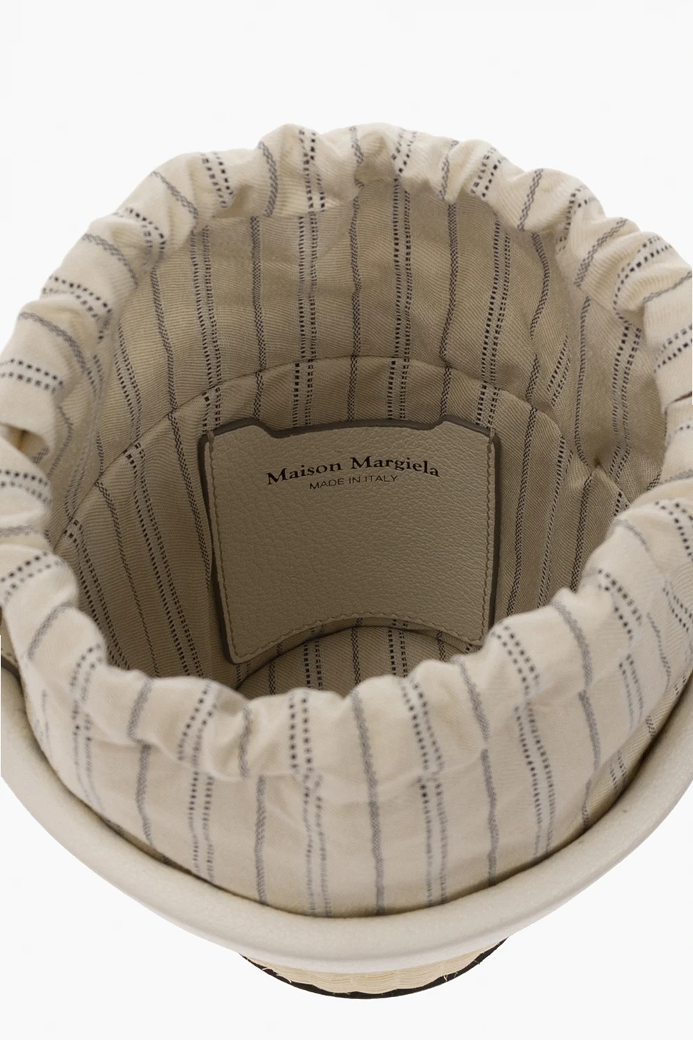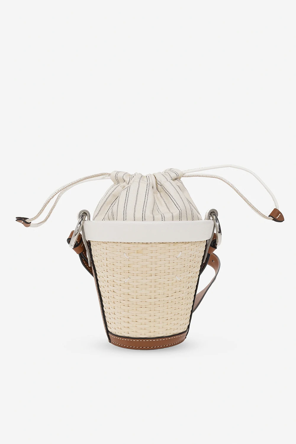 Beige and brown 'Fire' bucket bag from Maison Margiela. Made of raphia palm with leather and fabric trims, this model is complete with drawstrings, a detachable and adjustable strap, silver-tone metal hardware and one internal compartment with one card slot.