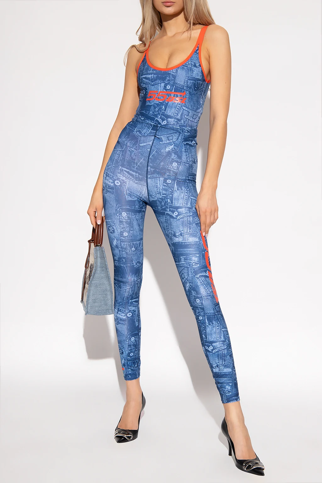 Blue 'AWSB-ROOWI-WT26' leggings from Diesel, the 'Sport 55DSL' collection. Embellished with a photographic denim motif accompanied by a red logo print, they feature an elasticated waistband, a back brown patch and narrow legs.