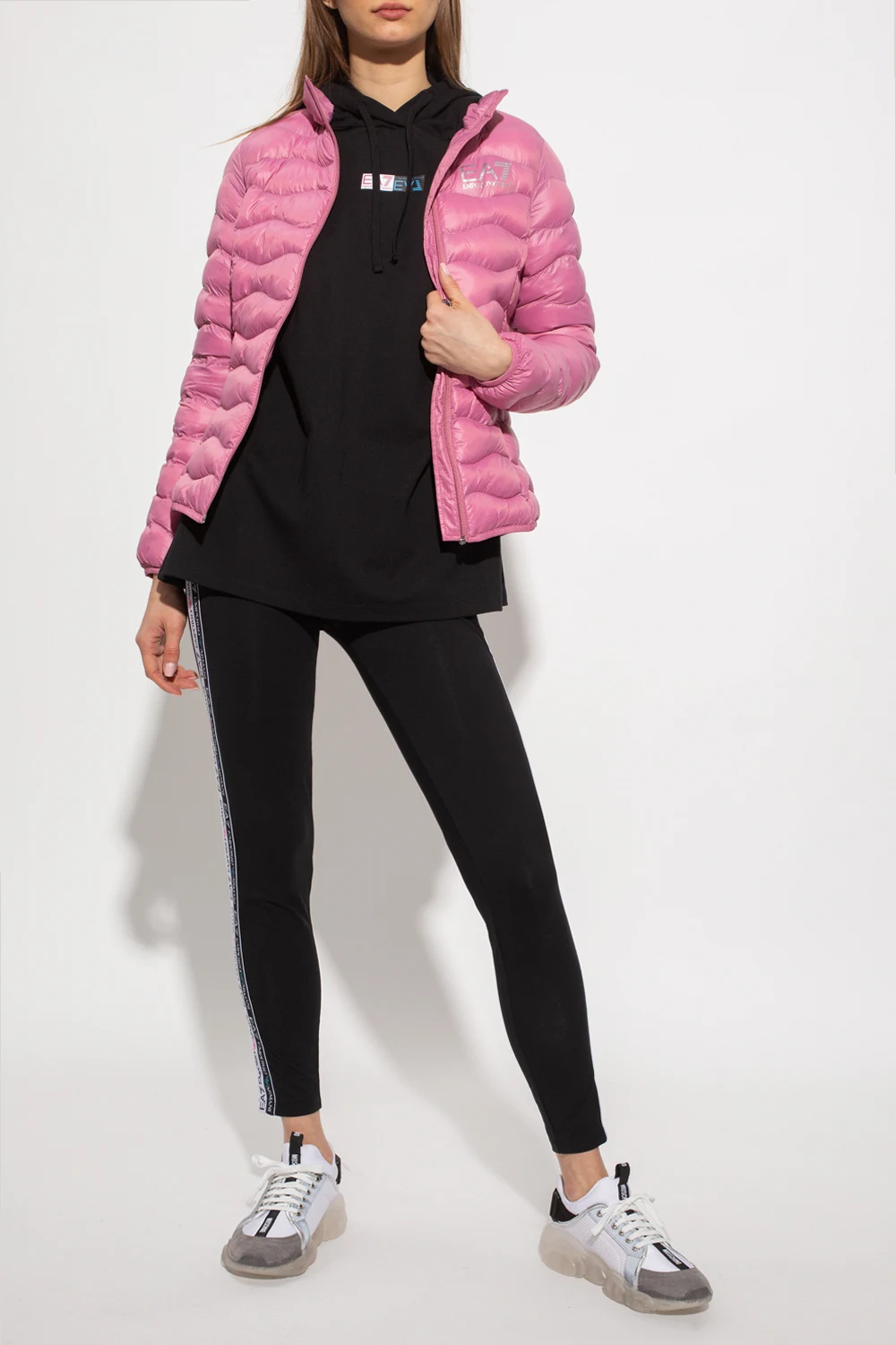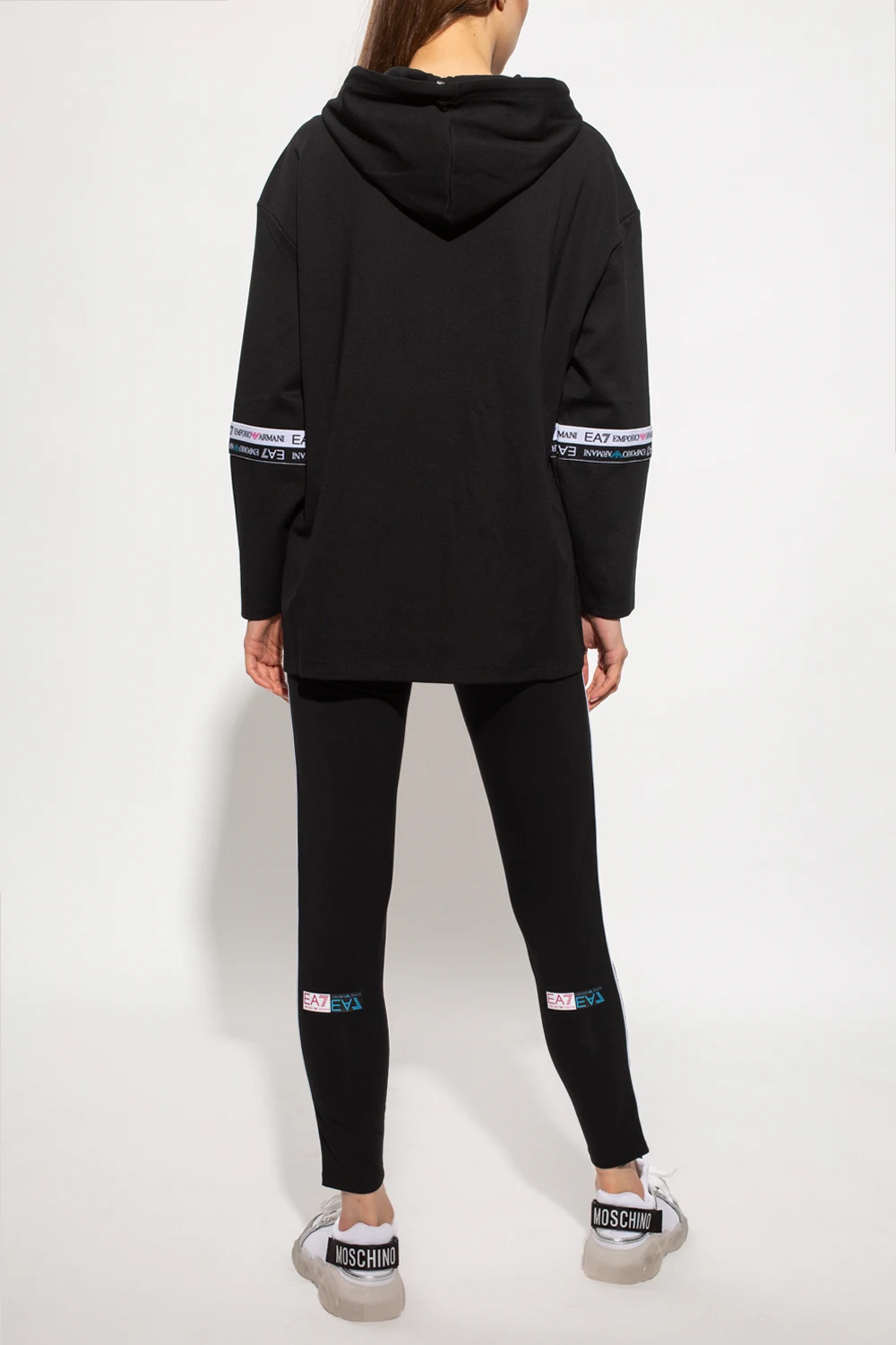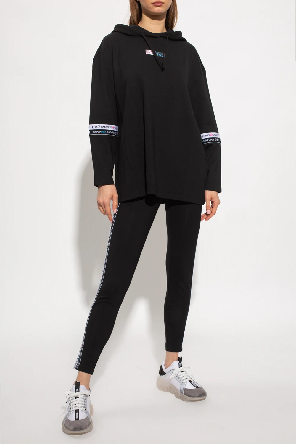 Black hoodie and leggings set from EA7 Emporio Armani. The sweatshirt features a drawstring hood, logo print and stripes with a logo in white and black. The leggings are enriched by white and black side stripes with a logo as well as a logo print at the back.
