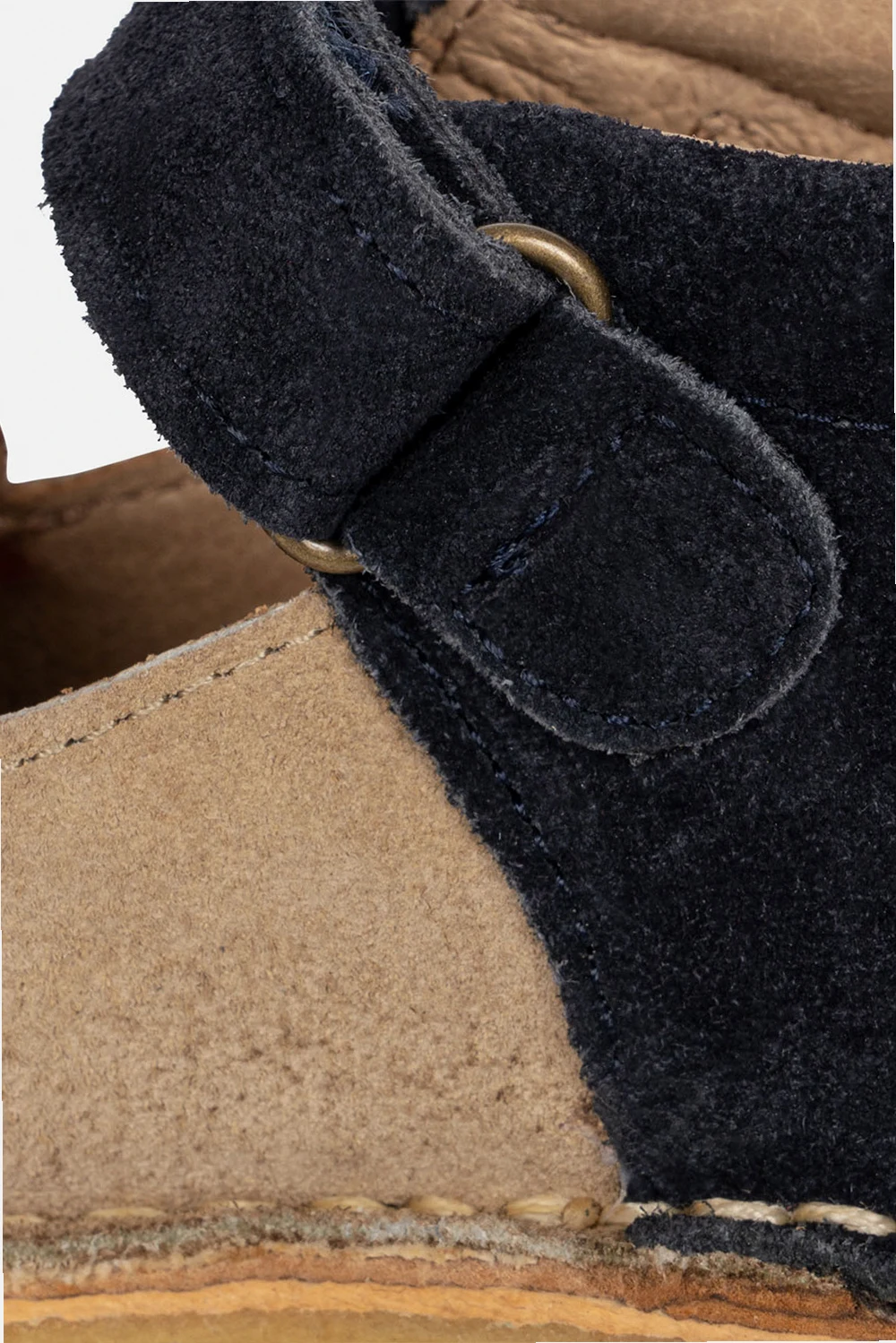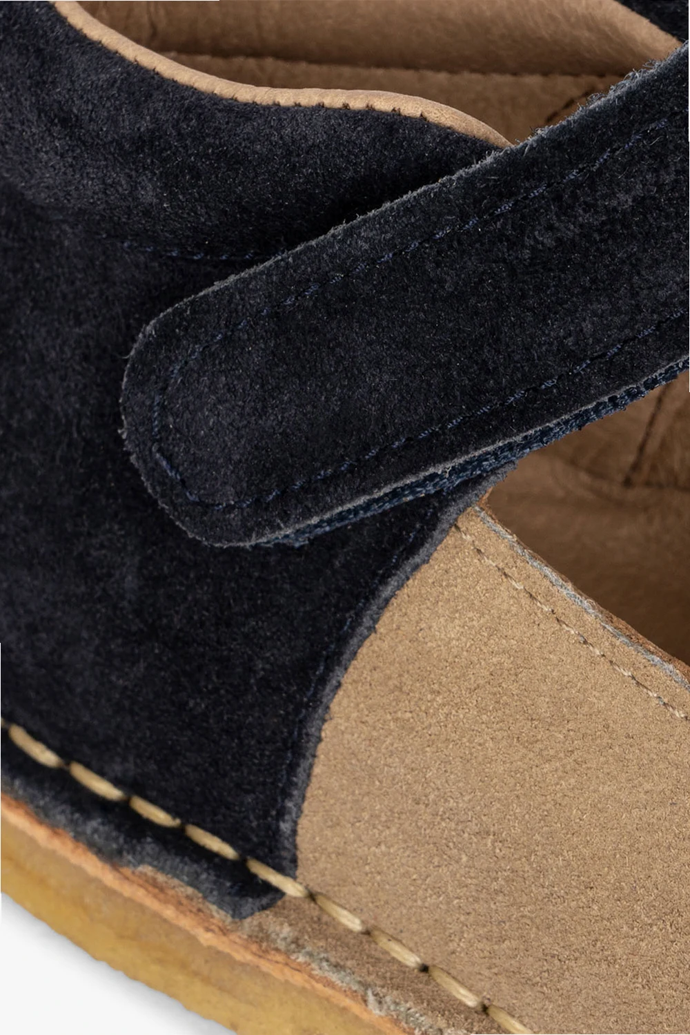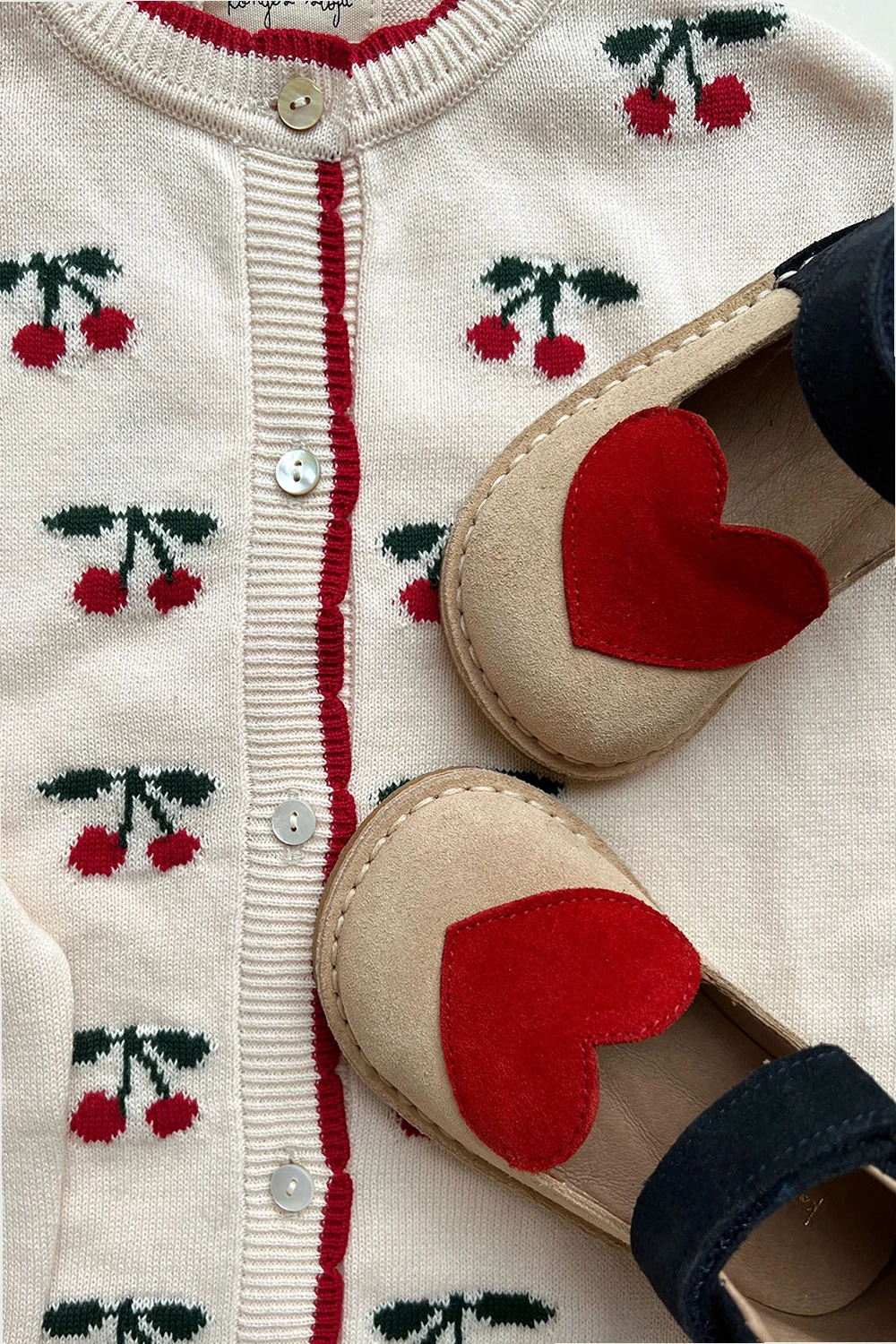 Red, navy blue and brown ‘Minnie’ shoes from Konges Slojd. Made of suede, this model sits on a beige rubber sole and features a padded removable insole, heart embroidery and velcro closures.