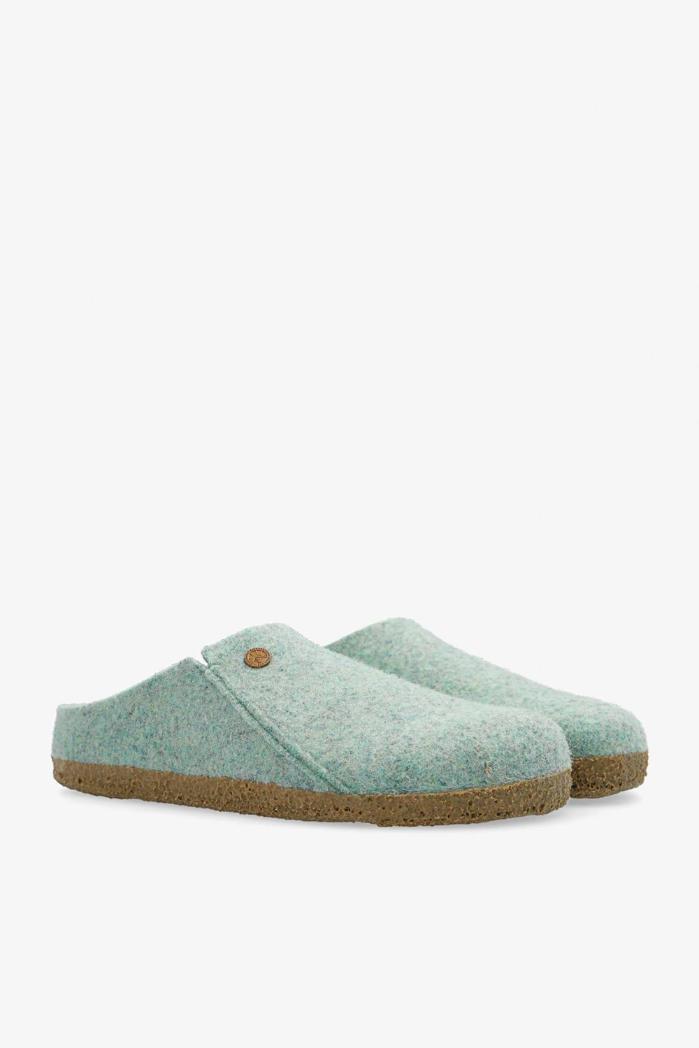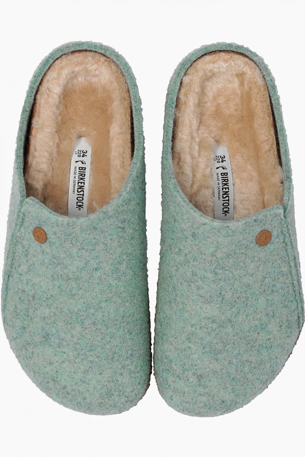 Blue and green ‘Zermatt Rivet’ slides from Birkenstock Kids. Made of felt, this pair is complete with a logo embroidery, silver-tone metal appliqué, faux fur lining in cream and light brown with a cork-latex footbed.