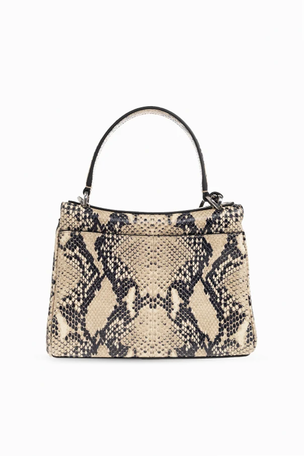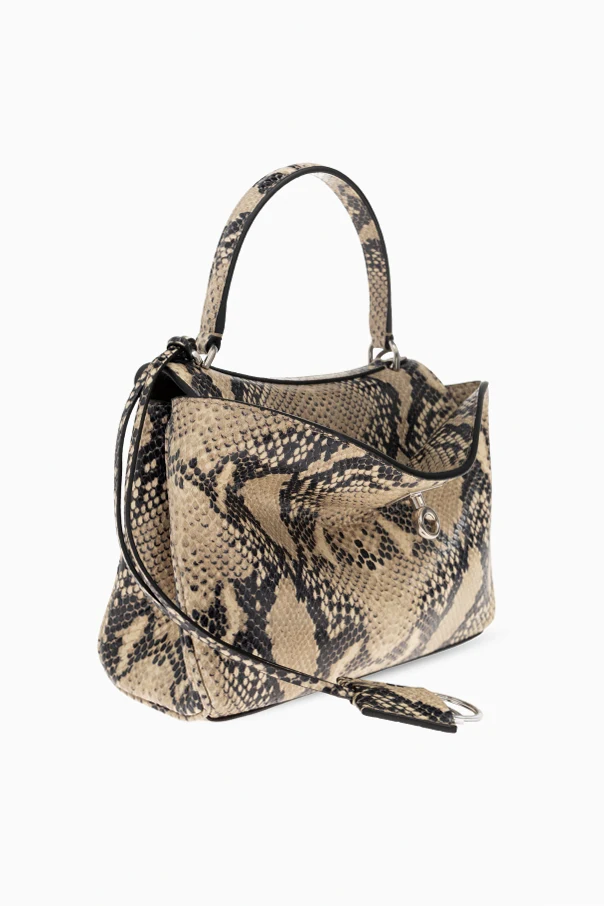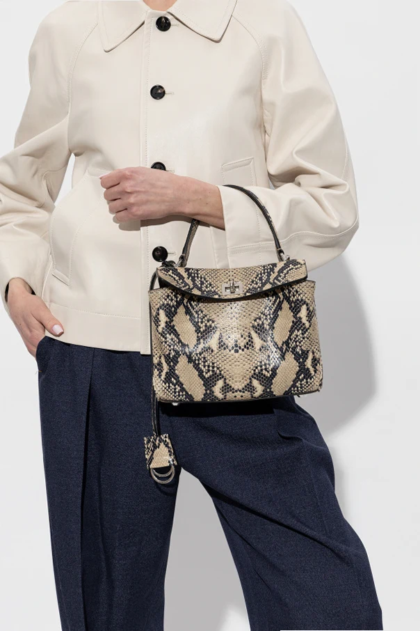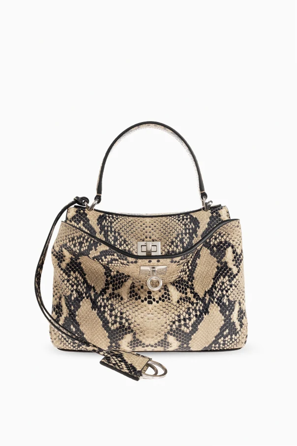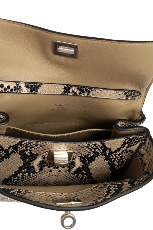 The ‘Rodeo’ Handbag by Balenciaga exemplifies contemporary elegance and refined sophistication. Crafted in a classic, structured rectangular silhouette with gently rounded edges, its distinctive form subtly transitions into a slight trapezoid at the base. An artful snake effect motif adorns the light beige exterior, enriched by intricate, irregular dark patterns that evoke exotic allure. The exterior, fashioned from premium exotic-effect leather, pairs exquisitely with a luxuriously smooth, light beige leather interior, highlighting a taste for understated luxury. A signature silver front clasp, rectangular in shape with a twist-lock mechanism, provides both security and a striking visual accent. The discreetly embossed designer logo beneath the flap lends an exclusive finishing touch. Choose between a short top handle or an adjustable, detachable shoulder strap for effortless versatility. Why choose this product? Elegant light beige color with sophisticated snake-effect finish Premium materials ensure lasting quality and luxurious tactility Versatile carry options: short handle and long adjustable strap Iconic silver twist-lock clasp for a unique statement Discreet, embossed designer logo for exclusivity