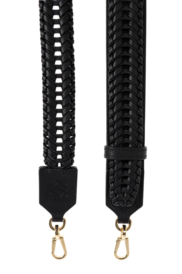 Discover an air of refined sophistication with this black leather bag strap , a signature accessory from Loewe designed for discerning women. Meticulously crafted from premium leather, this wide and flat strap showcases a distinctive braided motif throughout, imparting both exclusive character and visual intrigue. The solid construction ensures remarkable durability and exceptional comfort on the shoulder, while carefully rounded ends highlight the attention to detail. Each end features an embossed designer logo on finely stitched leather elements, reinforcing the accessory’s elevated allure. Polished gold-tone clasps provide a flawless attachment to your favorite bag, reimagining everyday elegance with a lavish touch. Why choose this product? Luxurious black, high-grade leather with artisanal craftsmanship Striking braided design for unique distinction Durable structure with plush comfort for all-day wear Embossed designer detail highlights exclusivity Gold-tone metal hardware for ultimate sophistication