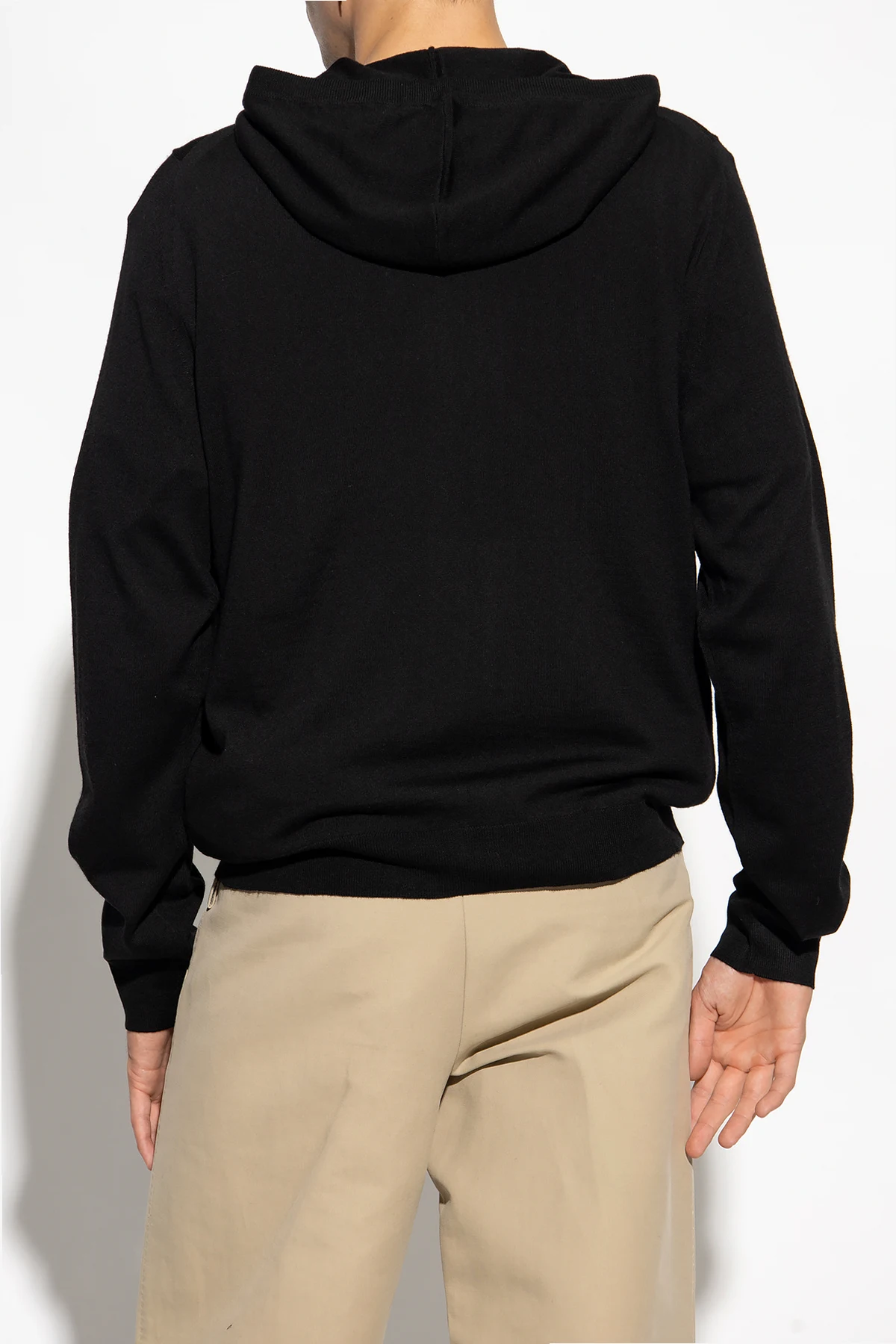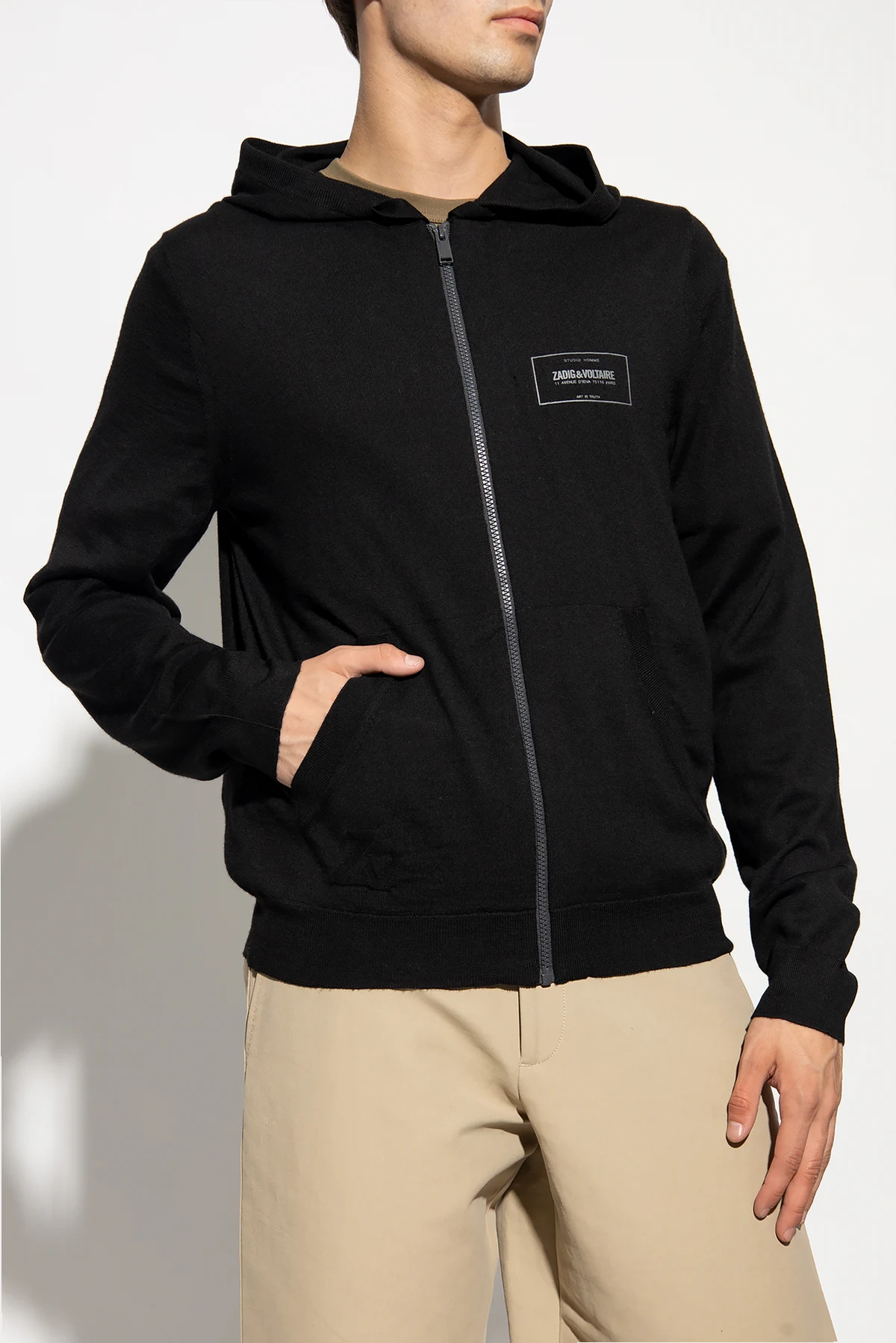 Black 'Clash We Studio' sweatshirt with a drawstring hood from Zadig & Voltaire. Made from merino wool, this item fastens with a zip and showcases a printed grey logo, two slip pockets, long sleeves and ribbing on the bottom hem and cuffs.