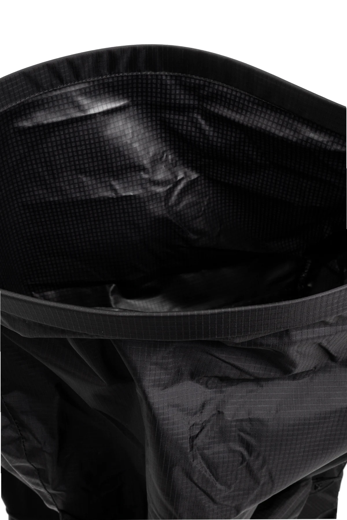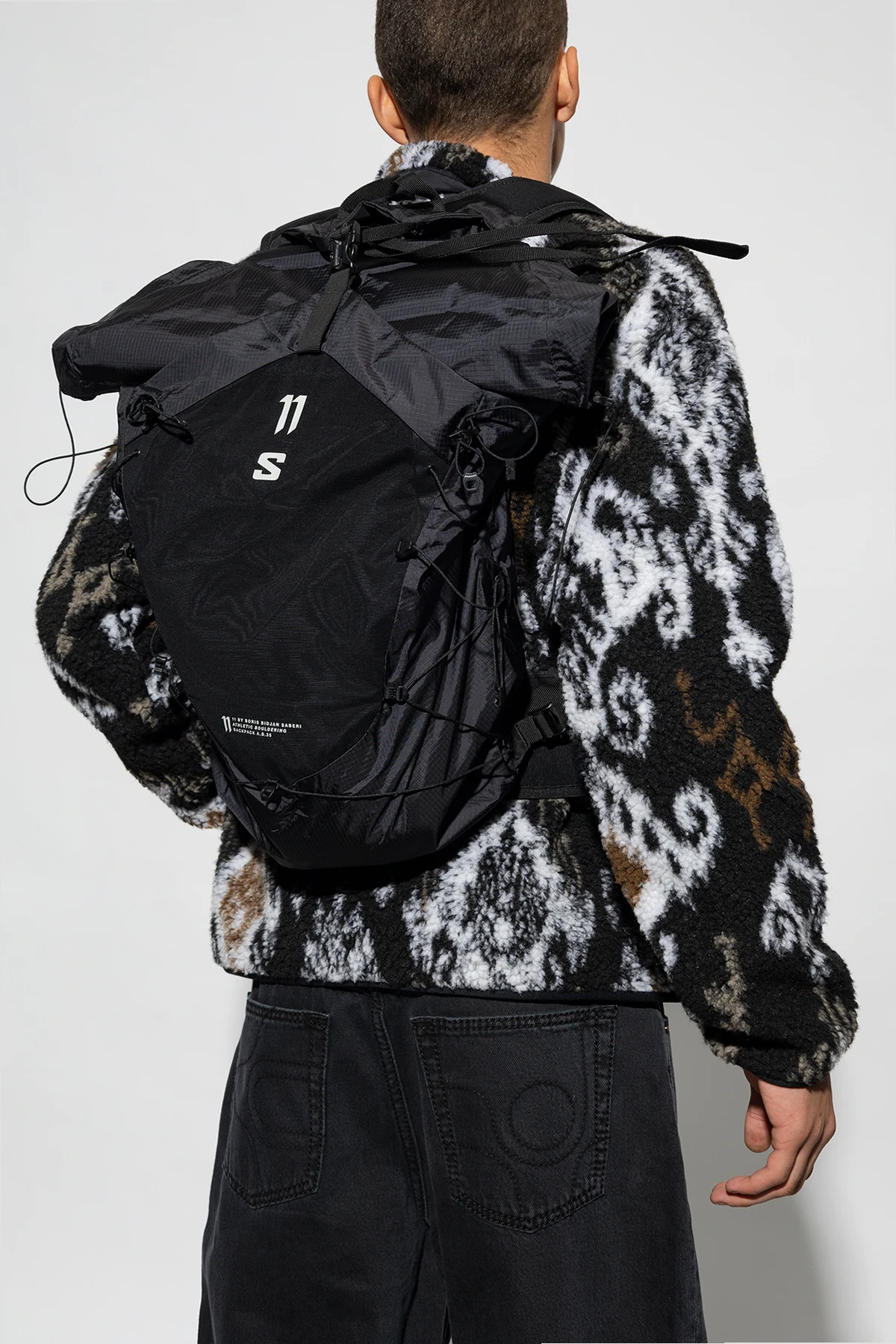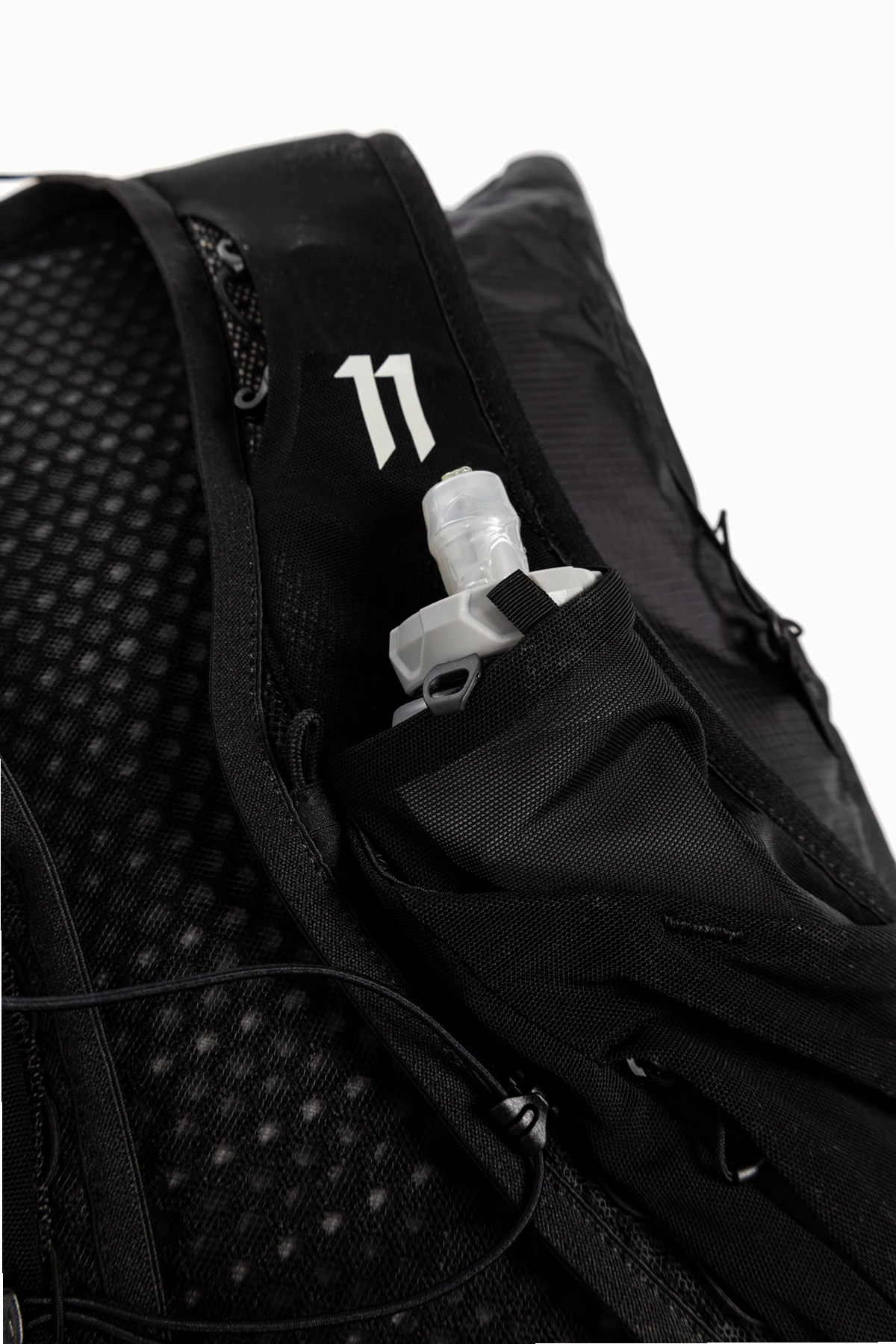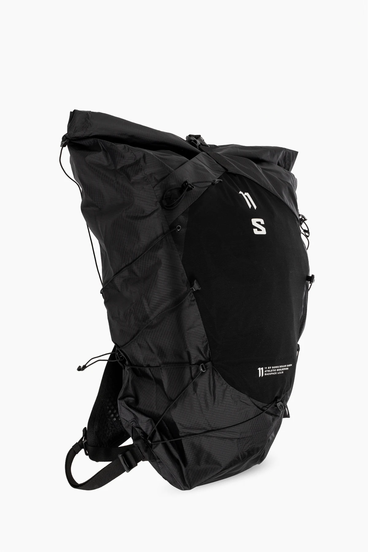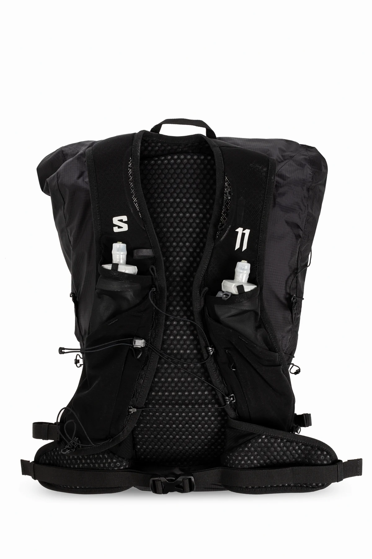 Black '11S' backpack from Salomon x Boris Bidjan Saberi. Crafted from material with high resistance to adverse weather conditions, this design cinches closed with drawstrings and features a snap fastening, a light grey print and logo, one half-round handle, adjustable shoulder straps with a snap-fastened strap and two soft water bottles, multiple pockets, a Motion back system with EVA foam, and one internal compartment with a zip pocket. The hybrid construction combines wide shoulder straps, twin chest straps and SensiFit™ for an adjustable, snug fit and extra stability (3-point attachment).