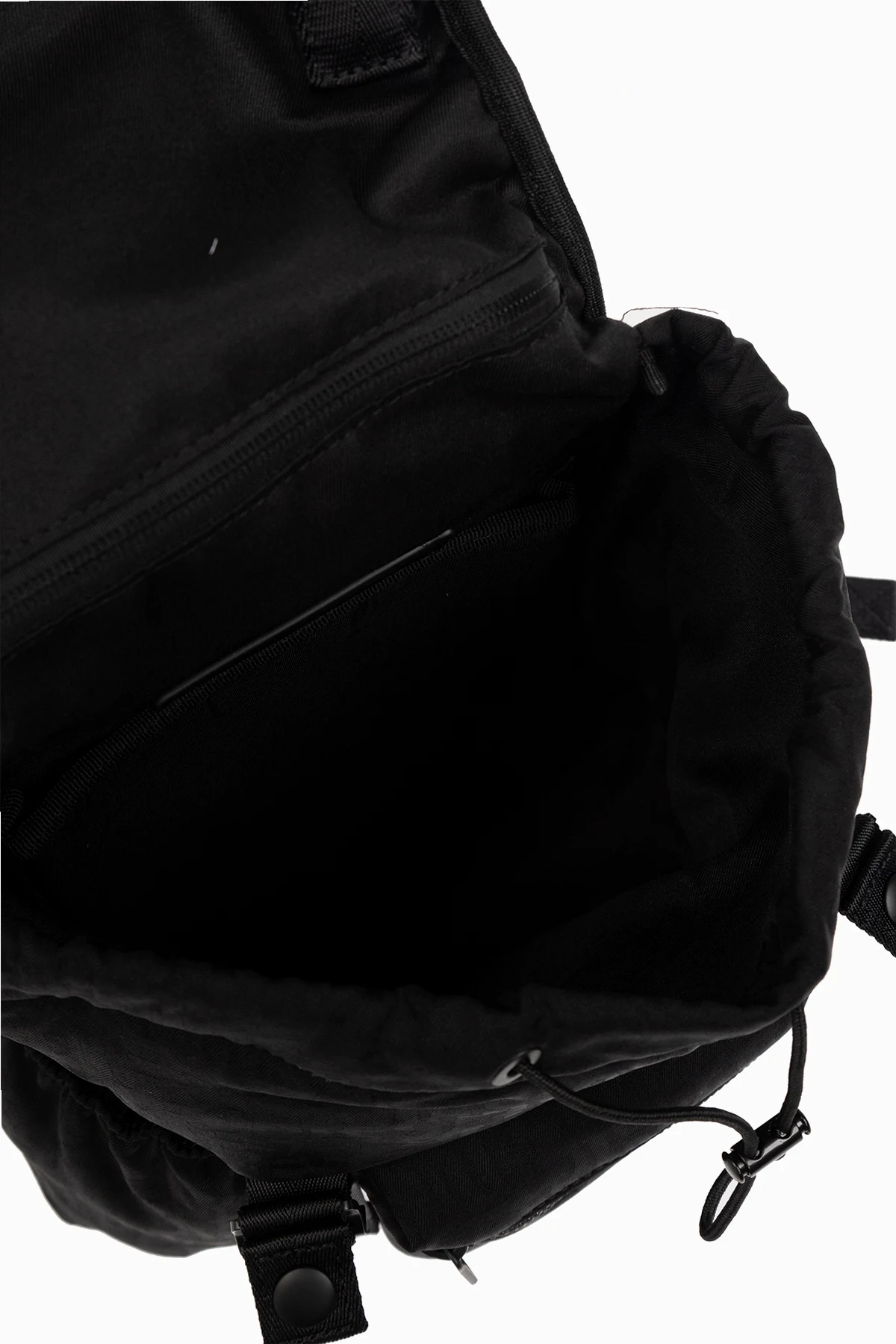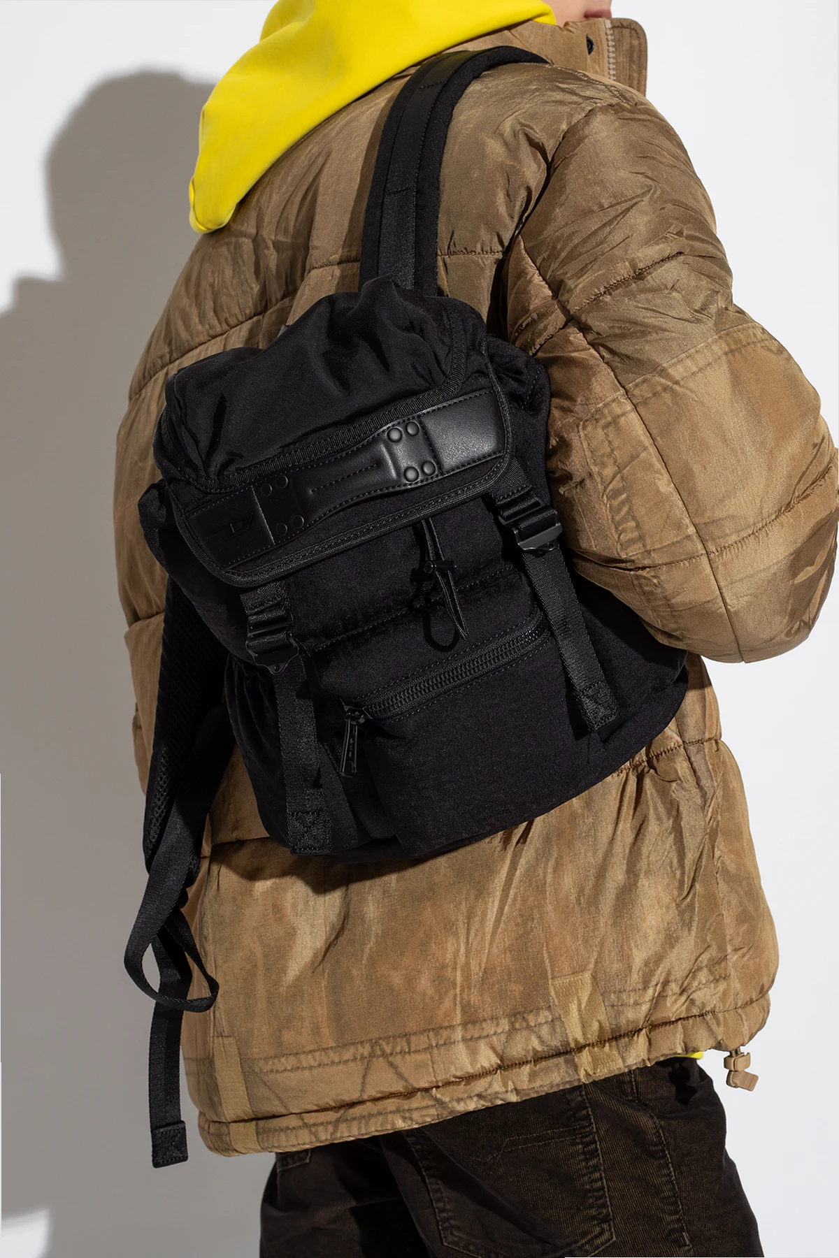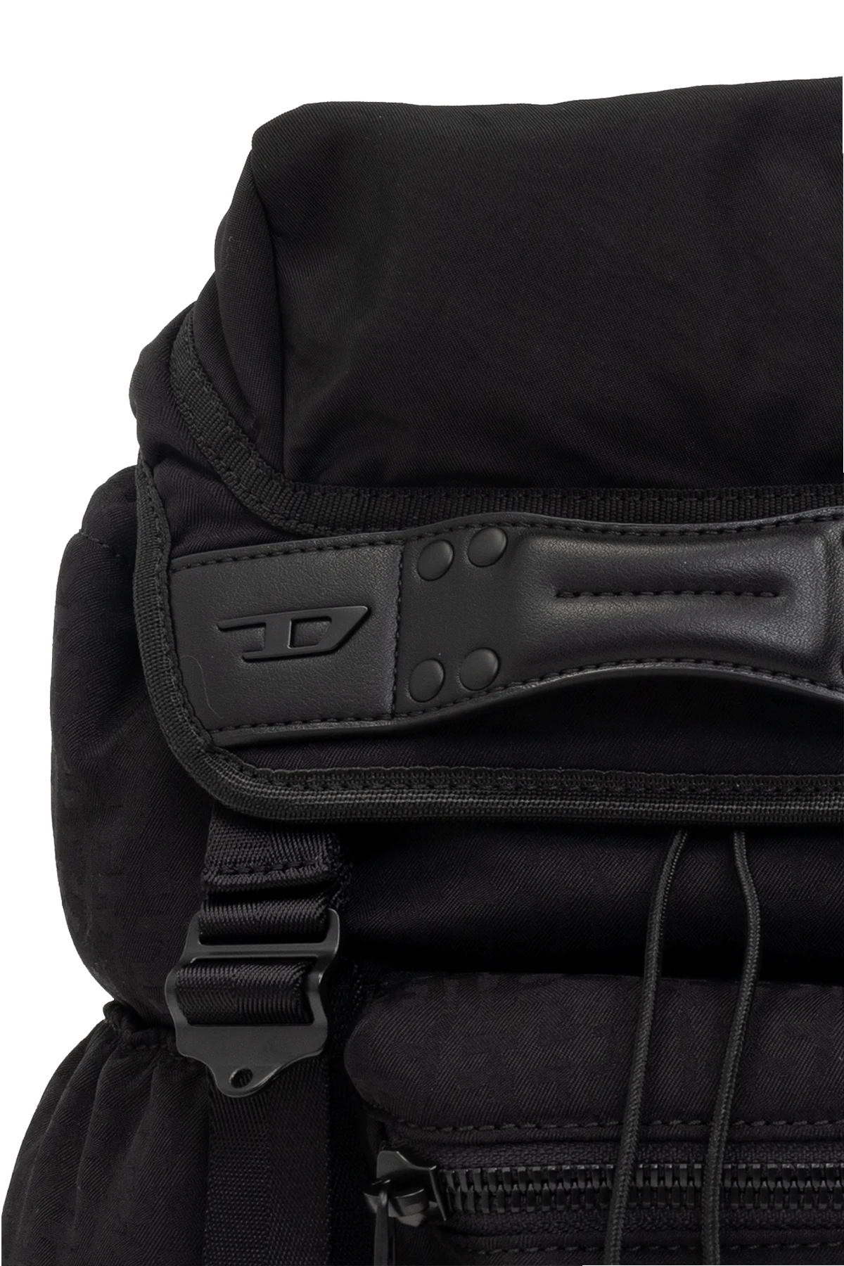 Black backpack from Diesel. Crafted from monogrammed technical material and trimmed with faux leather, this design adjusts via snaps and features a frontal handle accentuated with a metal logo plaque. It is complete with a top handle, adjustable shoulder strap, one zip pocket on the front, two slip pockets on the sides, silver-tone metal hardware and a drawstring interior with a slip pocket.