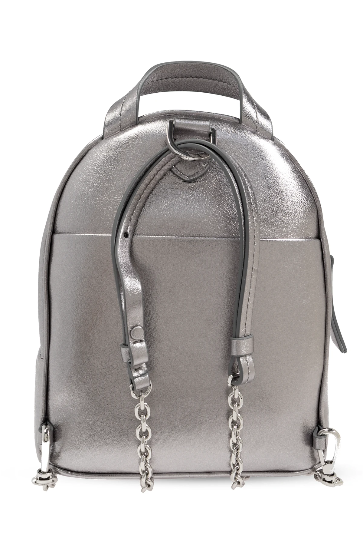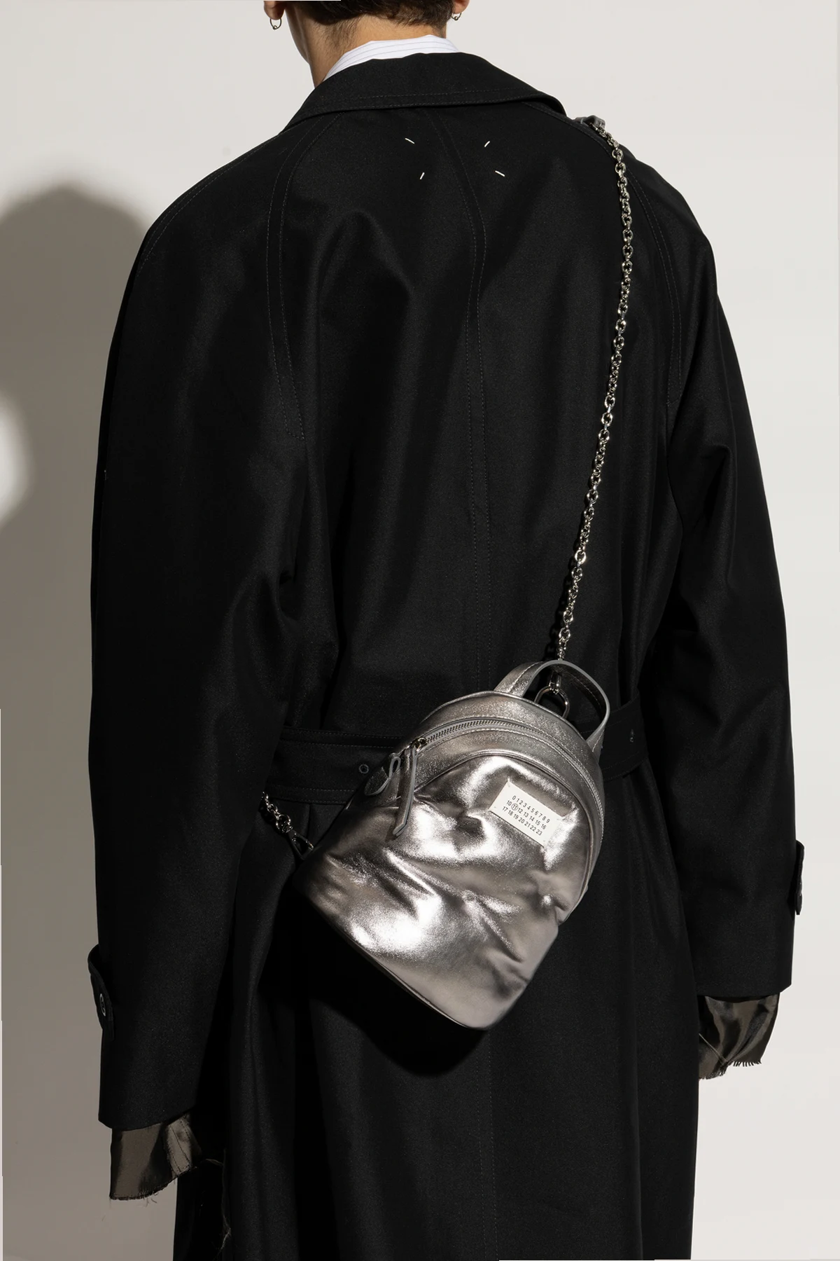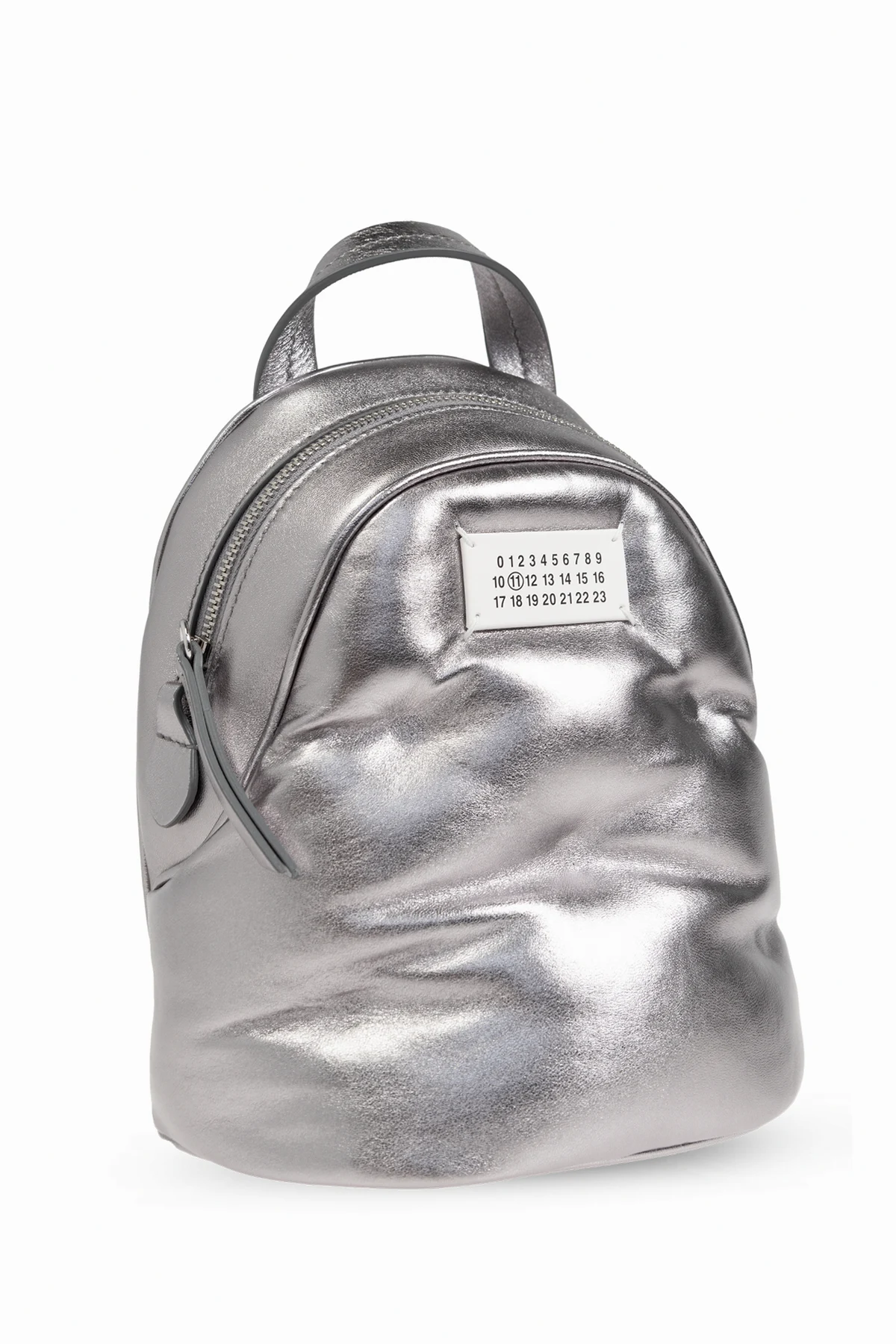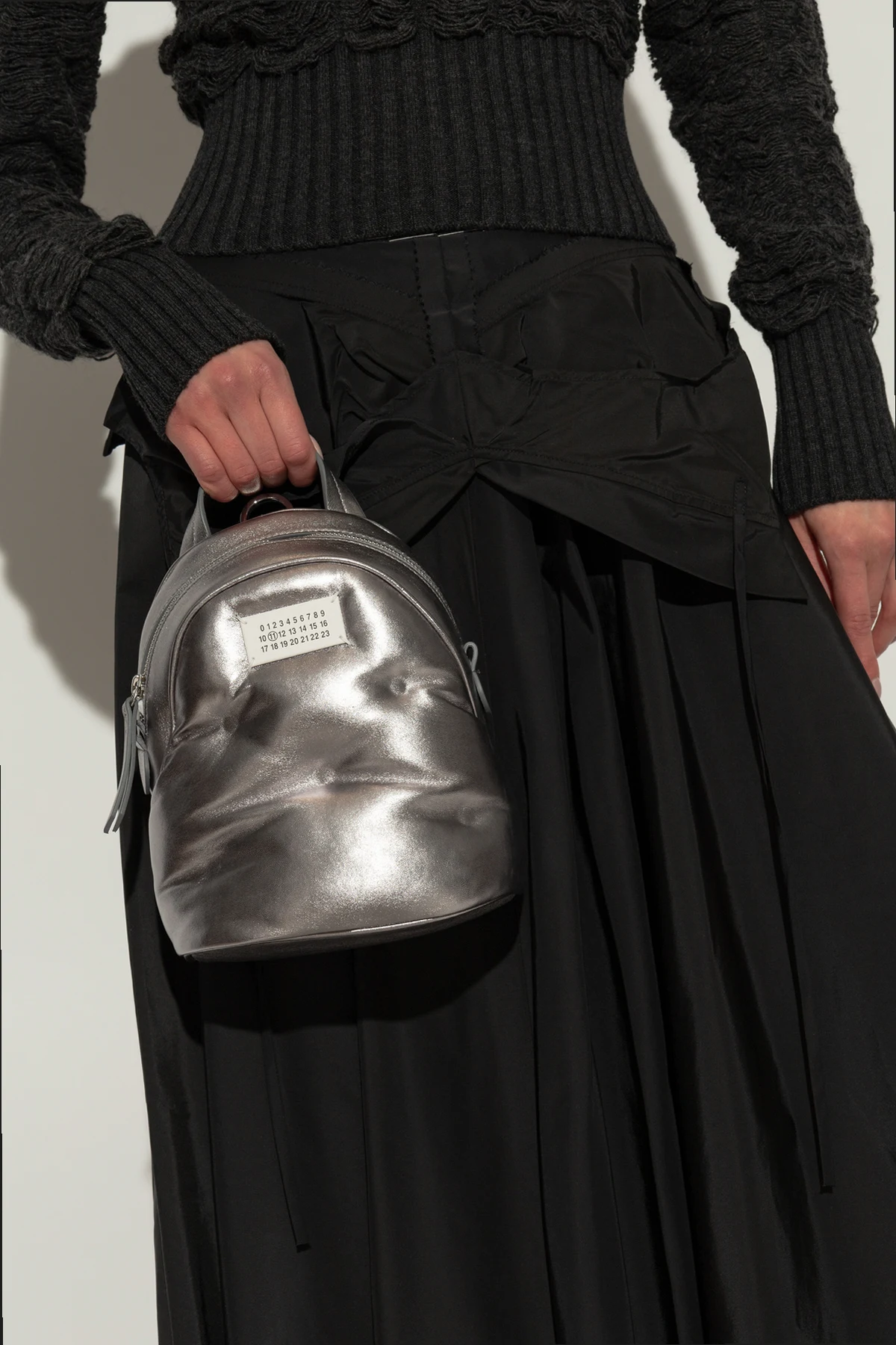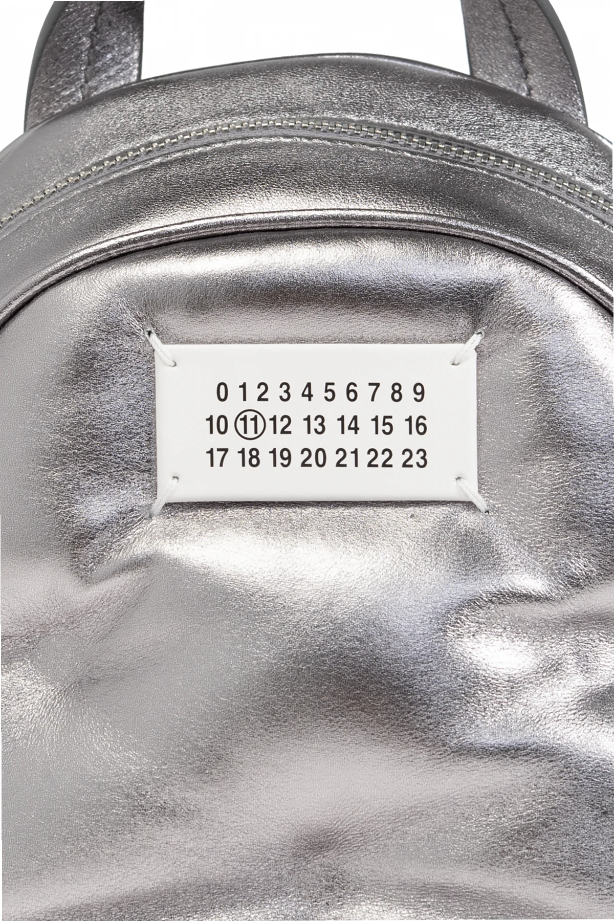 Introducing the Maison Margiela Logo Backpack, an epitome of luxury and contemporary design. This exquisite piece from the renowned fashion house Maison Margiela is a true testament to the brand's commitment to unparalleled craftsmanship and innovative aesthetics. Crafted from 100% premium leather with a striking silver finish, this backpack boasts a classic, rounded silhouette. The front features delicate ruching, adding a textured allure that is both unique and sophisticated. The signature white patch with numbers from 0 to 23, highlighting the number 11, further accentuates its exclusivity. The backpack is adorned with a robust silver zipper and adjustable straps embellished with chains, merging elegance with modernity. Inside, it is lined with a sleek black fabric, proudly displaying the Maison Margiela label and "Made in Italy" inscription. Why Choose This Product? Exquisite Design: Classic rounded shape with unique ruching. Premium Materials: Made from 100% high-quality leather. Signature Details: Iconic Maison Margiela number patch. Modern Elegance: Silver finish with chain-adorned adjustable straps. Functional Luxury: Includes top handle, main compartment, and slip pocket.