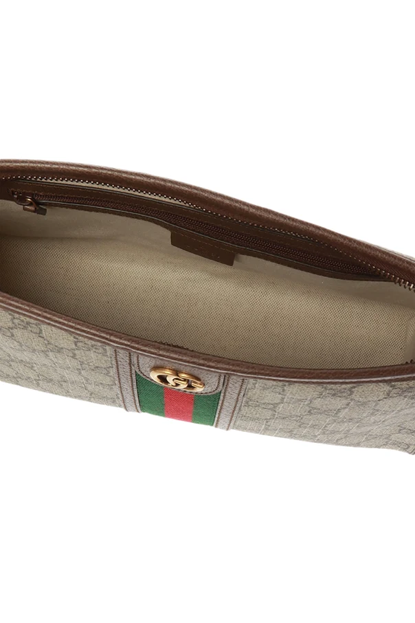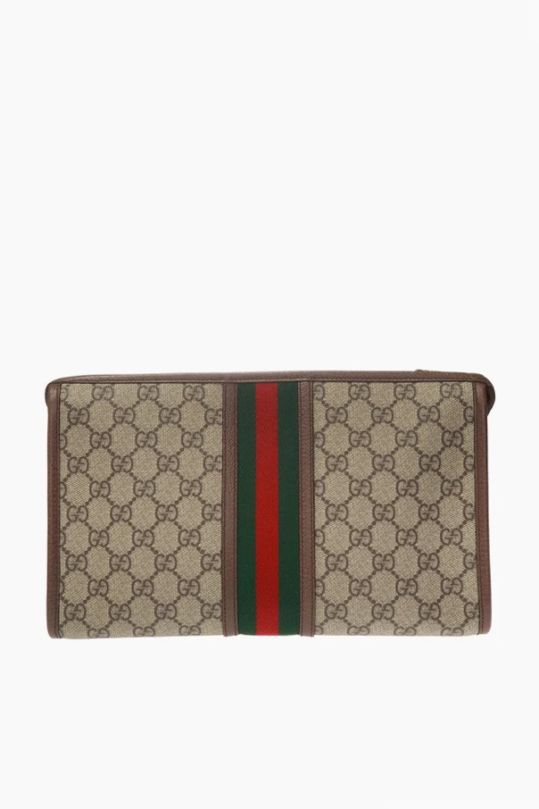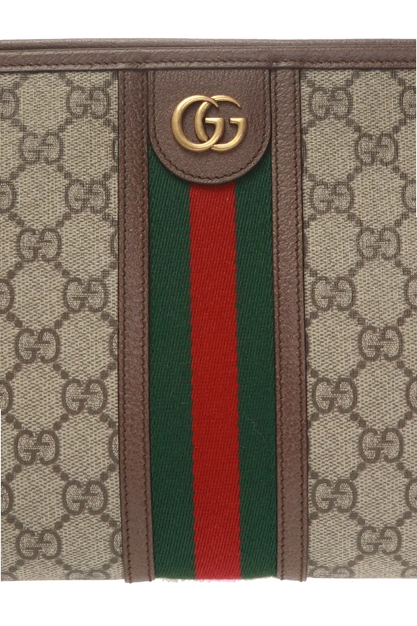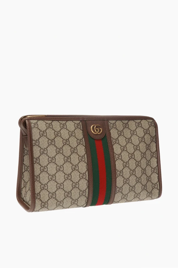 Brown 'Ophidia' clutch from Gucci. Made of ‘GG Supreme’ canvas. Finished with leather trims. Fastened via zip. Embellished with green-red-green ‘Web’ webbing stripe and GG metalware. Interior has one compartment and one zip pocket.