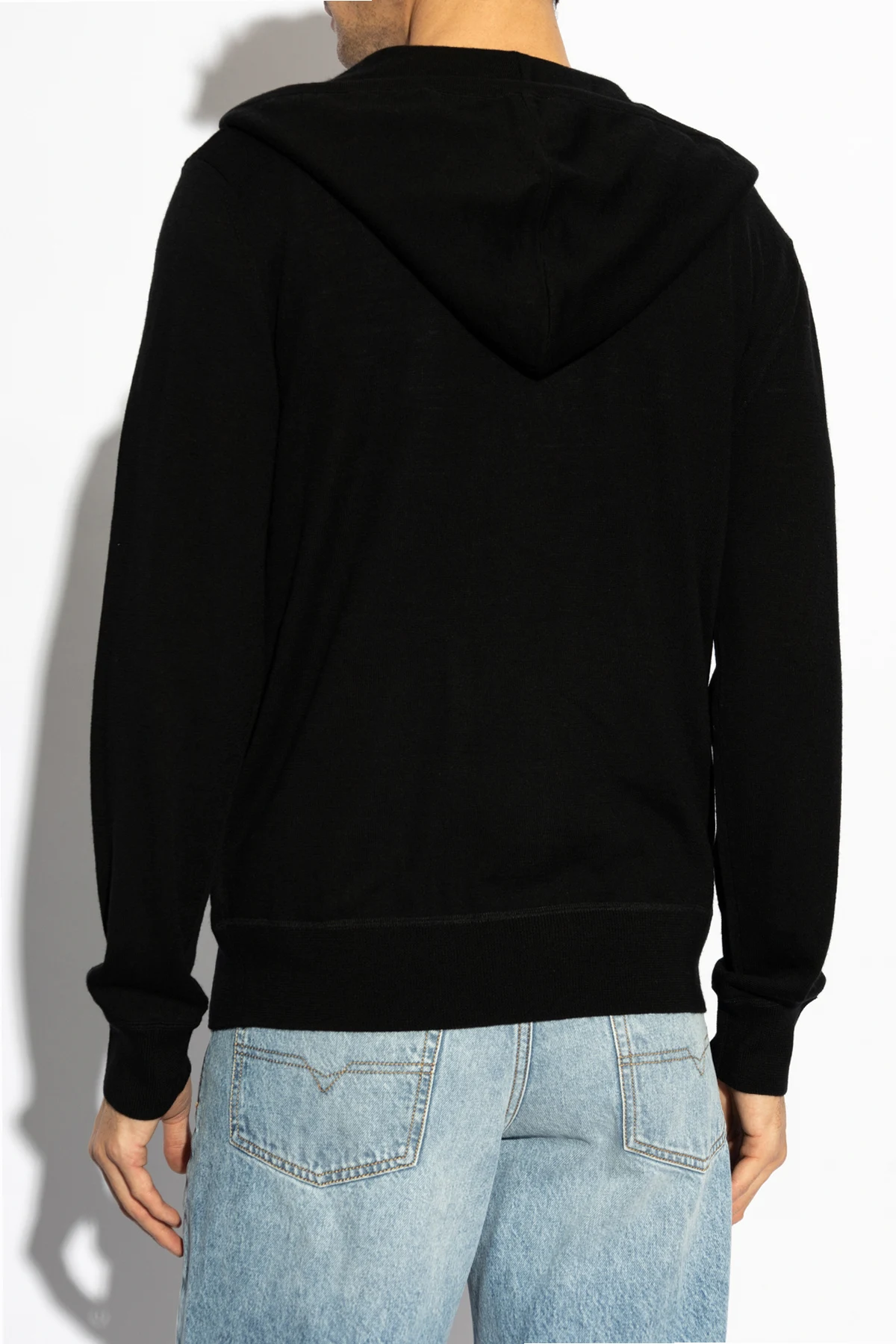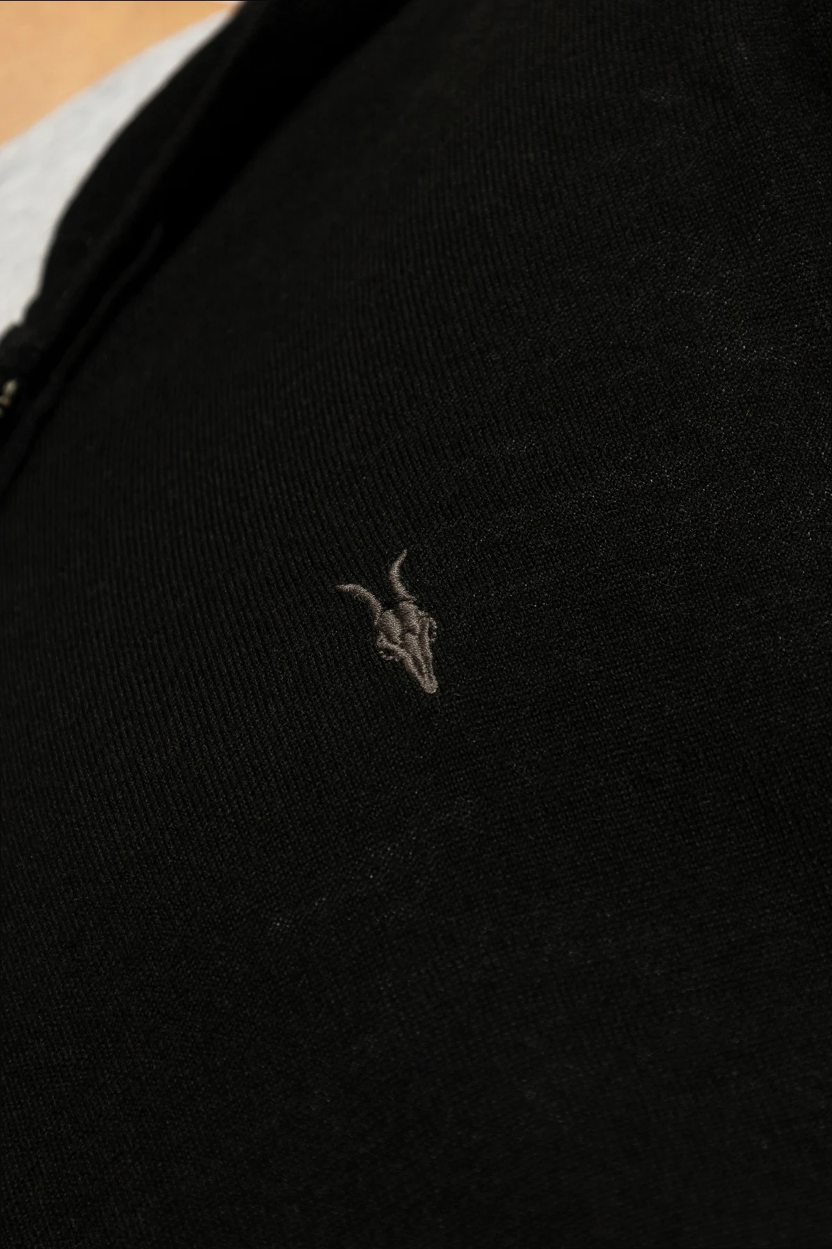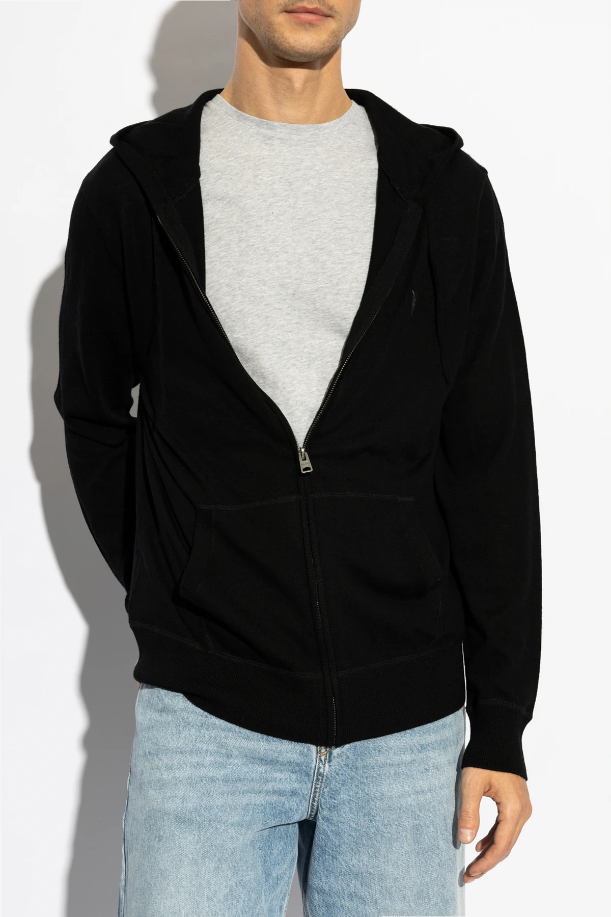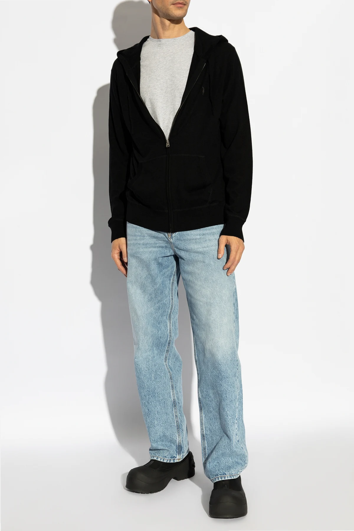 Black 'Mode' wool sweatshirt from AllSaints. Hood with drawstrings. Zip fastening. 2 slip pockets and embroidered dark violet logo at front. Elasticated hem and cuffs.
