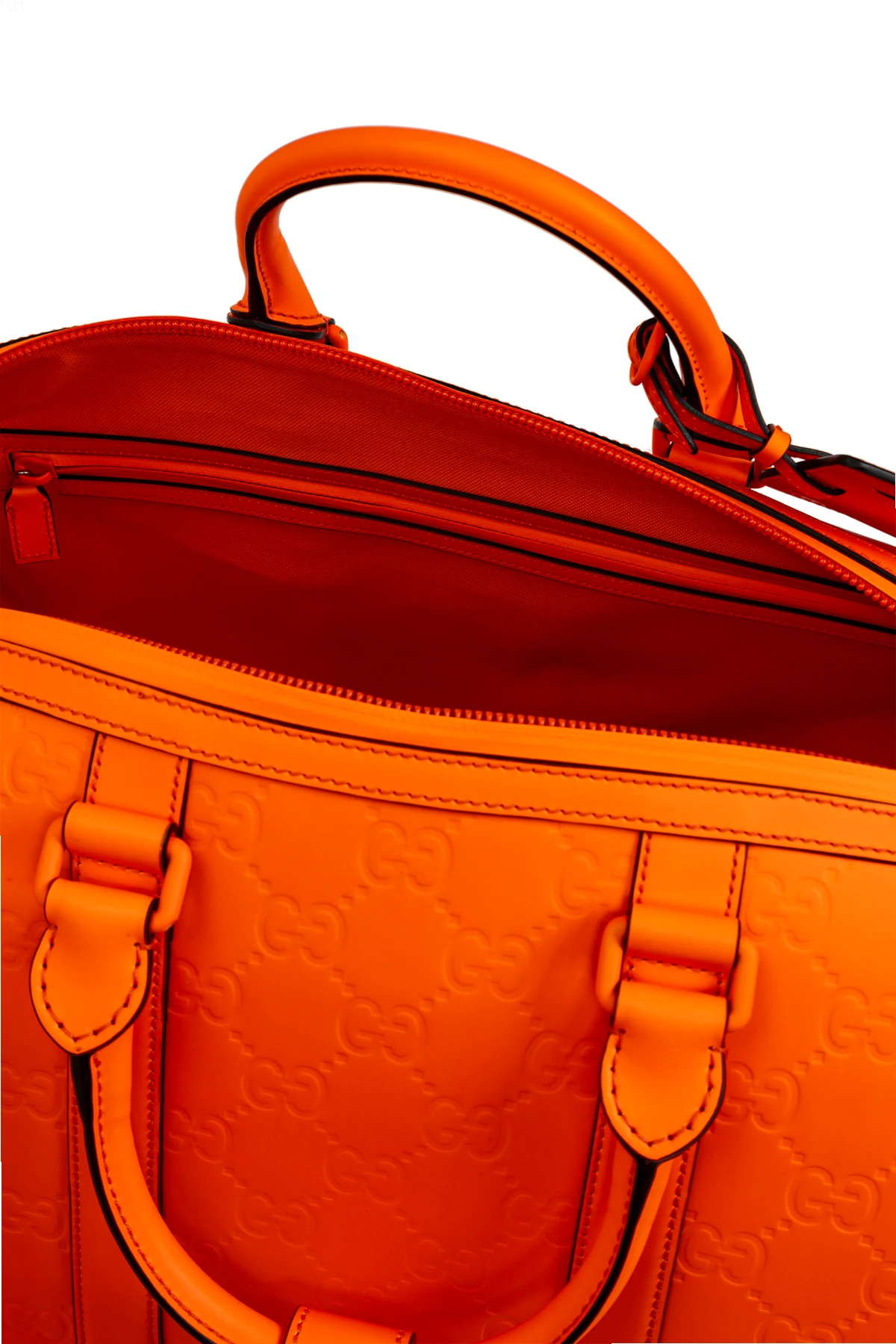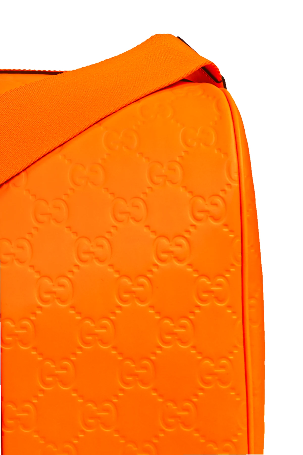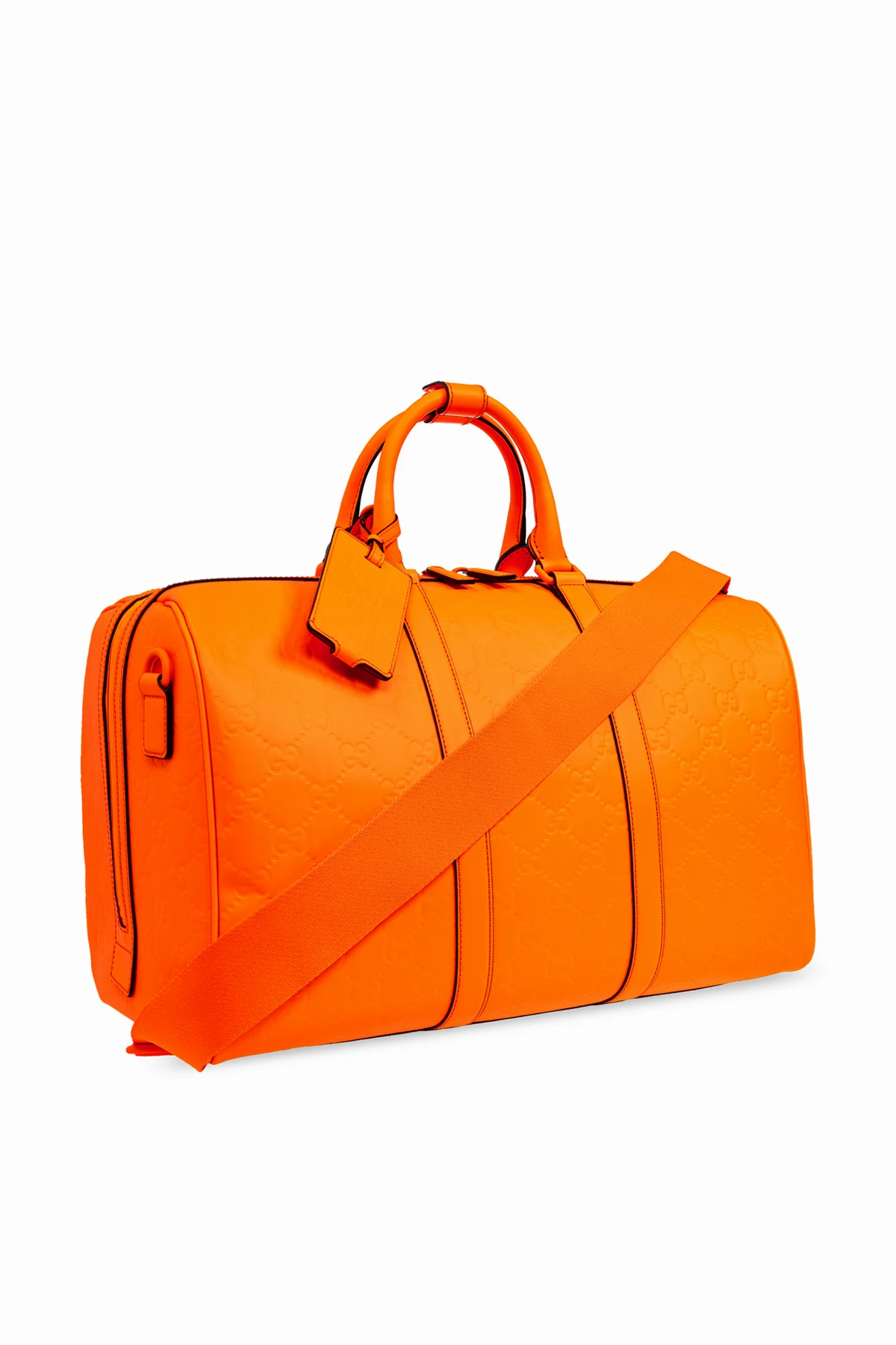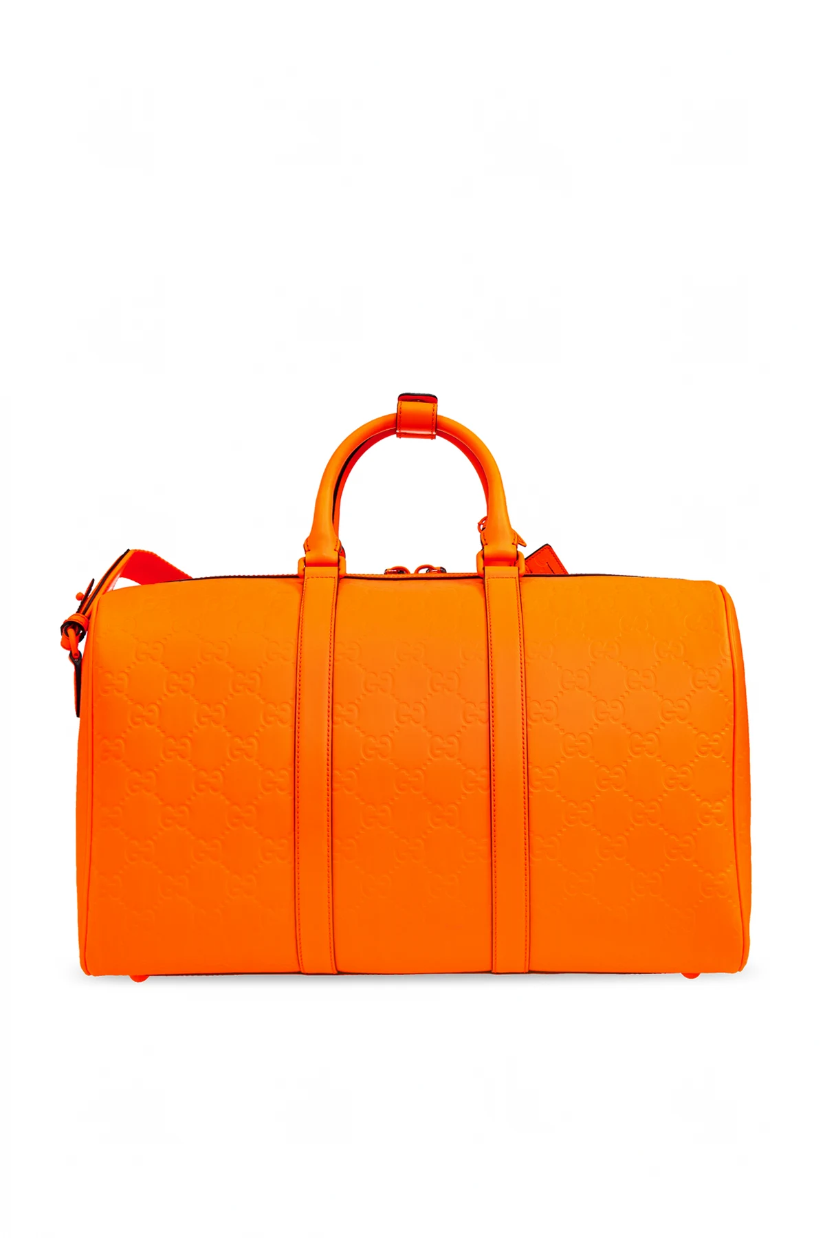 Introducing the 'Duffle Medium' by Gucci, a beacon of luxury for the discerning traveler. Its neon orange hue is not just a color but a statement, making it an undeniably eye-catching accessory. Crafted from the finest calf leather enveloped in a protective rubber coating, this duffle bag marries durability with high-end fashion sensibilities. The bag's classic rectangular silhouette with rounded corners exudes softness and elegance, while the omnipresent designer logo pattern injects a dose of luxury. Its high-quality leather material and detailed craftsmanship are what you would expect from an exclusive brand like Gucci. The bag is equipped with two sturdy handles, complemented by a detachable and adjustable shoulder strap, enhancing its versatility. A distinctive brand identifier hangs gracefully from one of the handles, adding to its charm. Functionality meets style with the bag's spacious main compartment, secured by a robust bi-directional zipper. Inside, you will find a meticulously organized interior featuring two zippered pockets, perfect for safeguarding your essentials. Side straps offer the option to adjust the bag's width or serve as an additional decorative touch. Why Purchase This Product? Exceptional quality and durability, thanks to its calf leather construction with a rubber coating. Stunning neon orange color that stands out, making a bold fashion statement. Practical design with a spacious interior and secure zippered pockets. Adjustable and detachable shoulder strap for versatile carrying options. Signature Gucci design elements, including a distinctive logo pattern and brand identifier charm.
