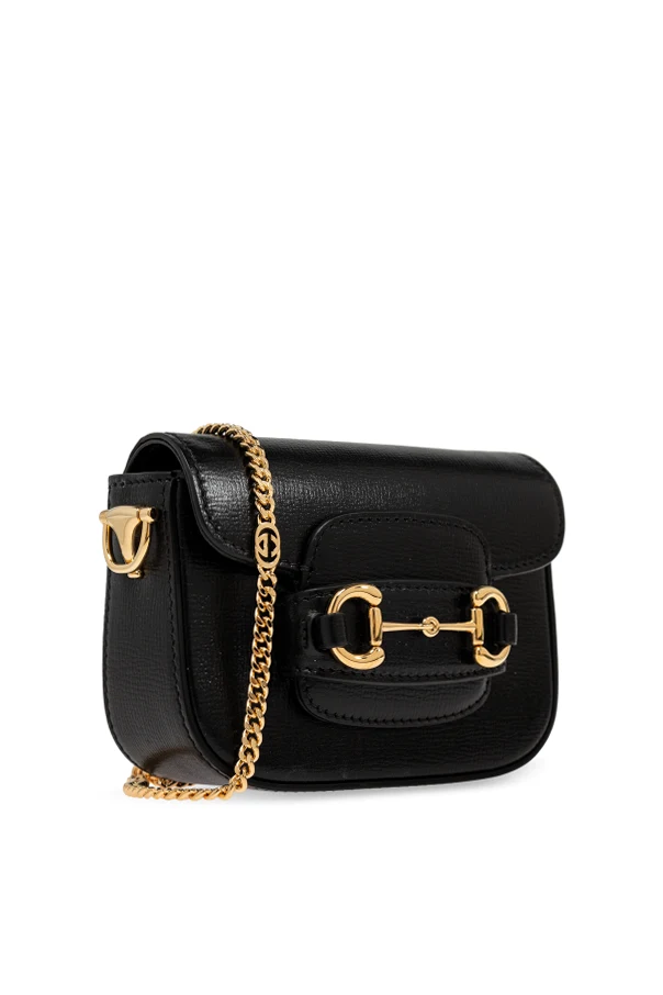 Presenting the exclusive Horsebit 1955 Super Mini Shoulder Bag by the renowned designer Gucci . This exquisite accessory encapsulates the epitome of luxury and timeless elegance. Crafted from premium black leather with a delicate texture, the bag boasts a compact, rectangular silhouette with gracefully rounded corners. Its minimalist design is complemented by the iconic gold horsebit hardware on the front, a signature of this model, and a luxurious gold chain strap that exudes sophistication. The interior is lined with a light-hued material, either suede or microfiber, providing a soft and protective environment for your essentials. Despite its super mini size, it features a main compartment and a card slot, making it perfect for carrying your phone, keys, and a small wallet. Under the creative direction of creative director , Gucci has redefined luxury with a modern twist, embracing a bold and eclectic aesthetic. The Horsebit 1955 Super Mini Shoulder Bag is a testament to this vision, seamlessly blending innovation with impeccable Italian craftsmanship. Why Buy This Product? Exquisite design with iconic gold horsebit hardware High-quality black leather construction Luxurious gold chain strap for added elegance Compact and functional interior with a card slot Authentic Gucci logo on the chain