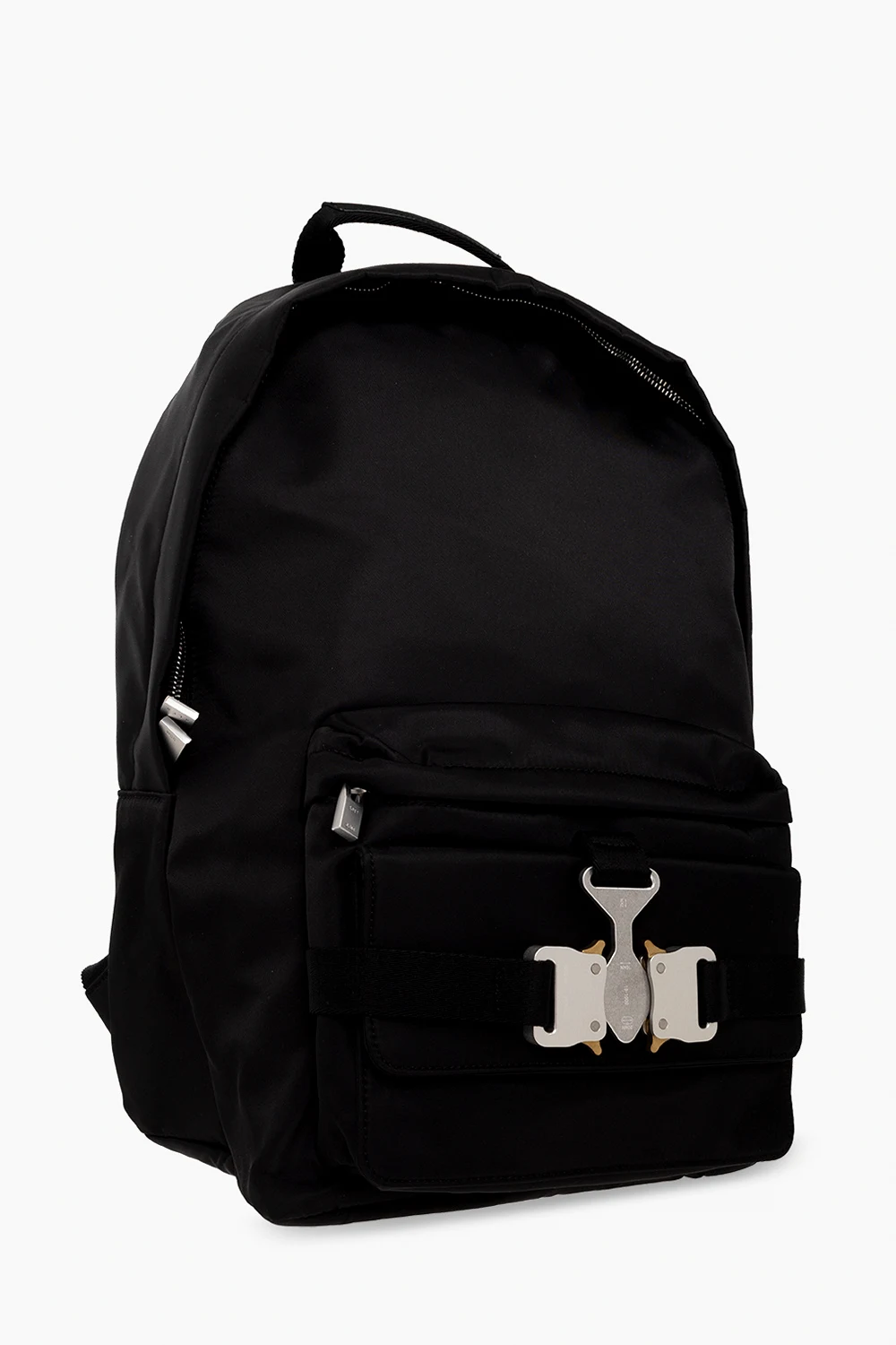 Black backpack from 1017 ALYX 9SM. Made of nylon with leather trims, this model features a two-way zip, front zip pocket, flap pocket, half-round handle, adjustable shoulder straps, silver-tone and gold-tone Rollercoaster buckle as well as one internal compartment with two slip pockets.