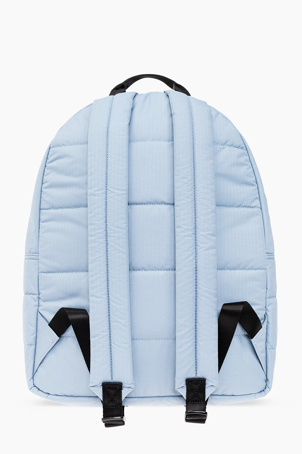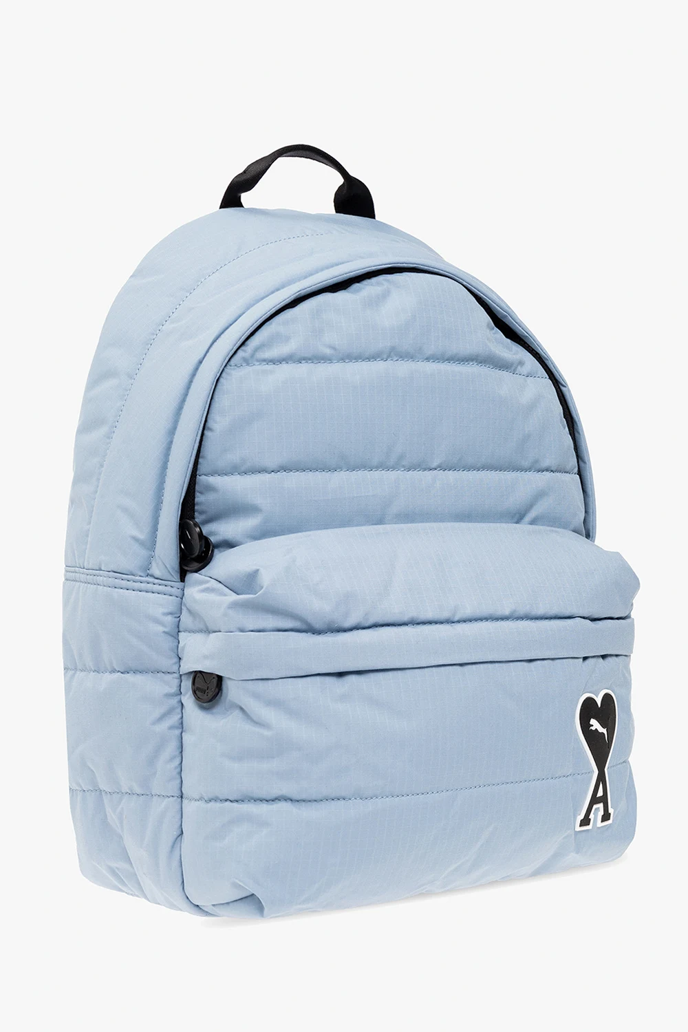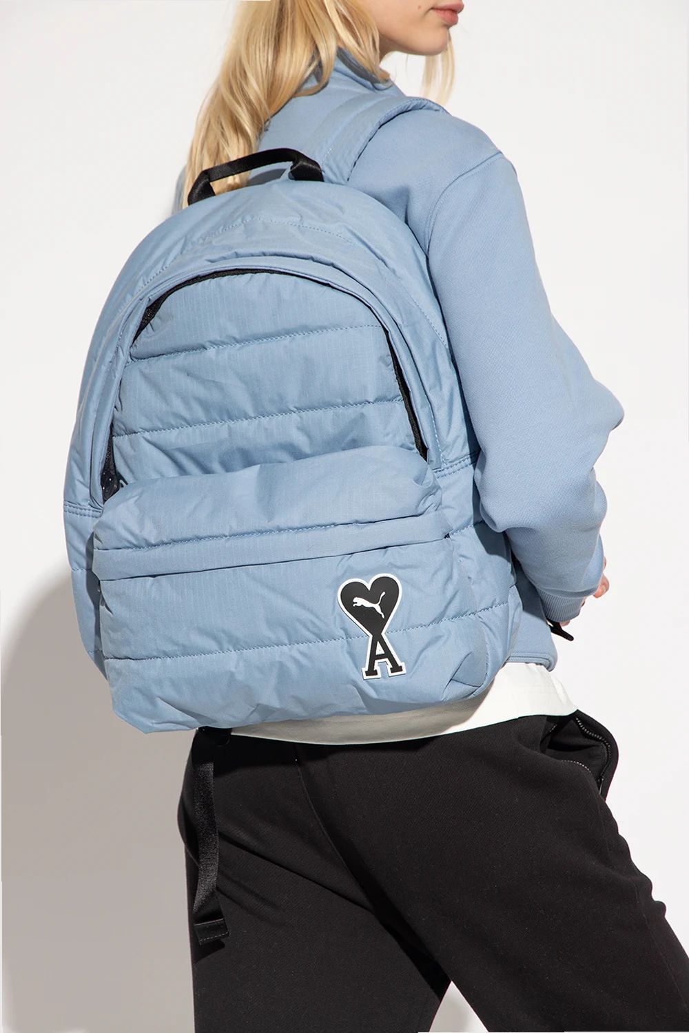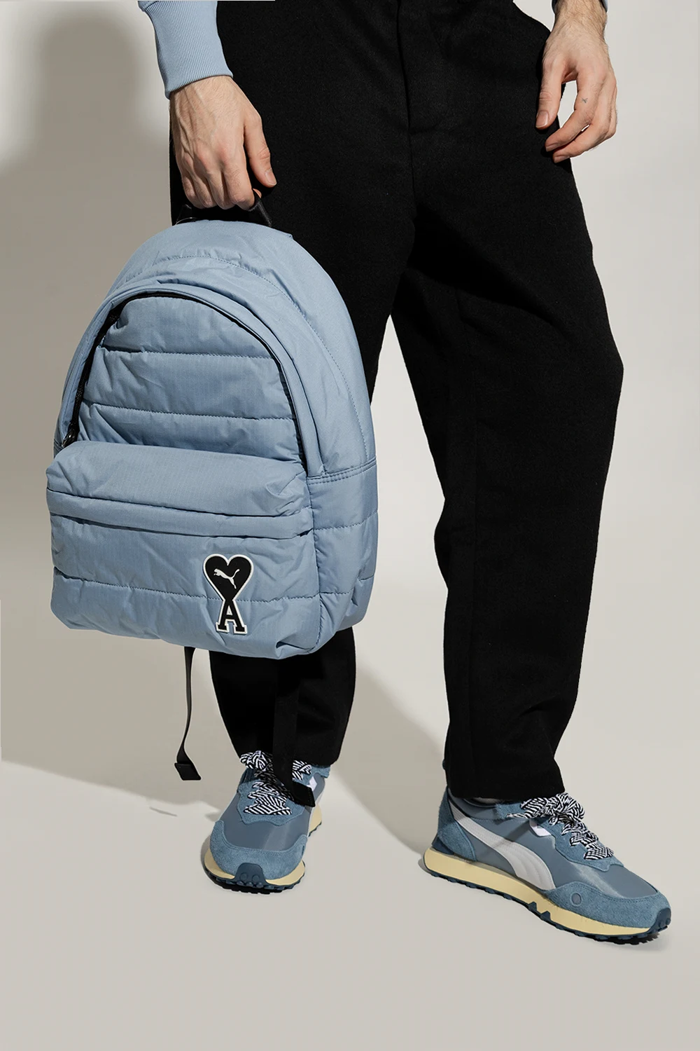 Blue quilted backpack from PUMA x AMI. Boasting a white and black patch which is a hybrid of the brands' ‘PUMA Cat’ and ‘Ami de Cur’ logo motifs, this design features a two-way zip fastening, a zip pocket on the front, a top handle, adjustable shoulder straps and one internal compartment with one slip pocket and one zip pocket.