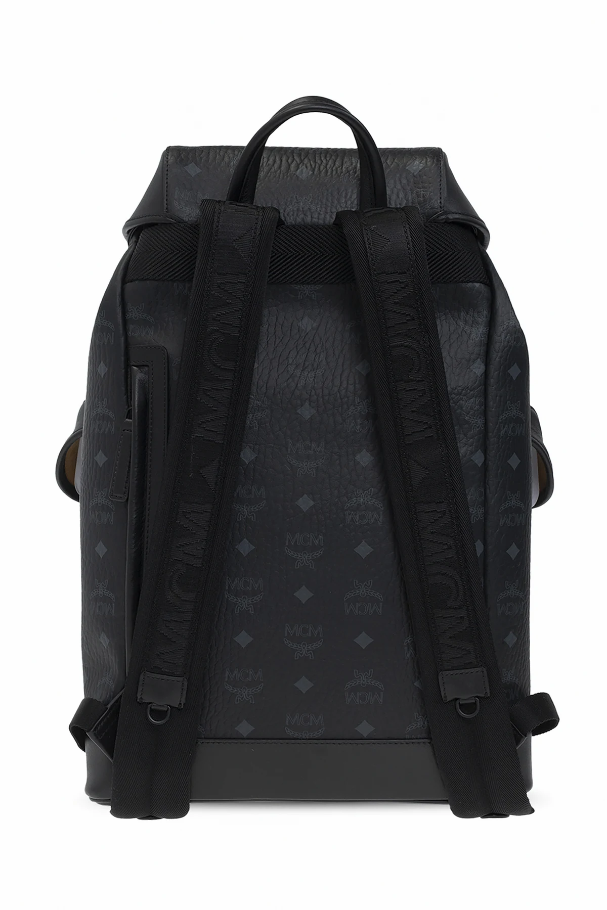 Black ’Brandenburg’ backpack from MCM. Made of faux leather with the Visetos pattern in dark grey, this model fastens with a clip, drawstrings and snaps with a logo. It is complete with a logo appliqué, back zip pocket, two flap pockets with magnetic closure, back zip pocket, half-round handle, two adjustable shoulder straps, black metal hardware with a matte finish and one internal compartment with light brown faux suede lining and one zip pocket.