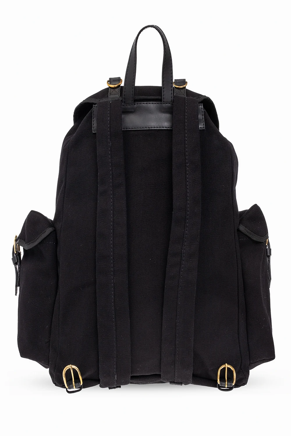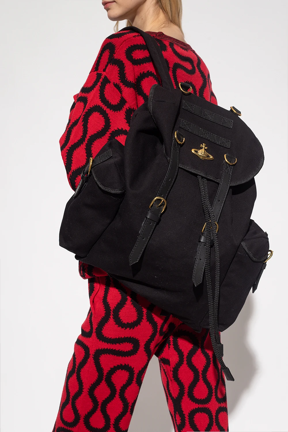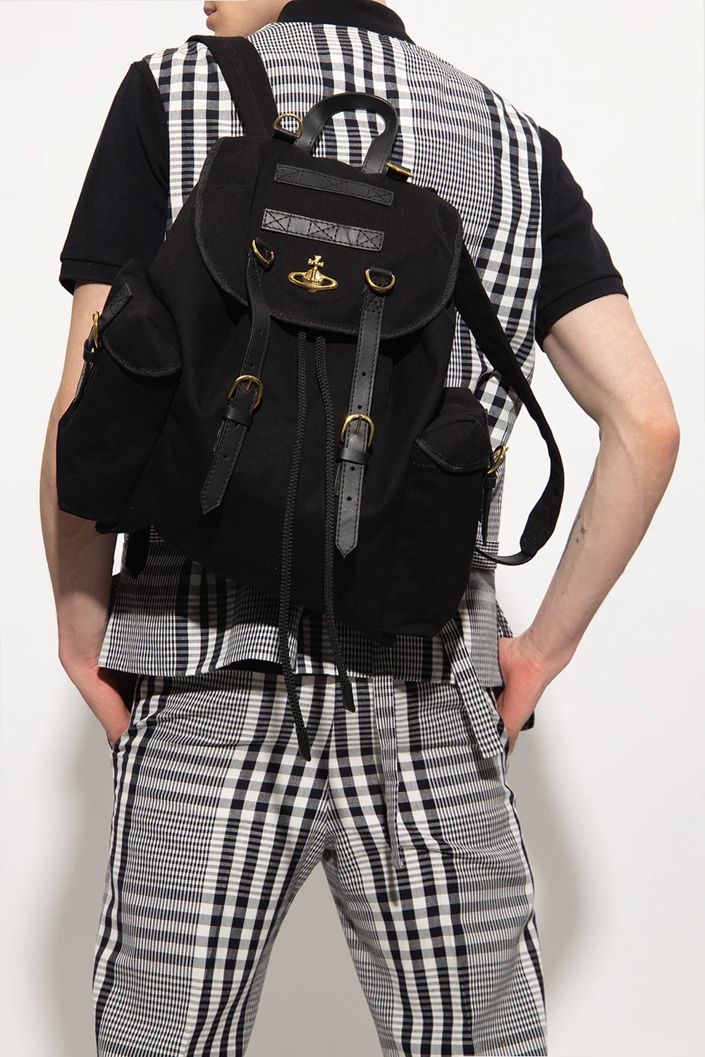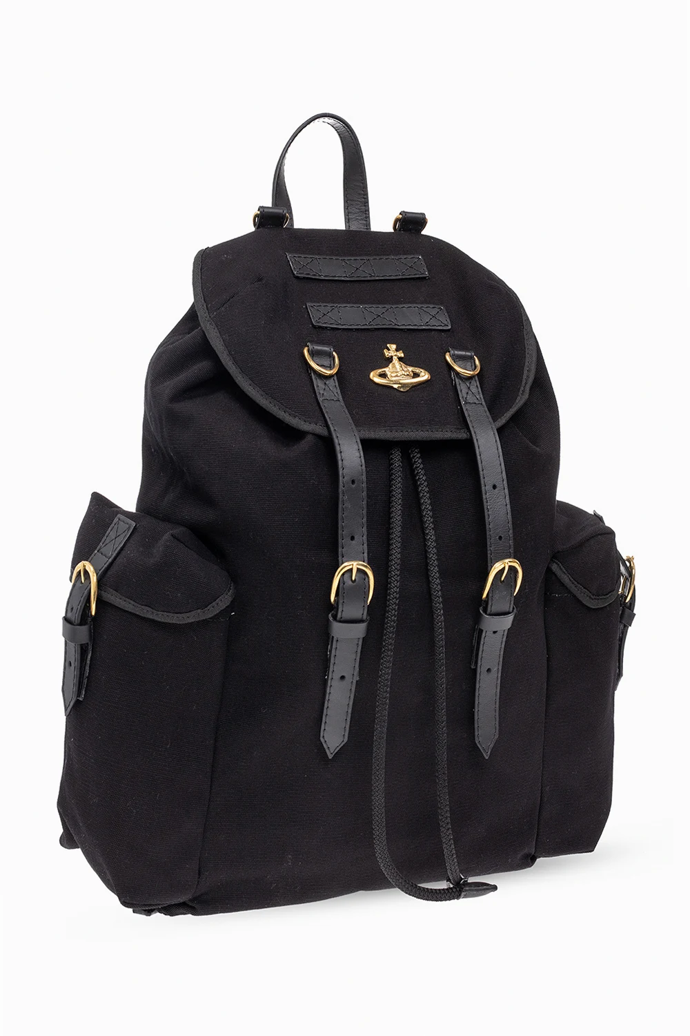 Black ‘Highland’ backpack from Vivienne Westwood. Made of locally farmed cotton canvas, this design forms part of the brand's ‘Made in Kenya’ collection with the ‘Ethical Fashion Initiative’ that helps to support thousands of people from marginalised communities. It cinches closed with drawstrings and features leather and recycled brass trims, two buckle strap closures, a logo plaque on the front, two side pockets with buckles, a top handle, adjustable shoulder straps, antiqued gold-tone metal hardware and one internal compartment with a zip pocket.