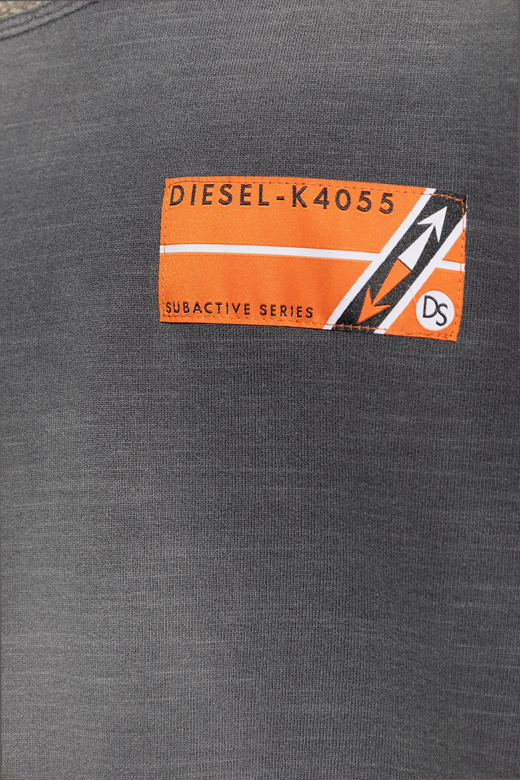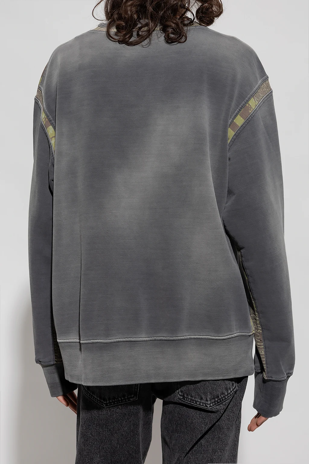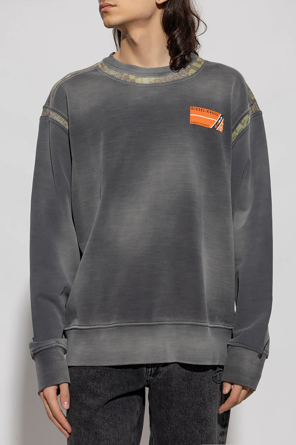 Grey 'S-MACSINDI' crewneck sweatshirt from Diesel. Crafted from cotton jersey with a vintage effect, this style features a loose-fitting silhouette, an orange logo patch, green inserts, long sleeves and ribbed trims on the edges.