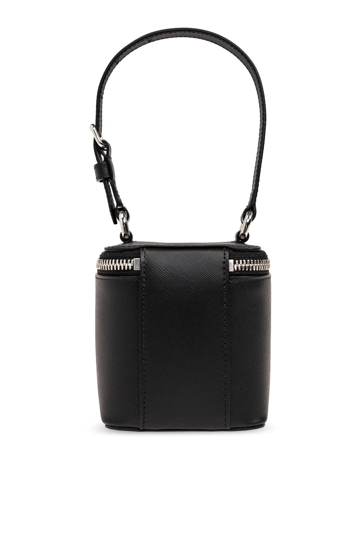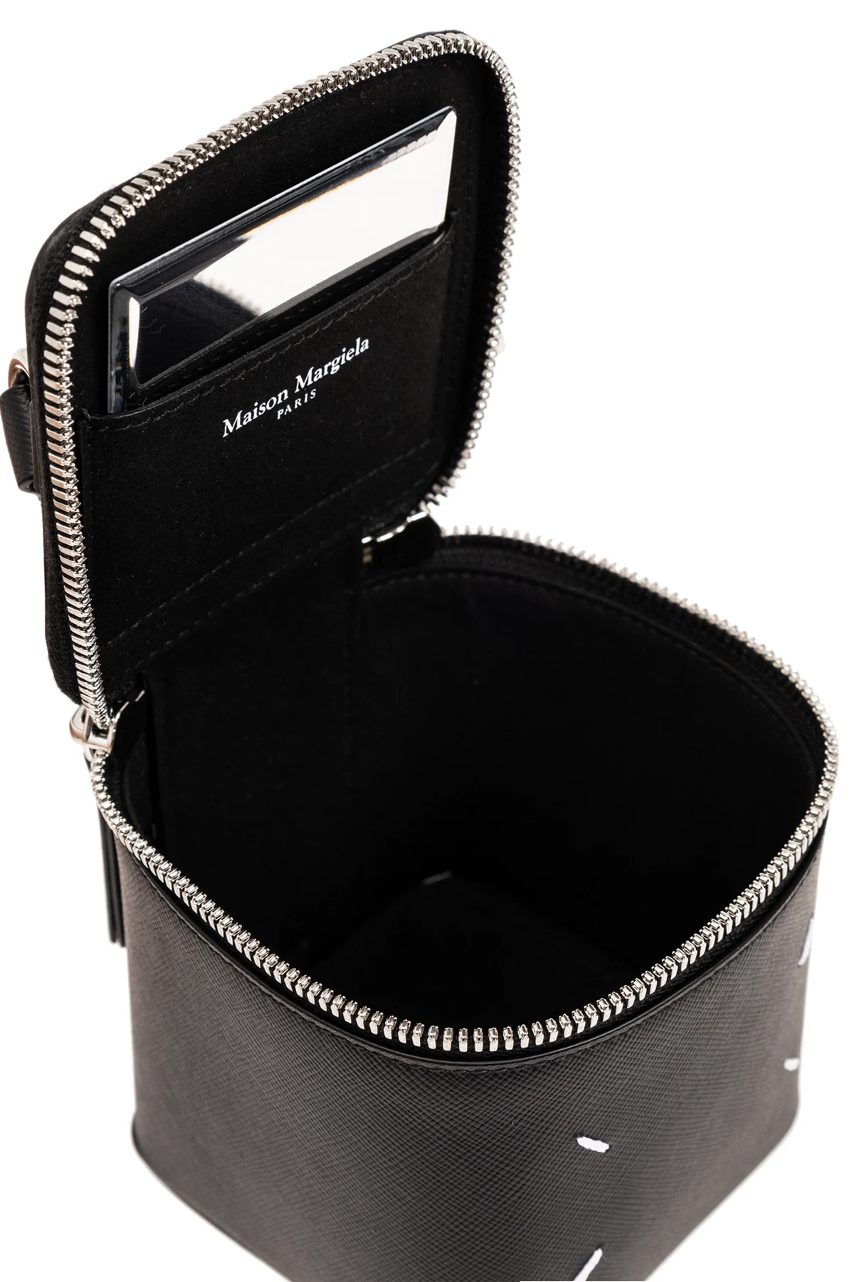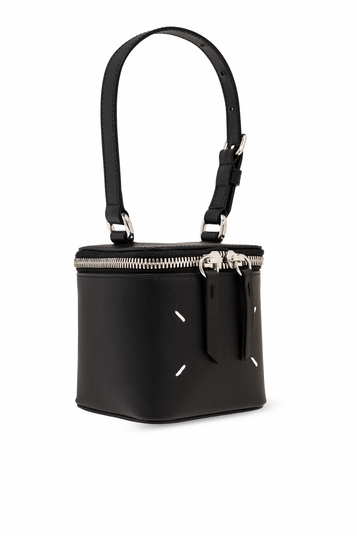Introducing the pinnacle of modern luxury, the 'Box Bag Mini' by Maison Margiela. Crafted with meticulous precision, this petite, hand-held treasure is enveloped in the finest grainy calfskin leather, rendering it both sumptuous to the touch and resilient for everyday use. Its sleek black hue is accentuated with striking white horizontal lines, a testament to the brand's keen eye for detail and a subtle nod to the designer's signature aesthetic. The bag's silhouette, a rectangular box with softly rounded corners, exudes elegance while ensuring practicality. Its top is secured with a silver-toned metal zipper, complemented by dual leather tabs for effortless accessibility. The beauty of this masterpiece lies not only in its external allure but also in its functional interior, featuring a single open pocket against a black backdrop, and a metal plaque bearing the Maison Margiela insignia, a hallmark of exclusivity and authenticity. An adjustable, detachable shoulder strap offers versatile carrying options, transforming the piece to suit your style whims. Whether donned on the shoulder for a casual day out or held in hand for an evening affair, the 'Box Bag Mini' adapts with grace. Why Purchase This Product? Exquisite craftsmanship from high-quality grainy calfskin leather. Elegant, minimalist design with distinctive white stitching detail. Versatile carrying options with an adjustable, detachable strap. Exclusive Maison Margiela design with branded metal plaque. Functional elegance with a secure zip closure and an organized interior.