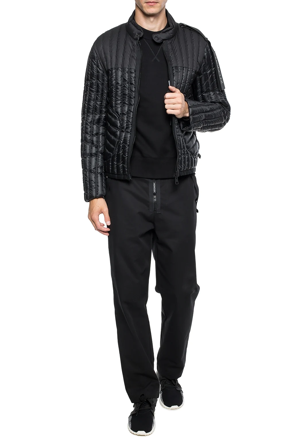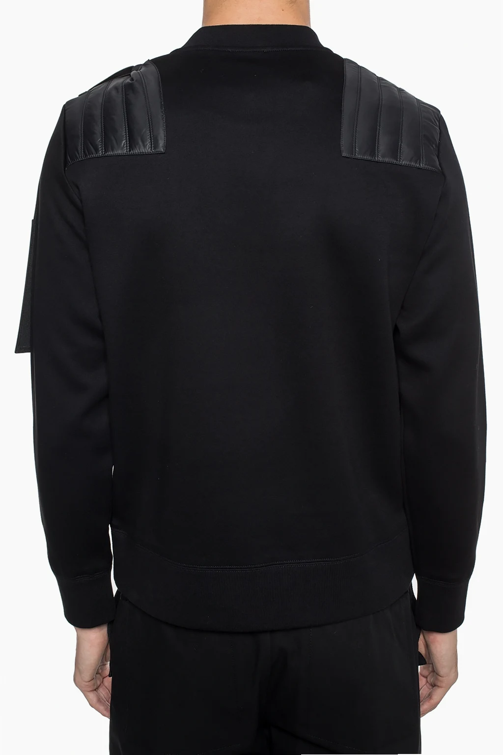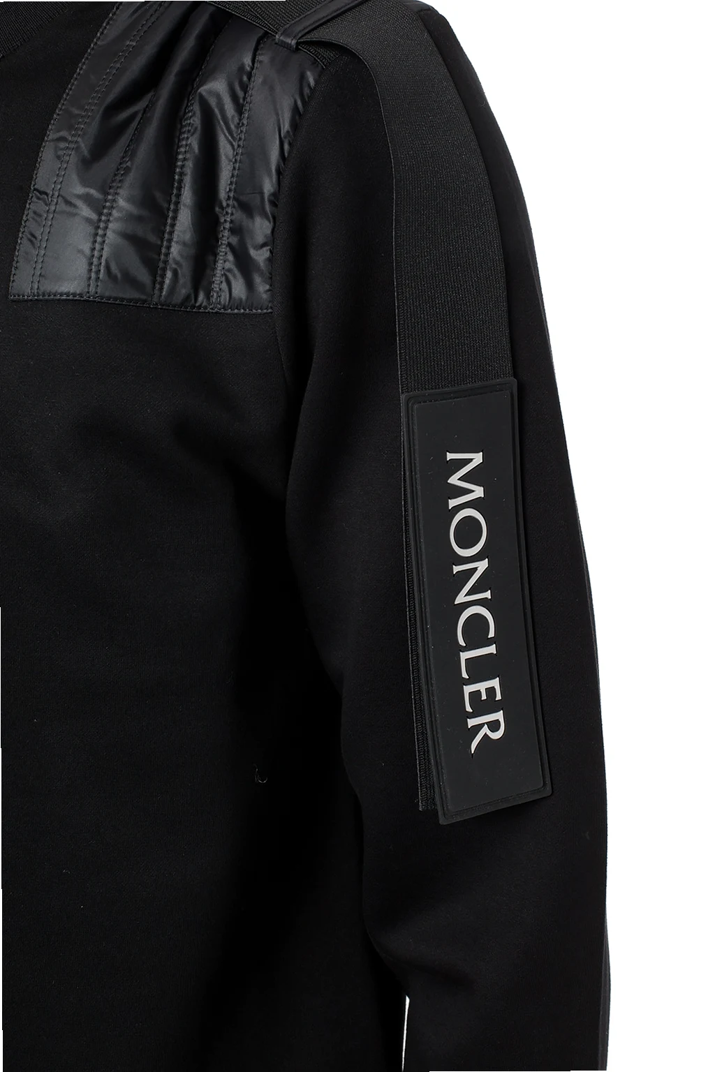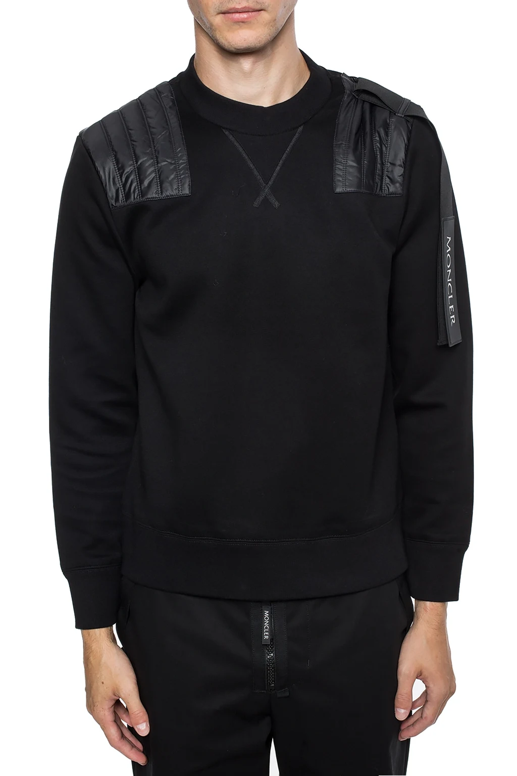 Black, cotton sweatshirt from Moncler Genius, 'CRAIG GREEN' collection. Decorated with quilted inserts and a sewn-in stripe including an application with an embossed logo in grey and white. Long sleeves. Crew neckline. Bottom and sleeves finished with welts.