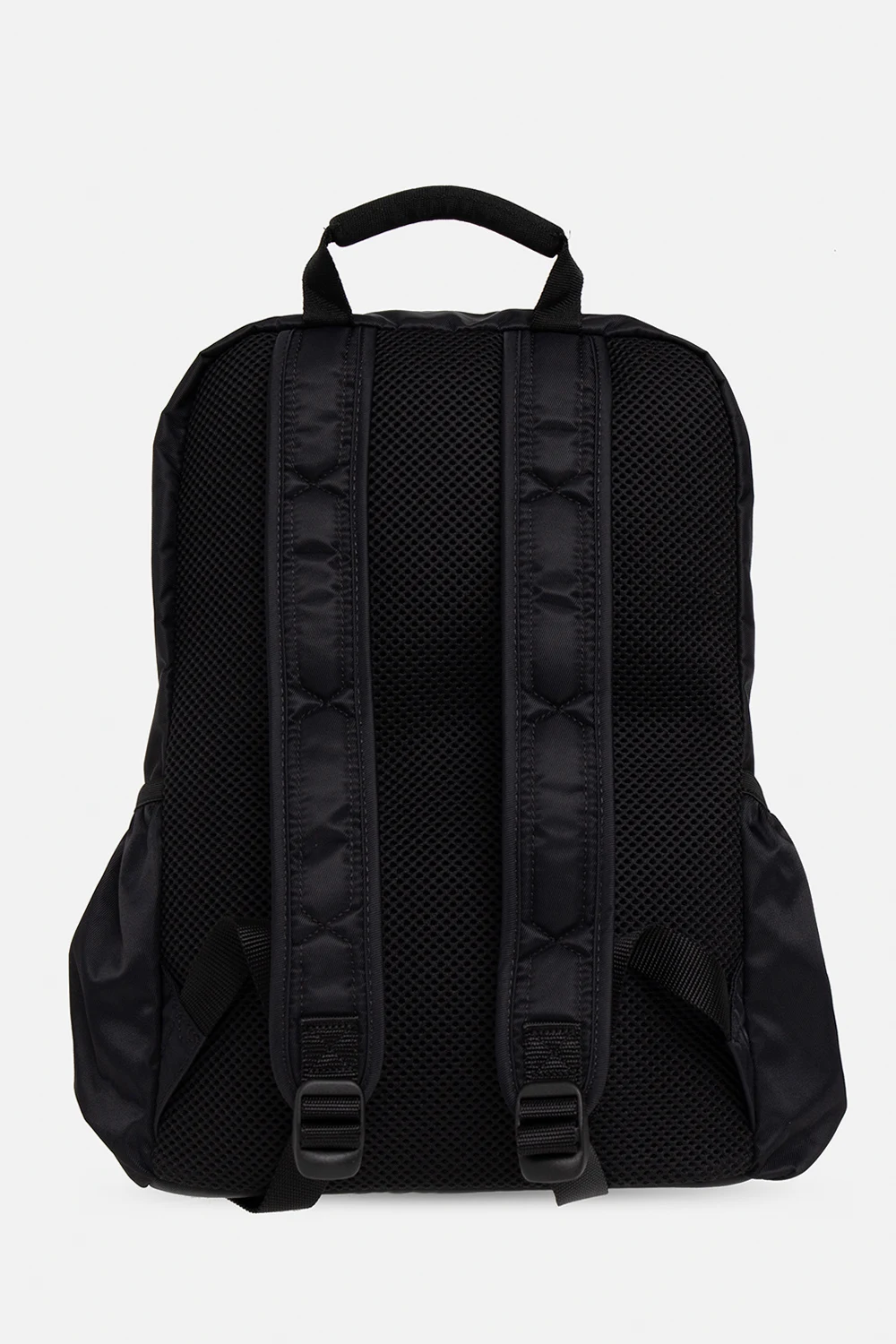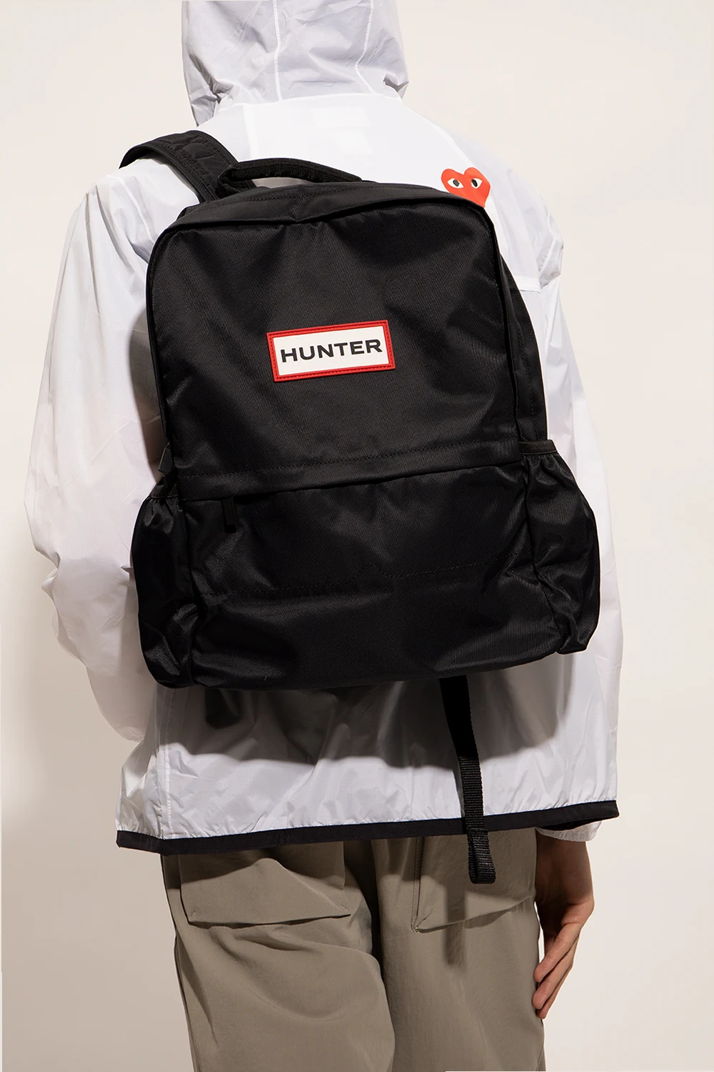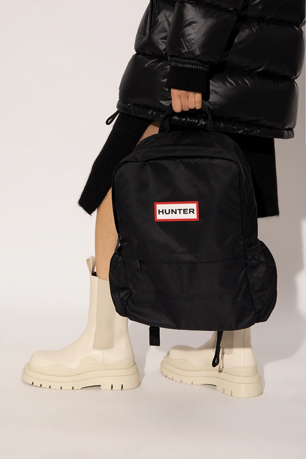 Black backpack from Hunter. Made of recycled fabric, this model is complete with a two-way zip, logo patch in white and red, half-round handle, two slip pockets, one zip pocket, adjustable shoulder straps, black metal hardware and one internal compartment with one slip pocket.